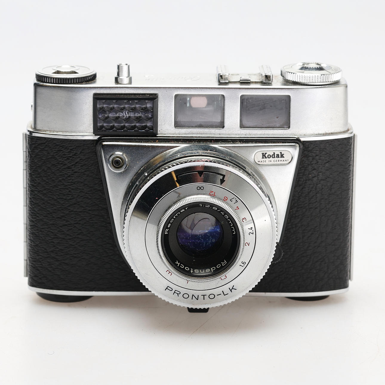Kodak Retinette 1B med objektiv Rodenstock Reomar 45 mm f/2.8. Original läderfodral samt motljusskydd.