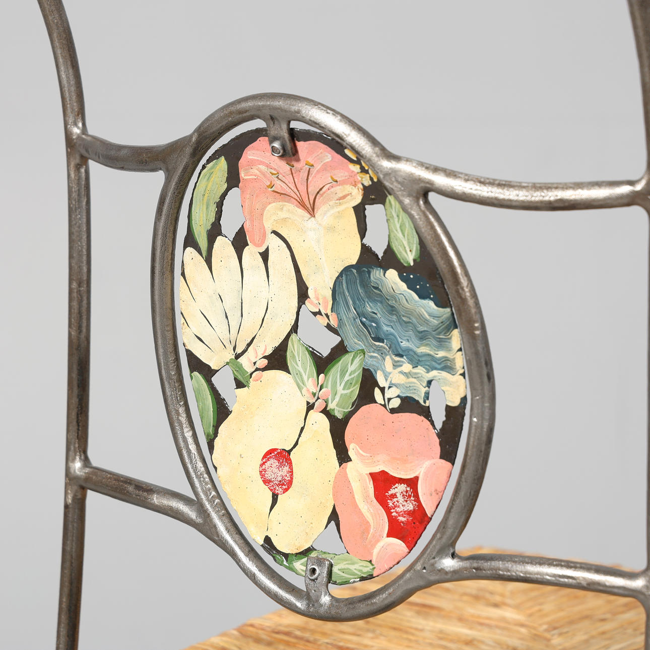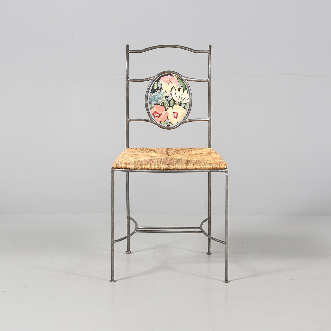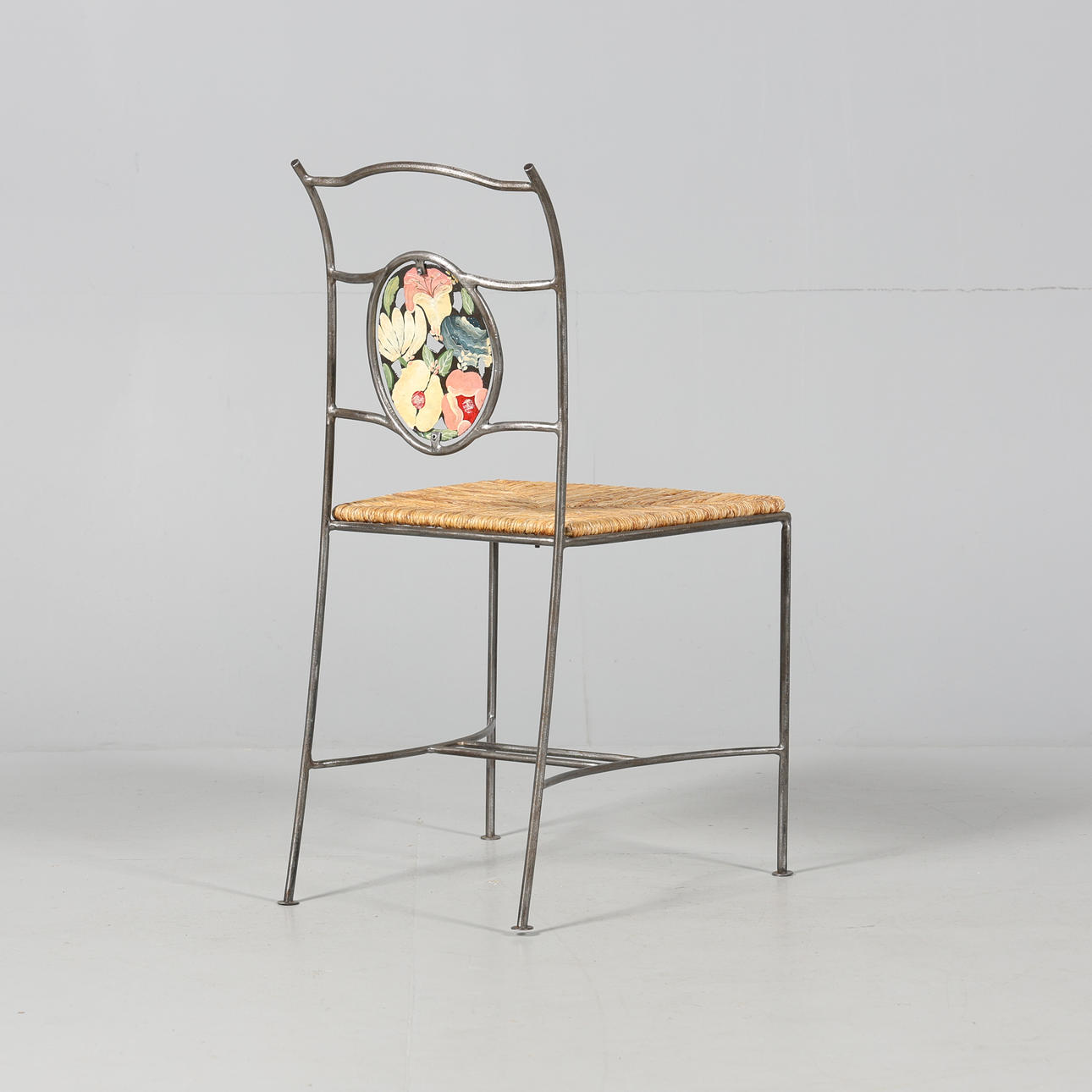 4930152. STOL, smide samt flätad sits, bemålad ryggtavla.