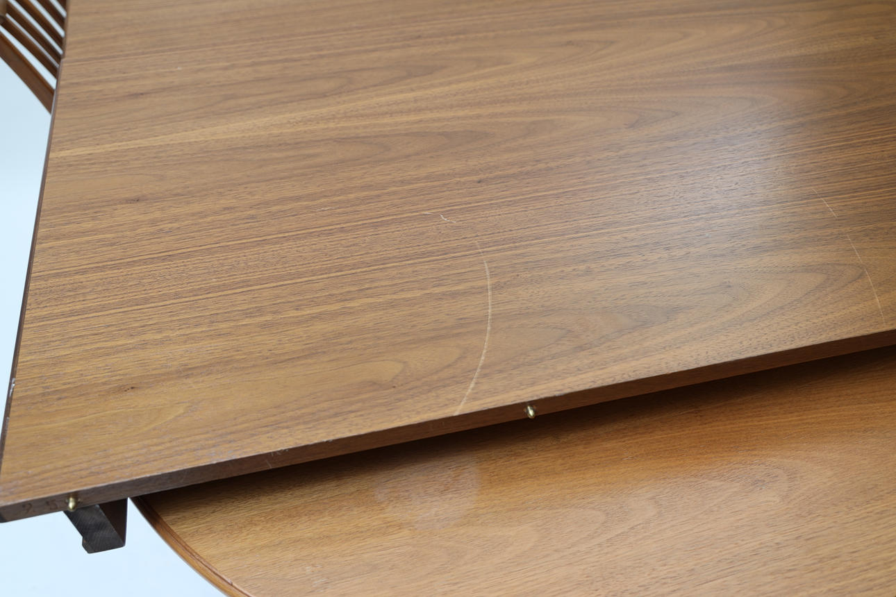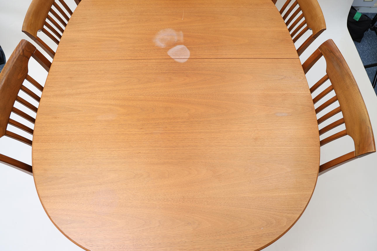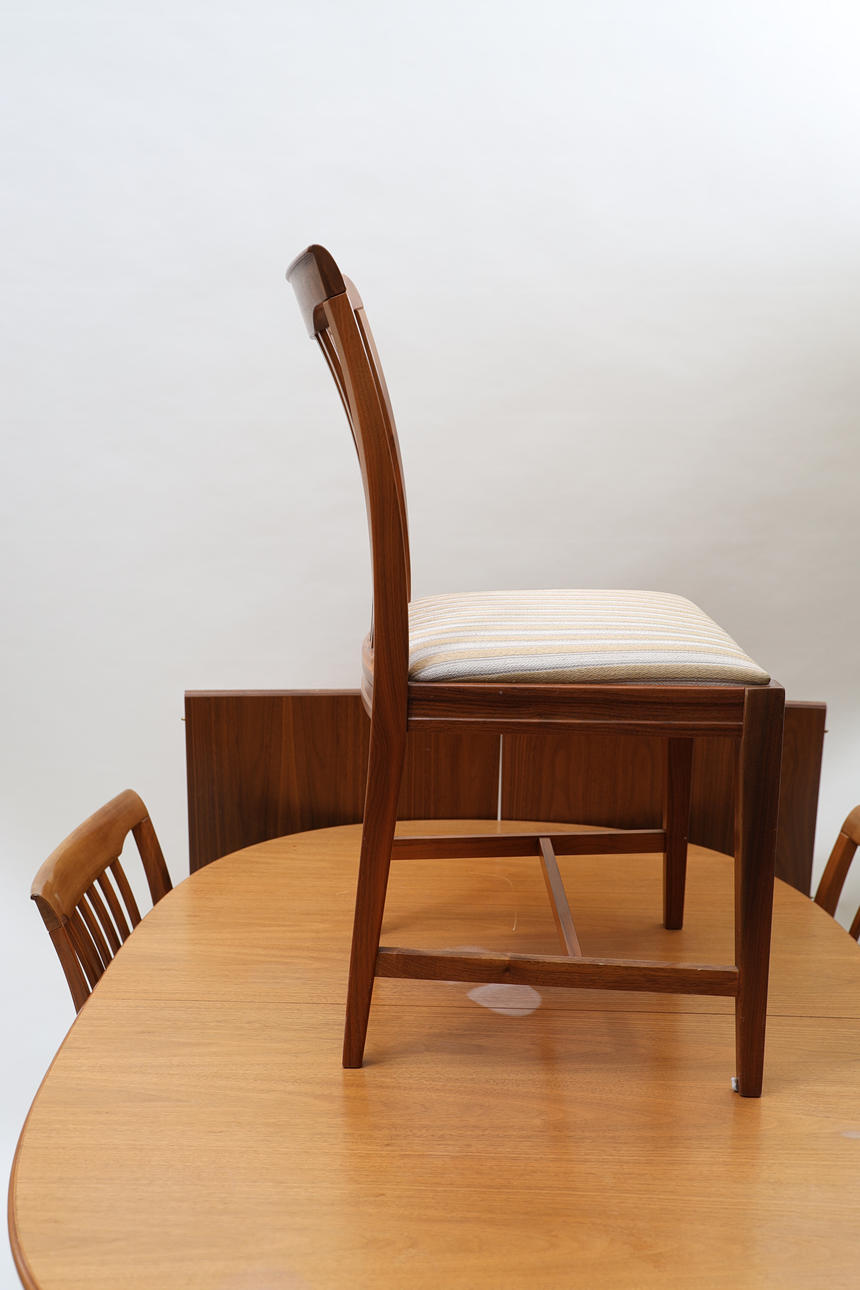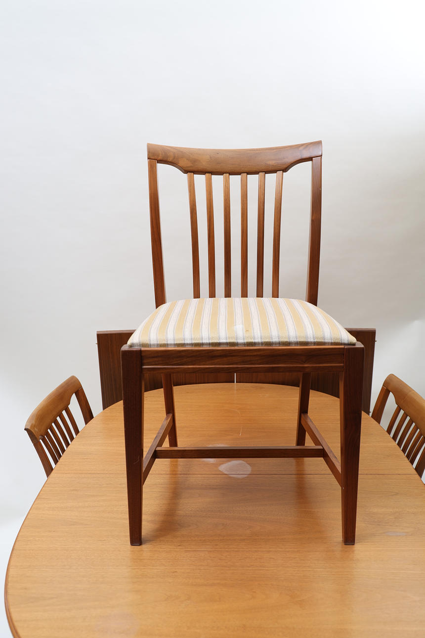 Valnöt. 4st stolar, bord samt 2st iläggsskivor á 50cm varav en med sarg.