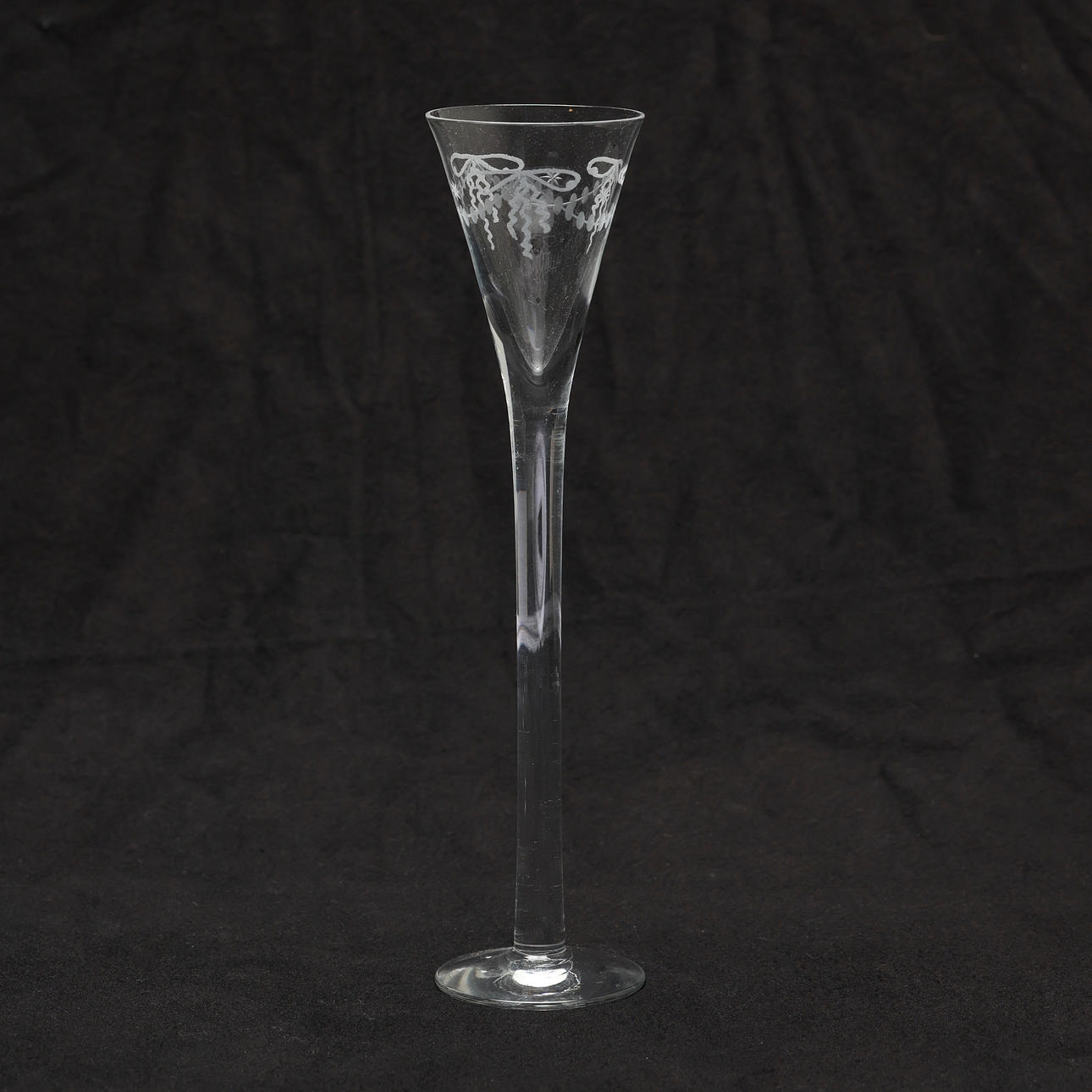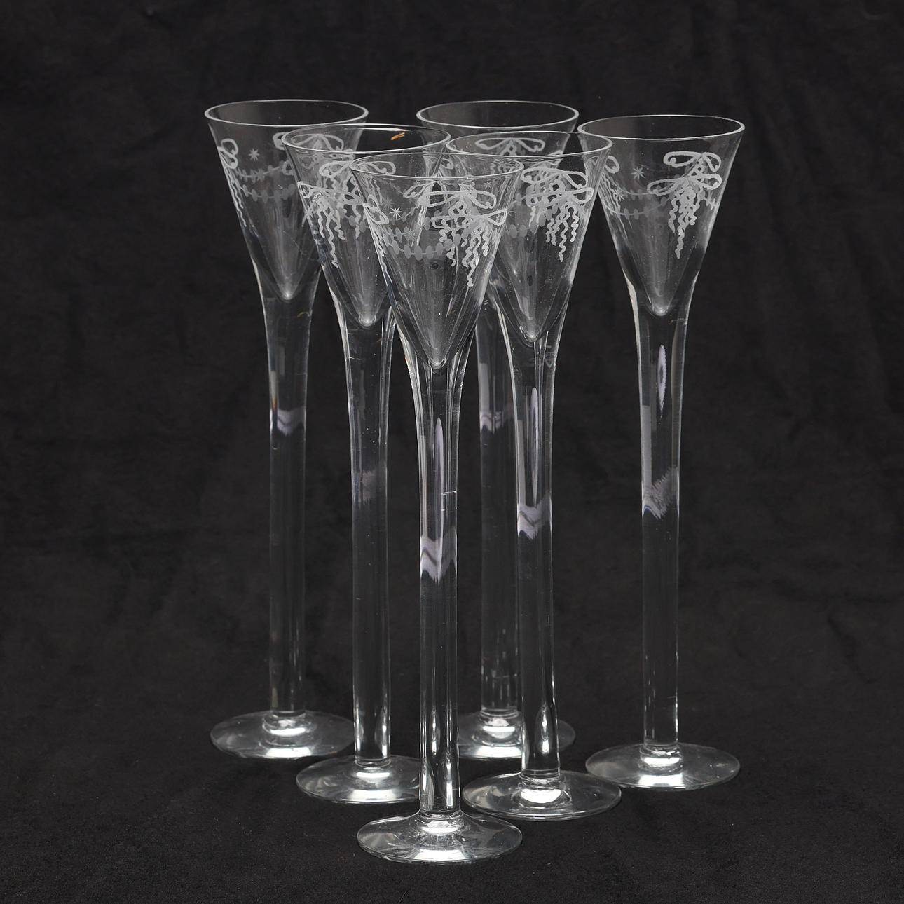 6 st höga snapsglas från Reijmyre av modell Antik med etsad girlangdekor. I mycket fint skick utan skador. Höjden är ca 30 cm.