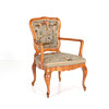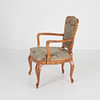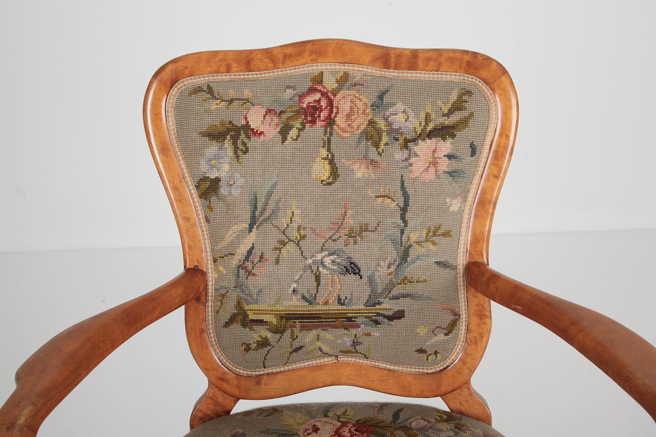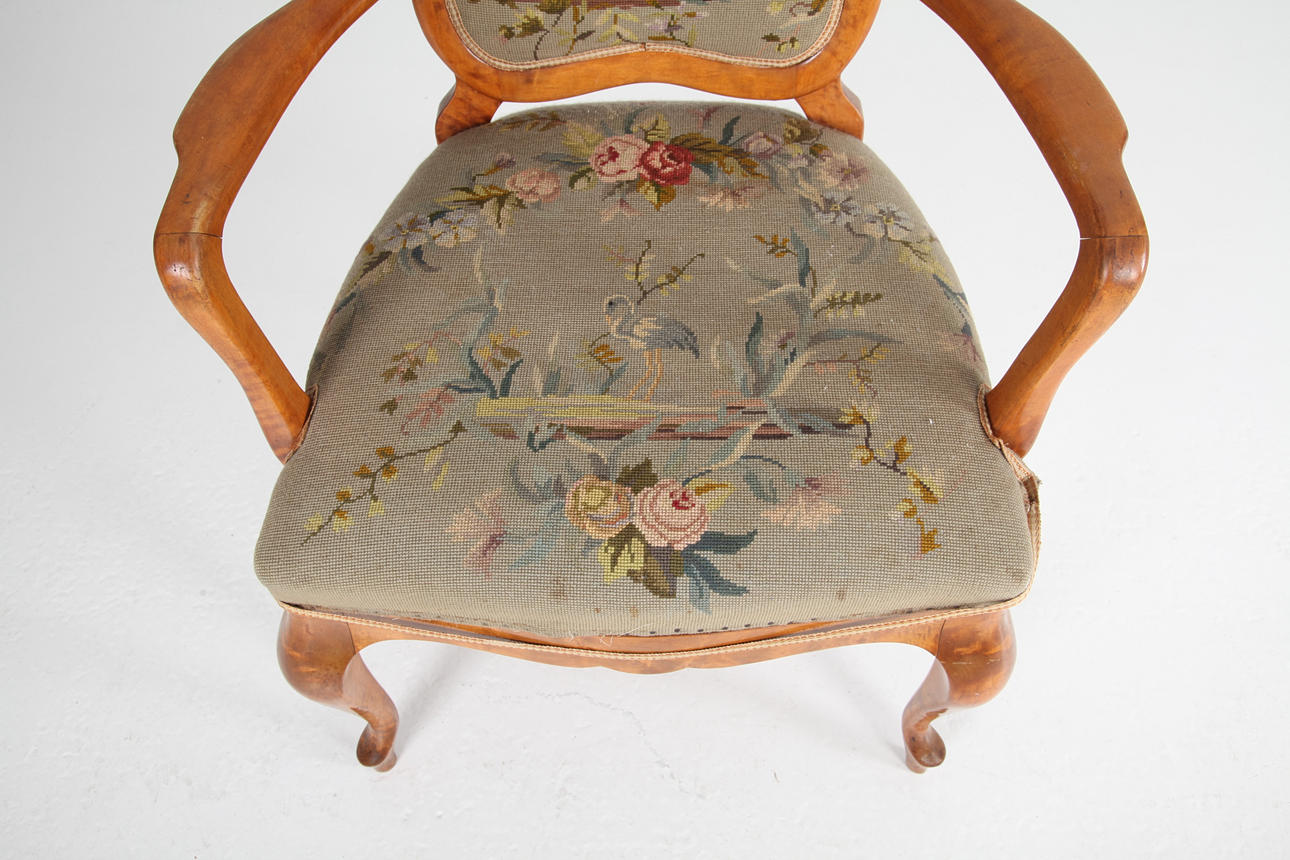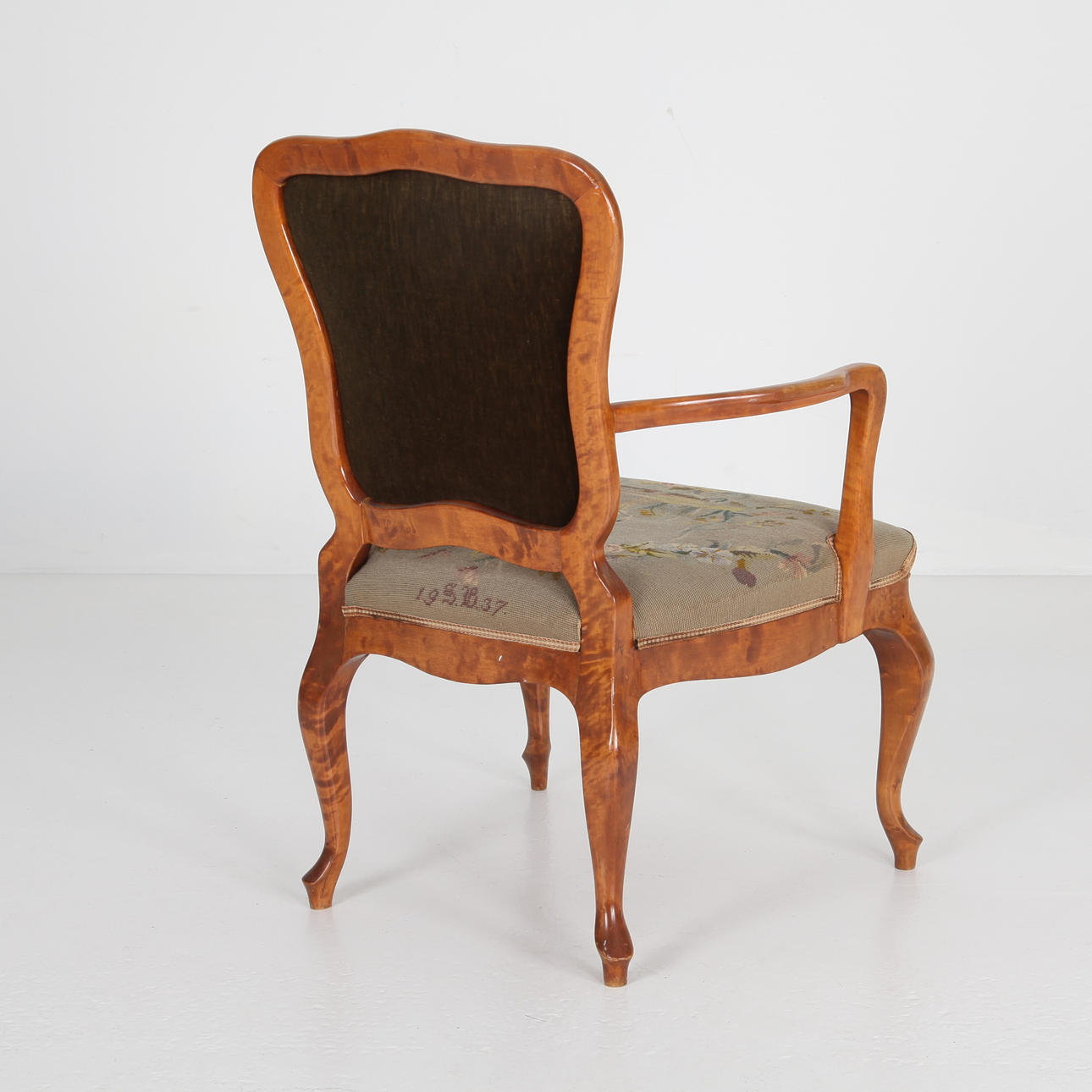 Karmstol, bonad björk, klädsel med petit point som är daterad 1937. Höjd 91 cm Bredd yttermått 65 cm.