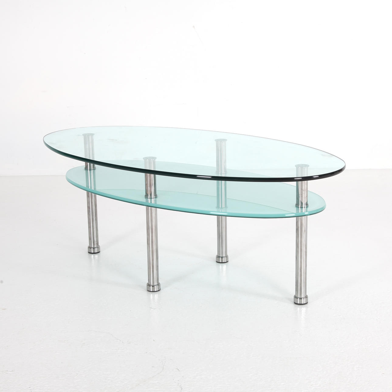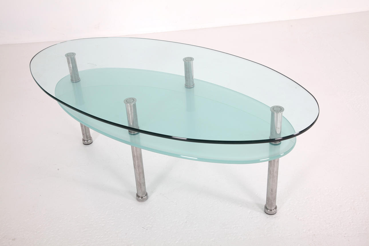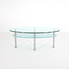 Soffbord. Förkromad metall och lös glasskiva. Fast hylla i glas.