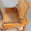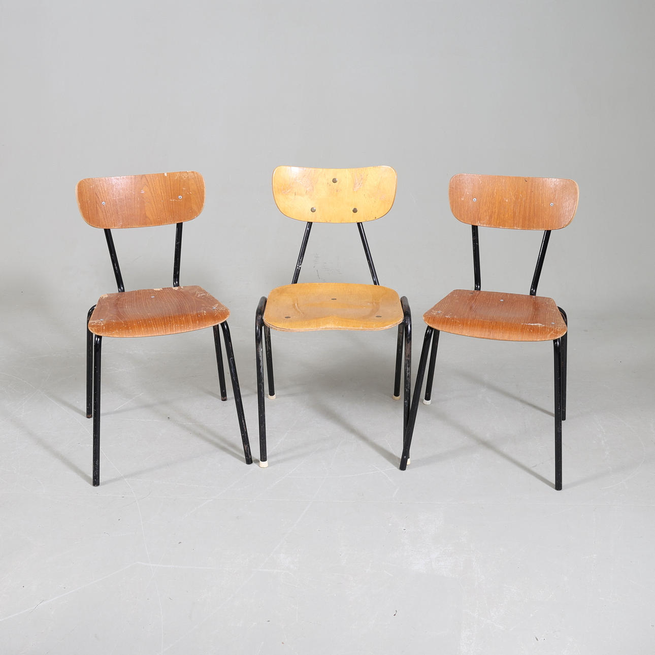 Slitage. Repor, fläckar och lag. Sprickor och avslag. Namn inristade. Stolar med skadat trä och enstaka skruv saknas.