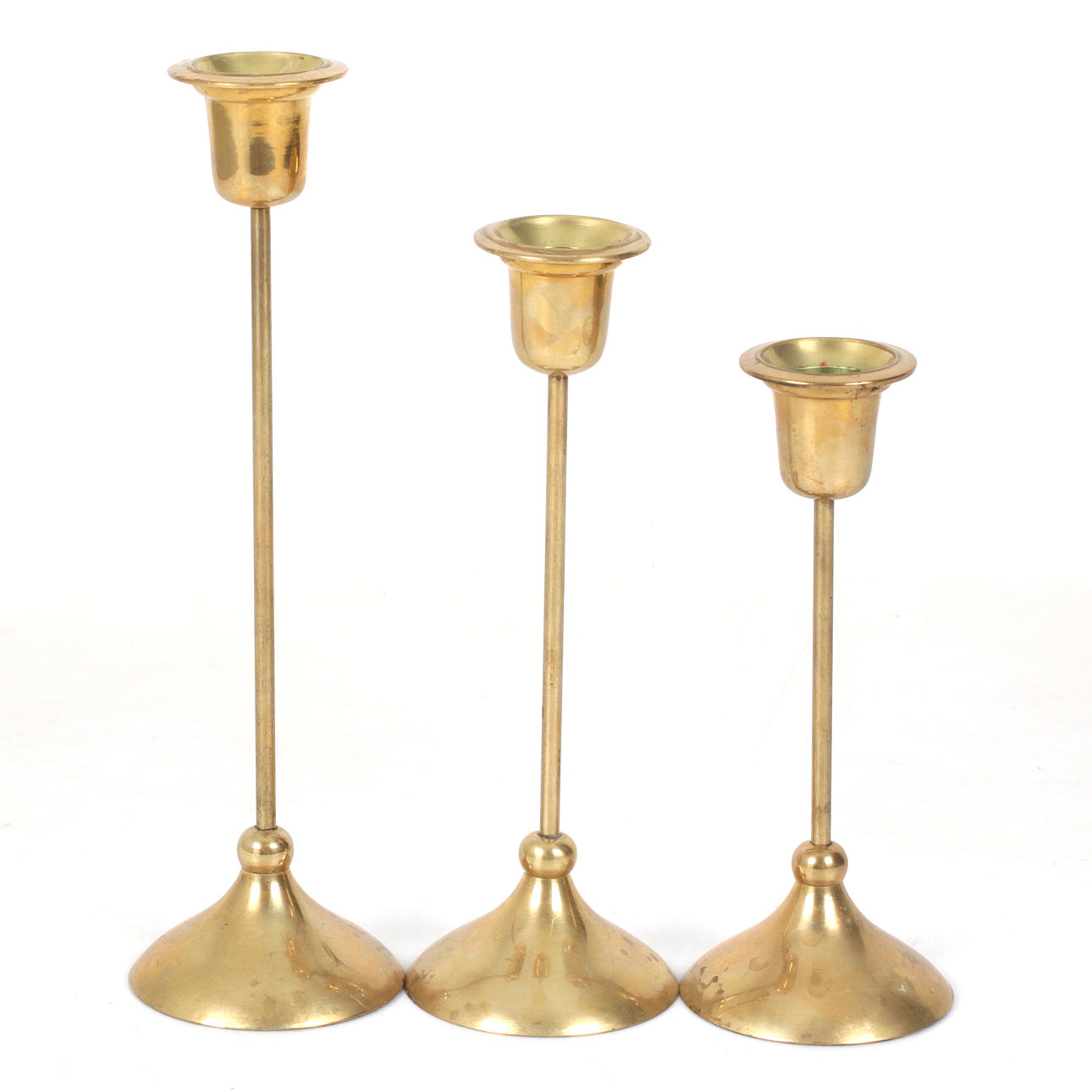 4933225. LJUSSTAKAR, 3 st, mässing, 1900-talets slut.
