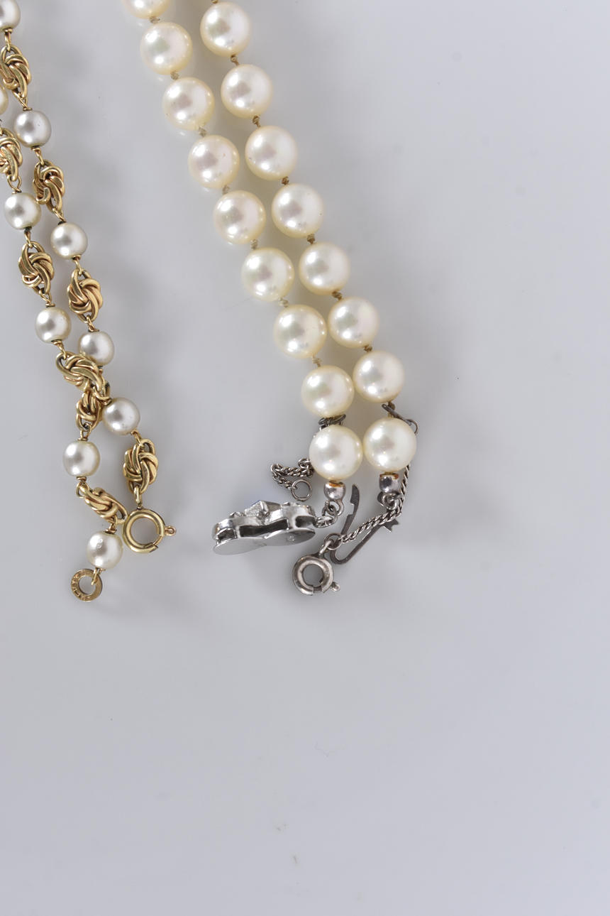 4933295. PÄRLCOLLIER, 2 st, bl a med silverspänne.