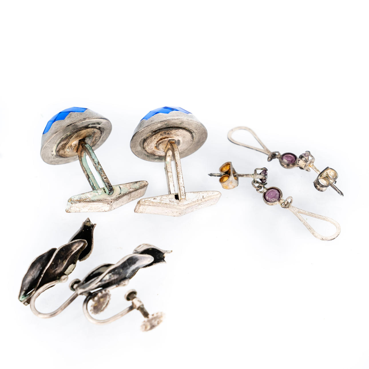 Erodering på manschettknappar, mindre repor samt åldersrelaterat slitage. Ett lås på örhängena något löst.