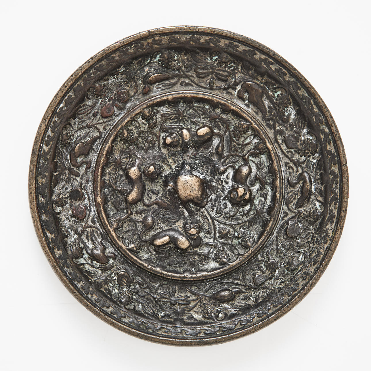 Dekor i relief i bl.a vindruvsklasar, diameter ca 10 cm.