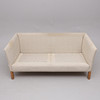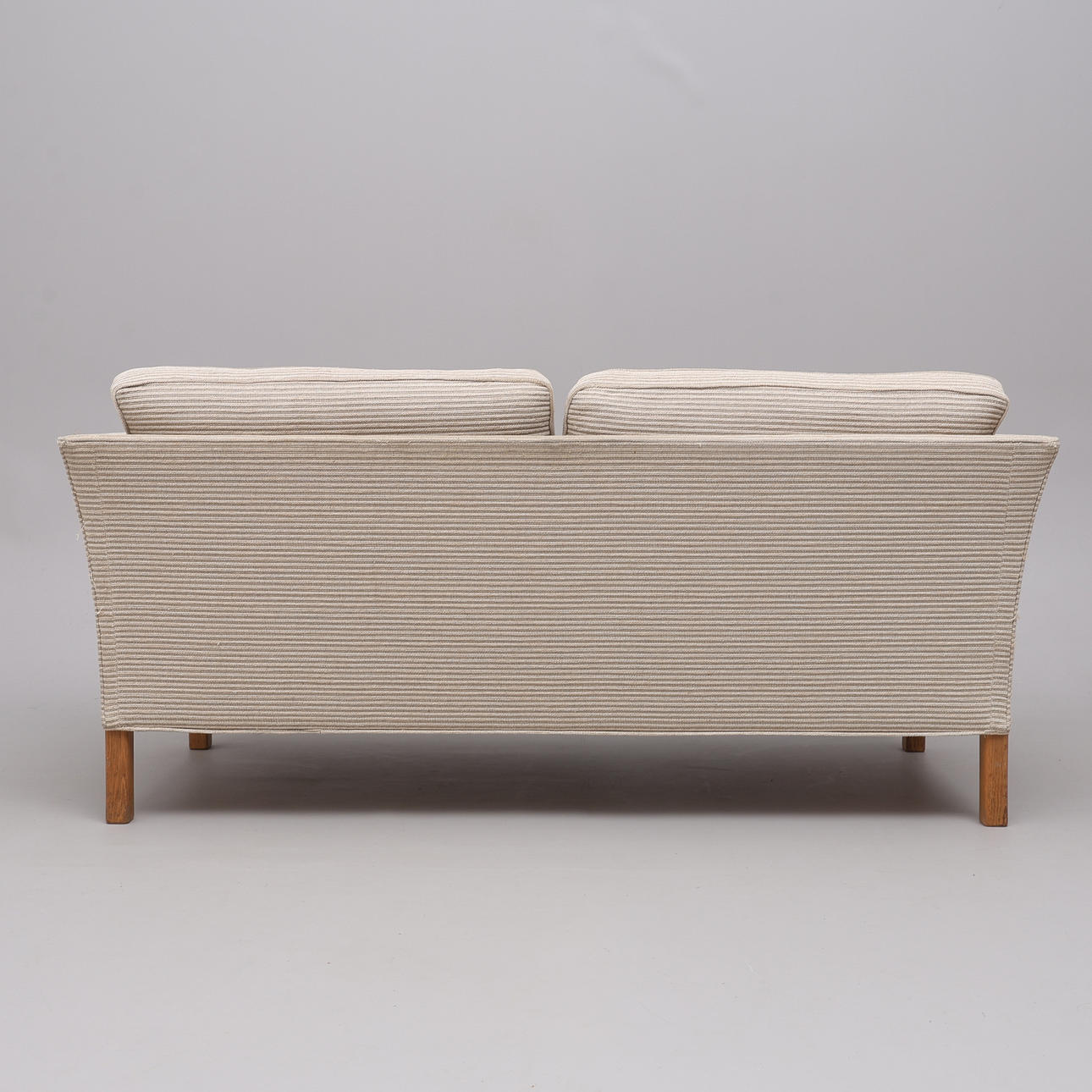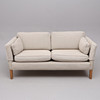 Tvåsitssoffa med ben av ek och lösa plymåer i rygg och sits klädda i beige ribbad textil.