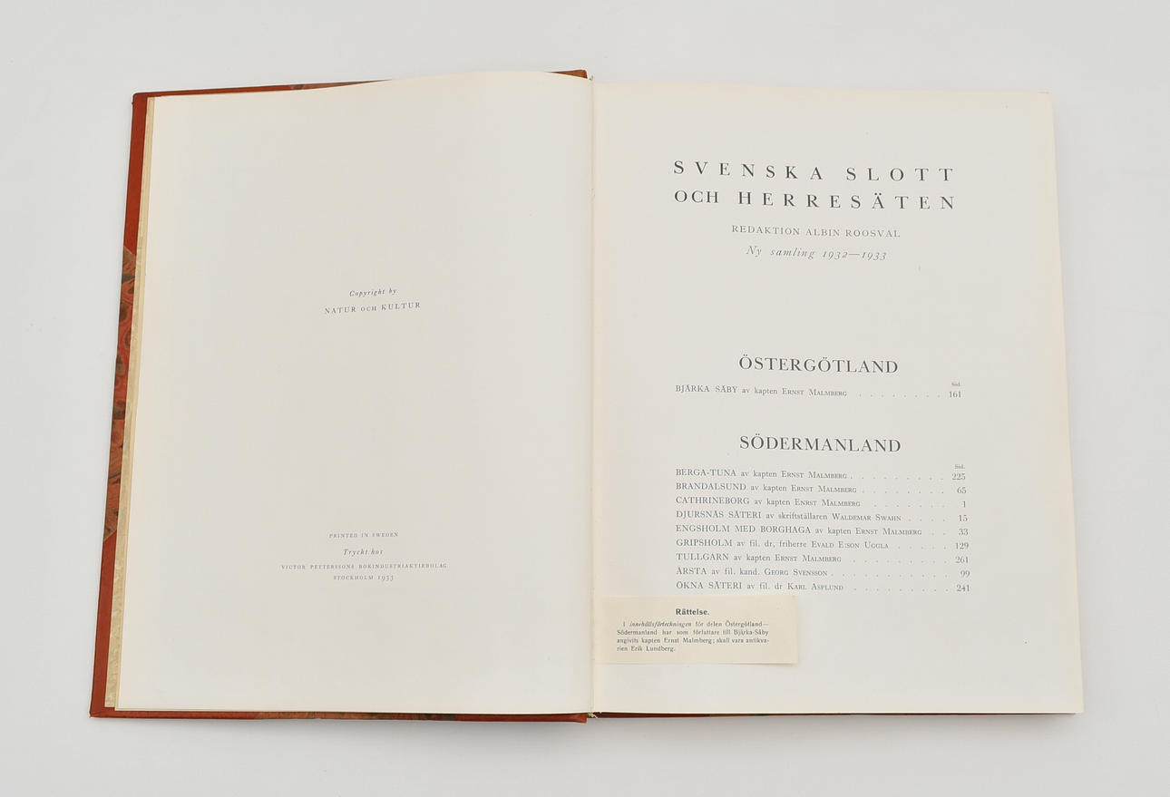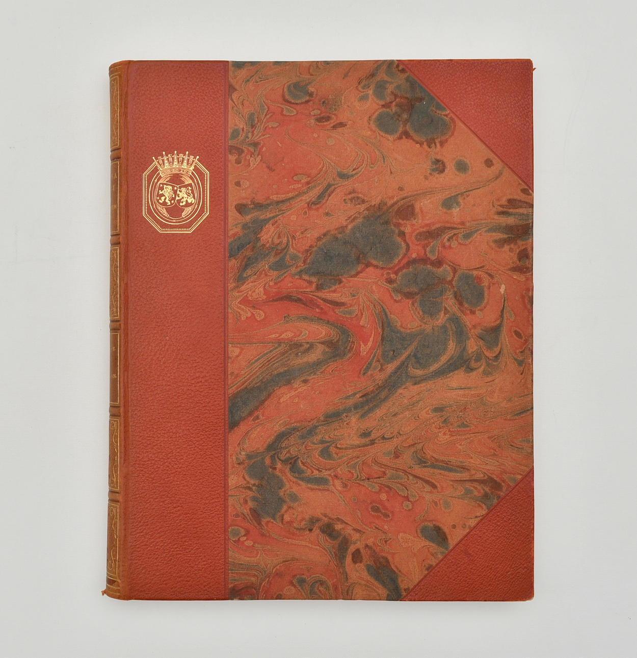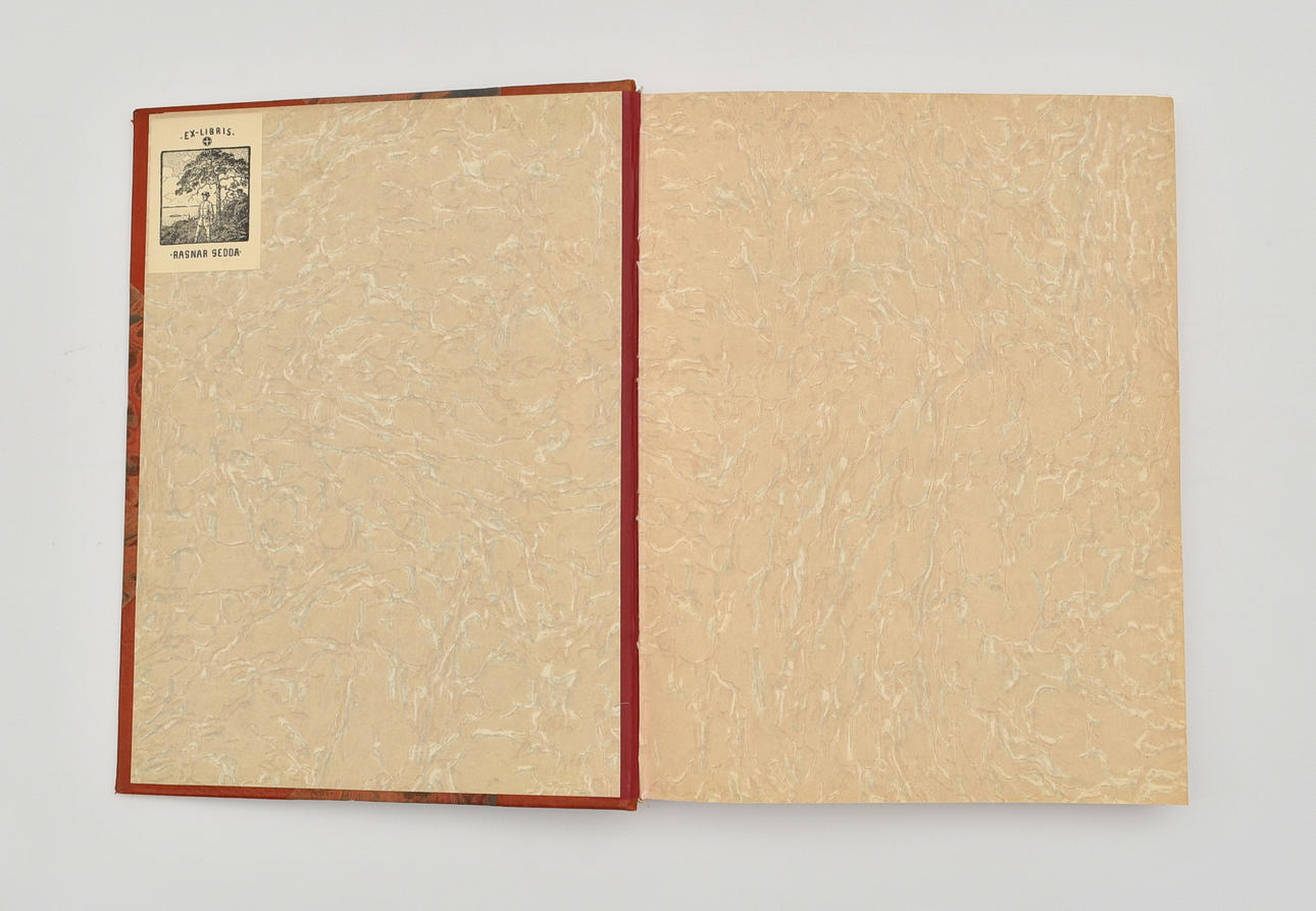 A. Roosval, (Red). Förlagets röda halvfranska band med upphöjda bind, guldornerade ryggar, marmorerade pärmpapper och övre guldsnitt samt förgyllt landskapsvapen på frampärmen.
