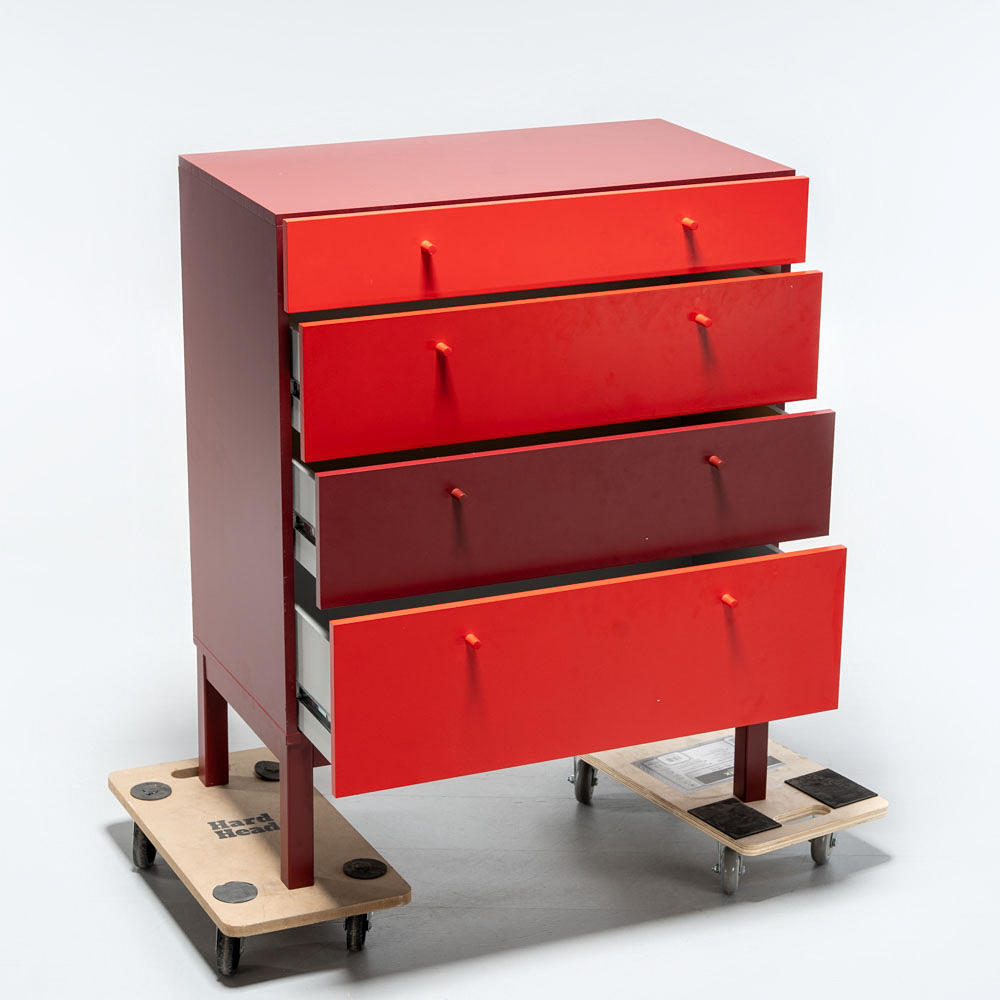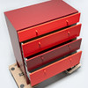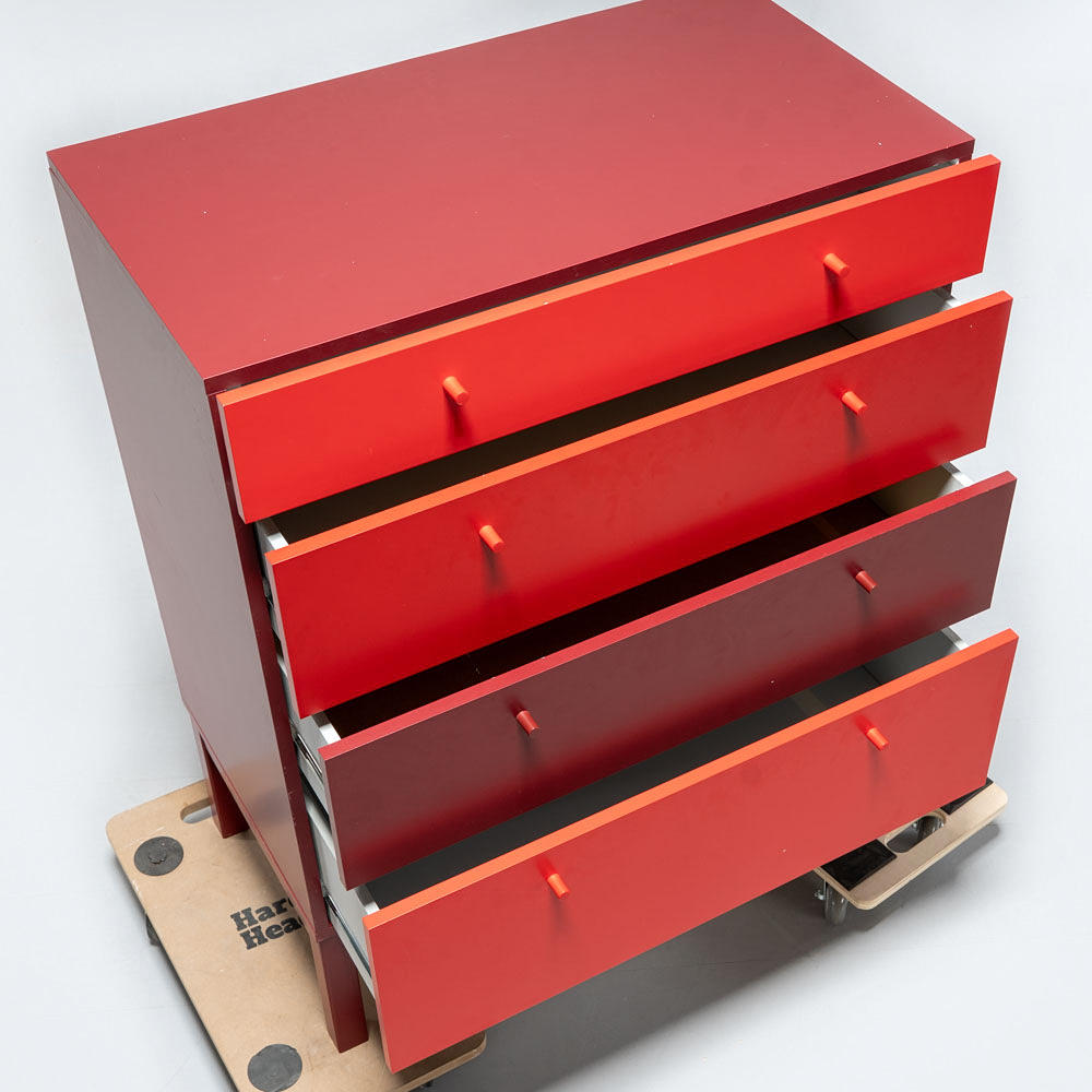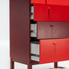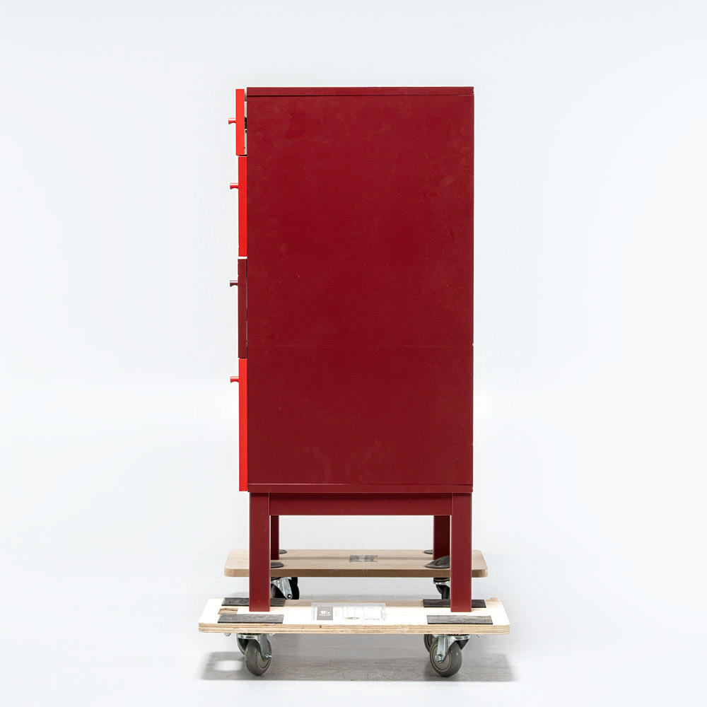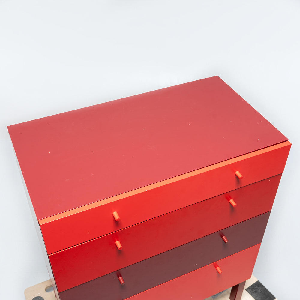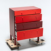 Fanerad i olika röda toner. Fyra lådor med knoppar. Höjd: 100 cm Bredd: 79,5 cm Djup: 45 cm.
