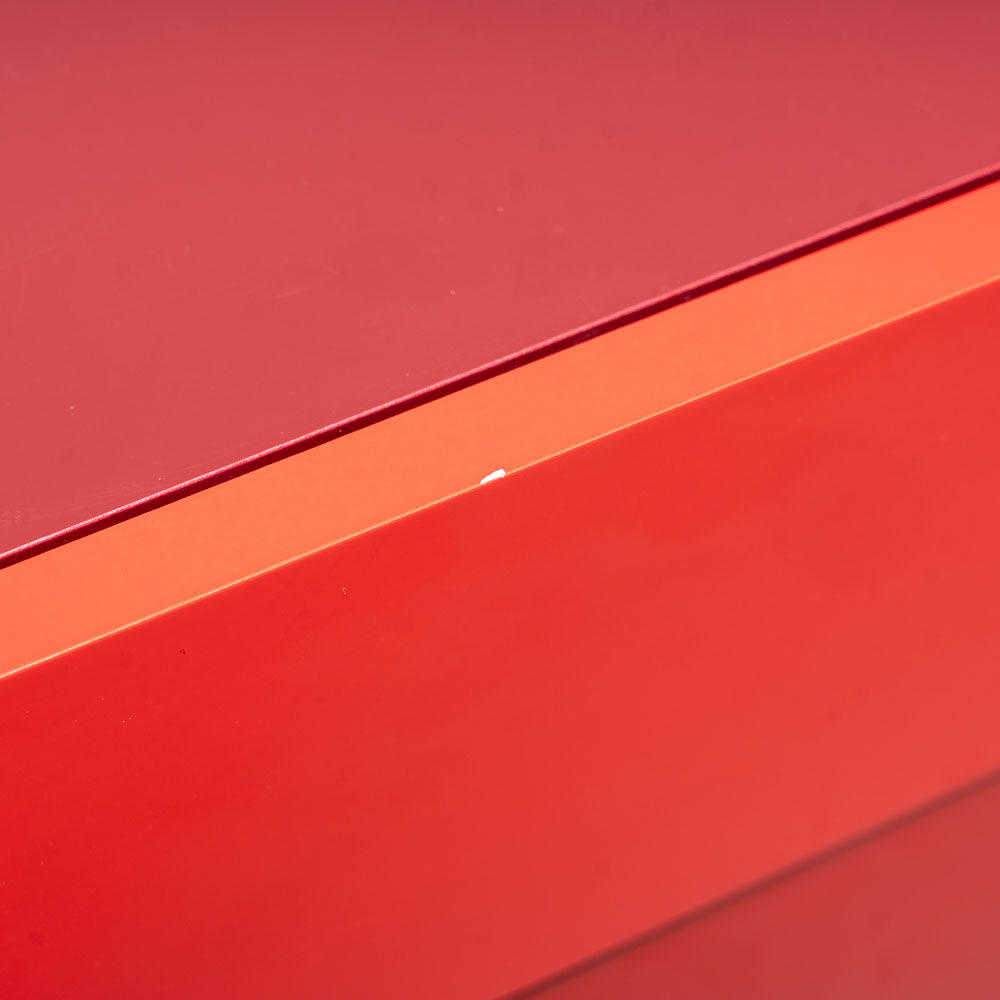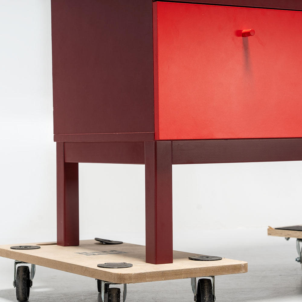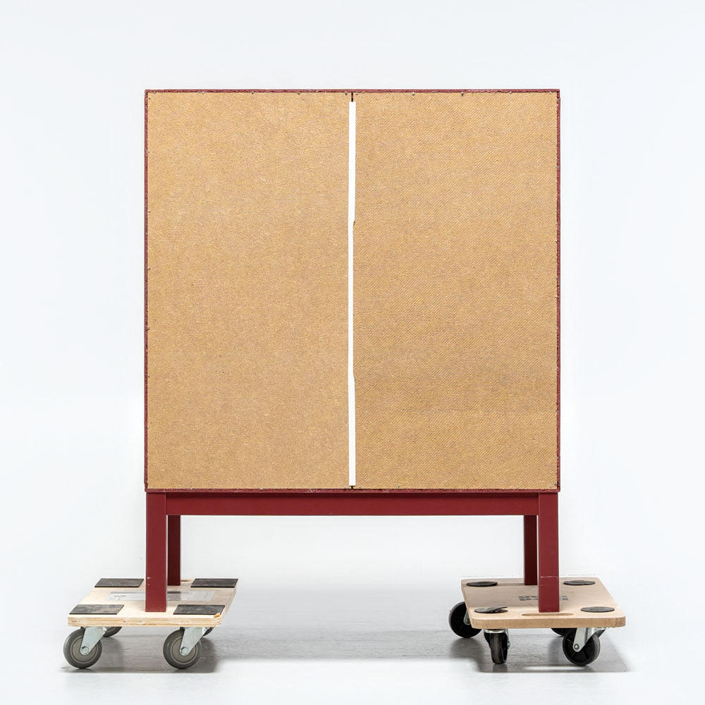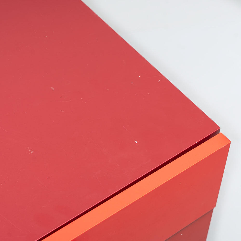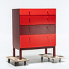 Fanerad i olika röda toner. Fyra lådor med knoppar. Höjd: 100 cm Bredd: 79,5 cm Djup: 45 cm.
