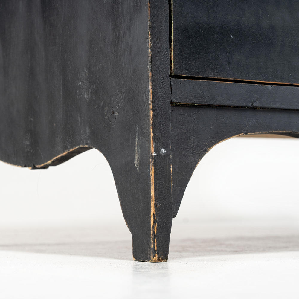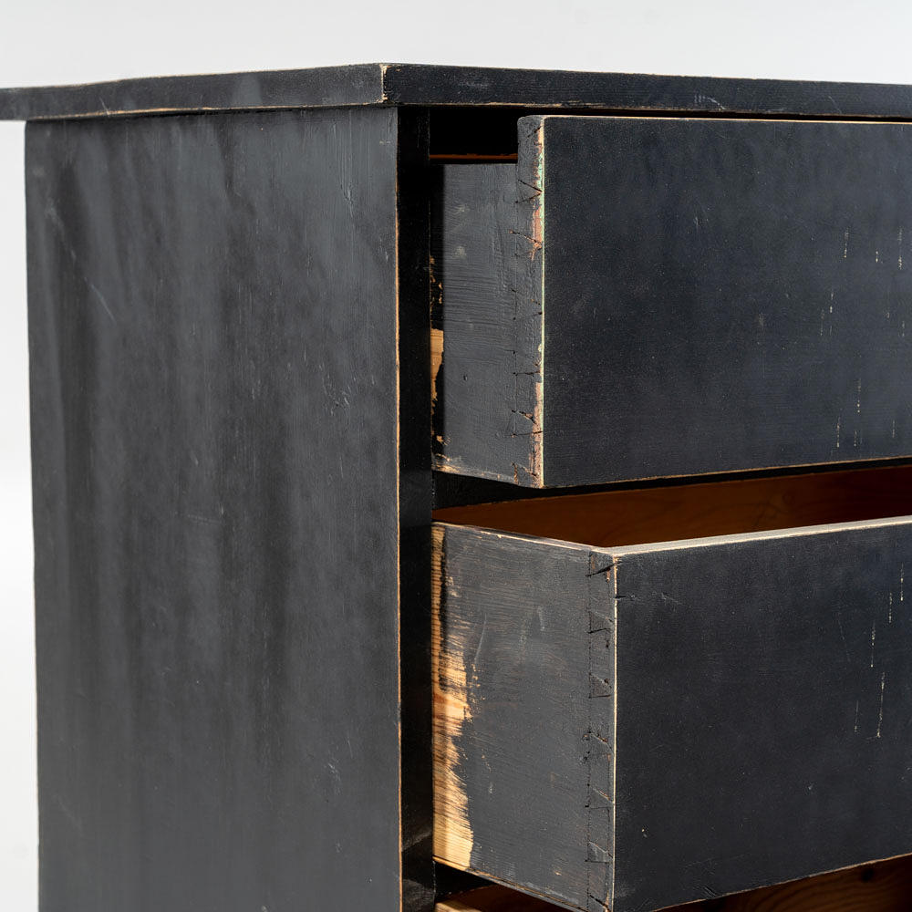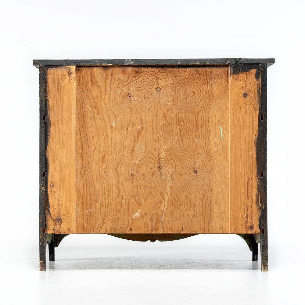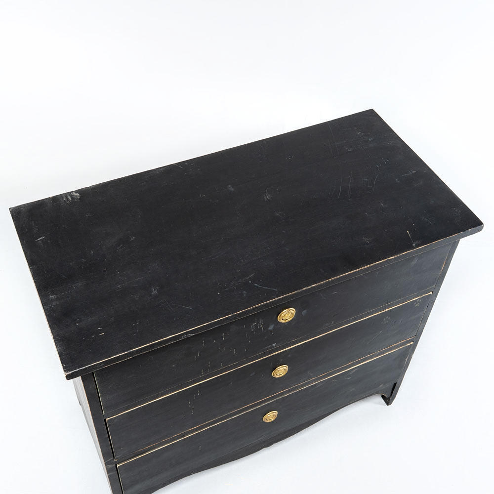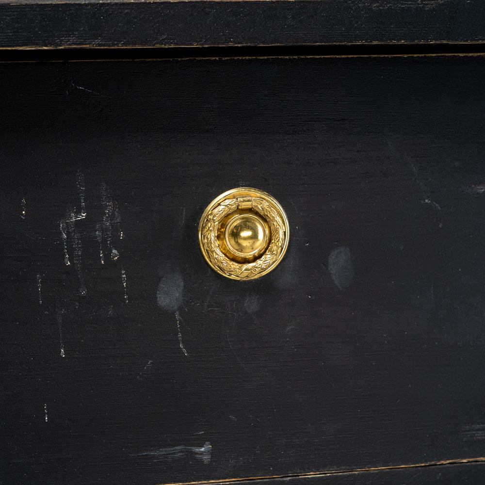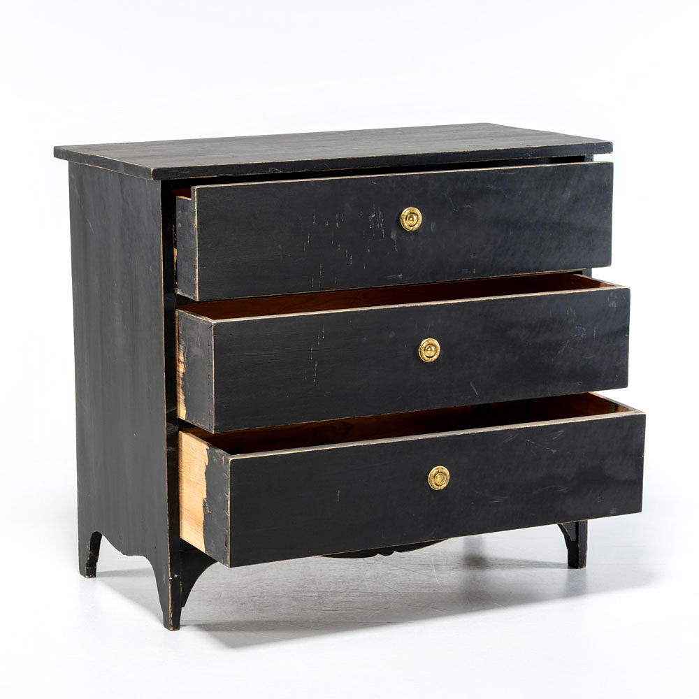 Byrå i svartmålat trä. Mässingsbeslag. Tre lådor.