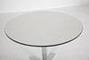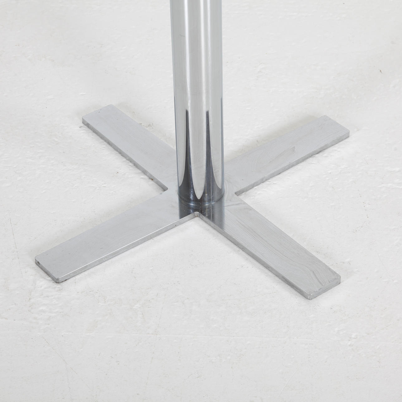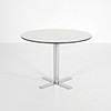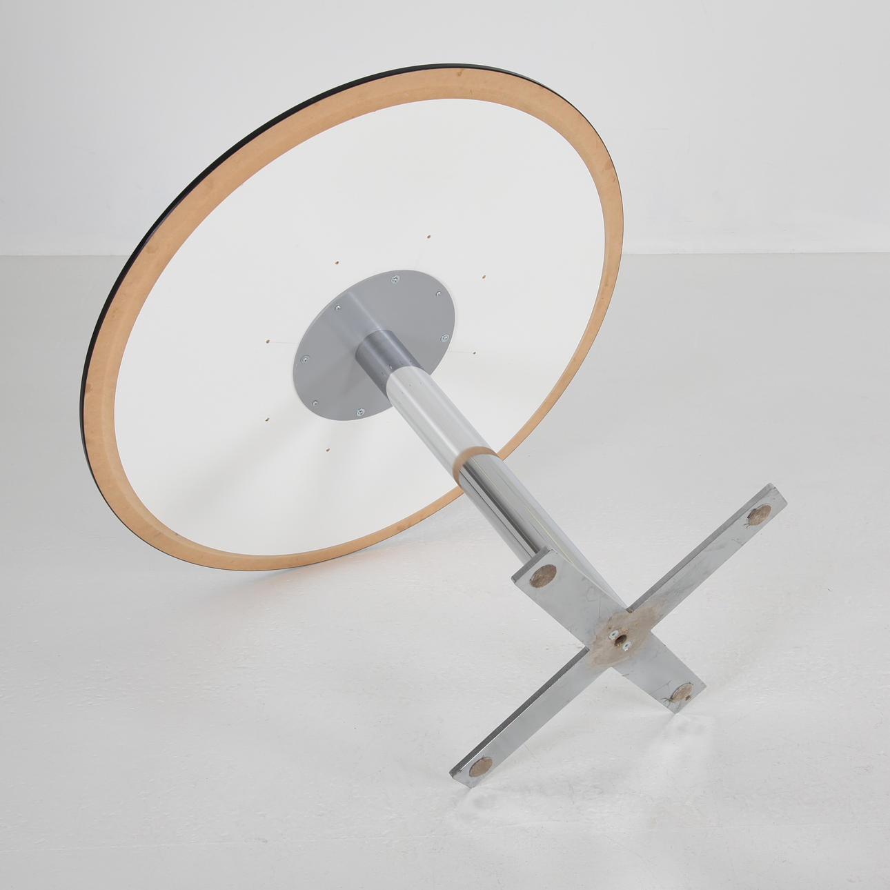 Runt matbord, förkromat stål, skiva i vit laminat, svart kant. Modern tillverkning. Omkring 20 år gammalt.