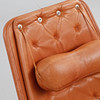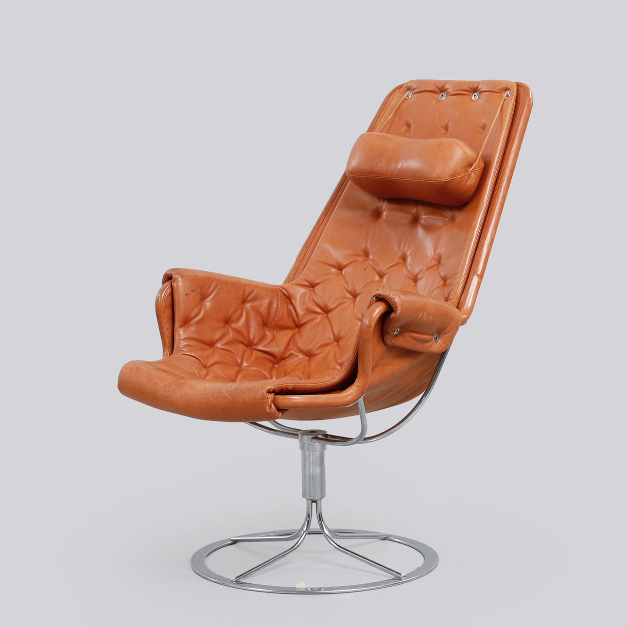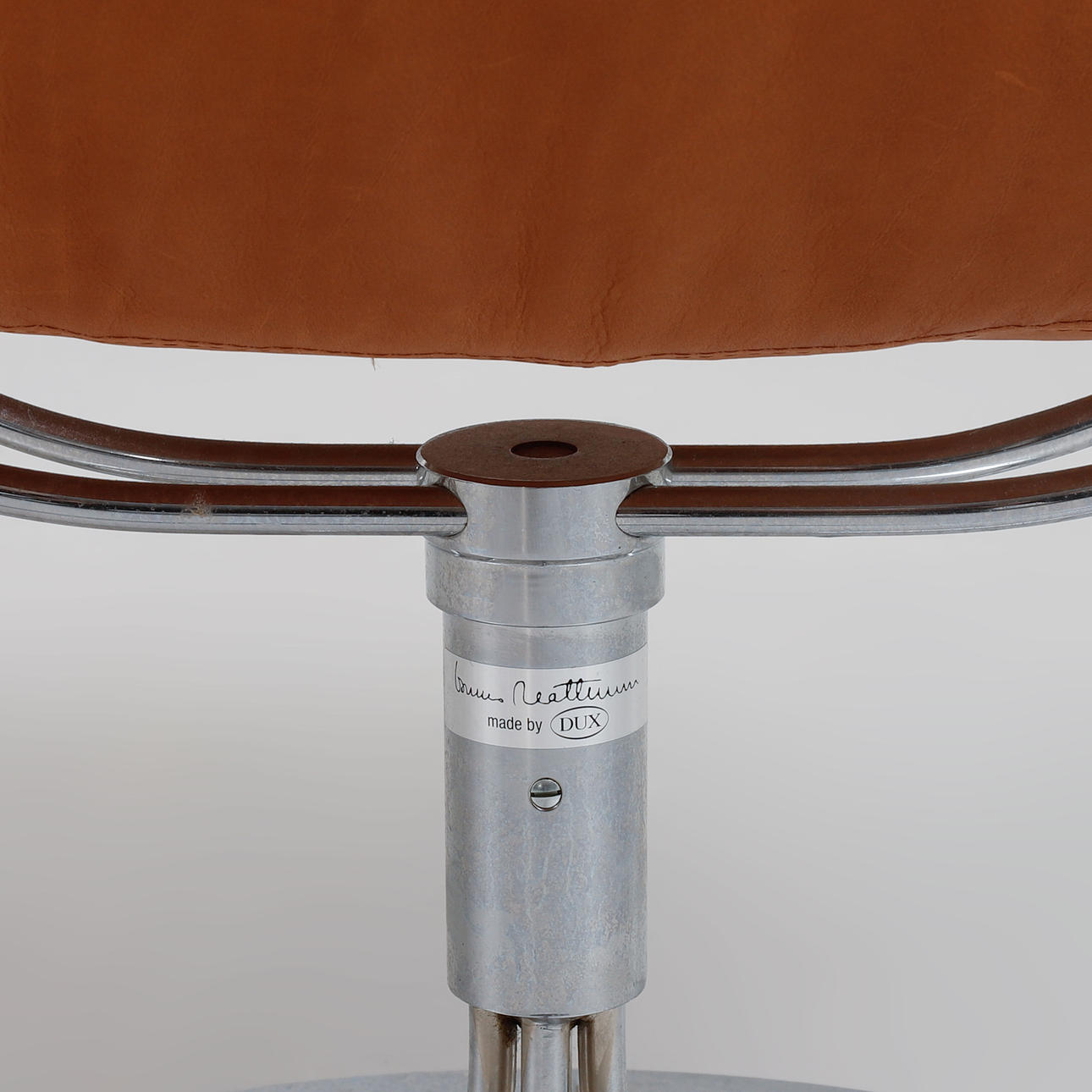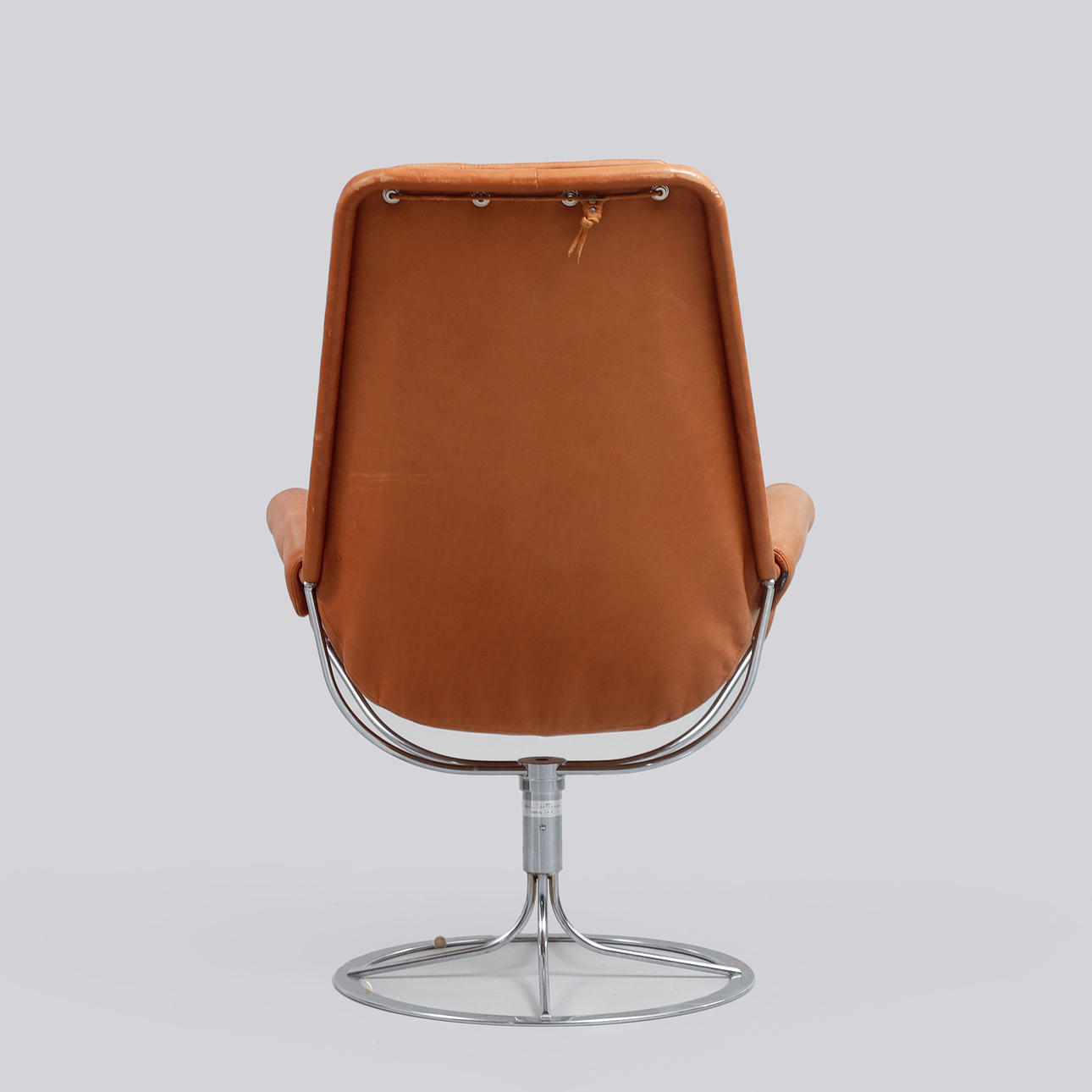 Helklädd i cognacsfärgat dakotaläder. Stativ av kromat stål med autoretur-funktion. Etikettmärkt. Bredd ca 68 cm, sitthöjd ca 43 cm, rygghöjd ca 98 cm.