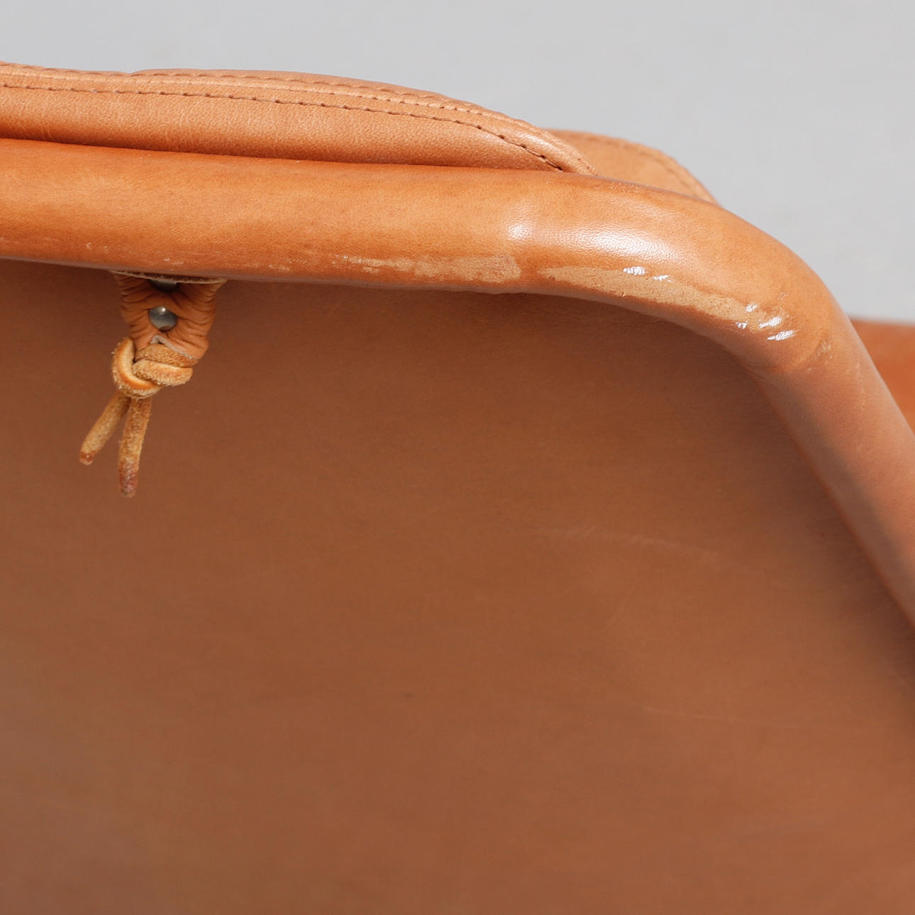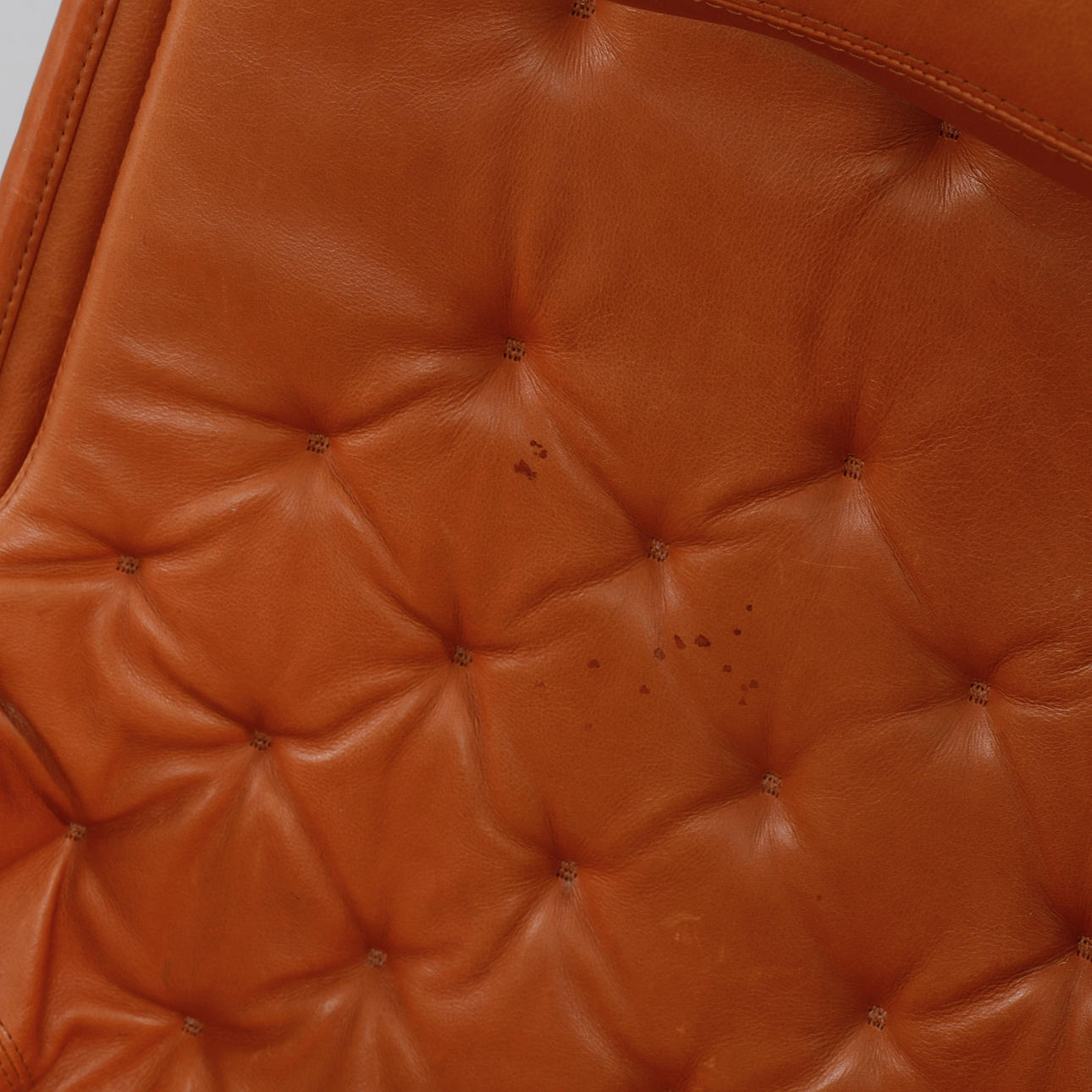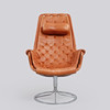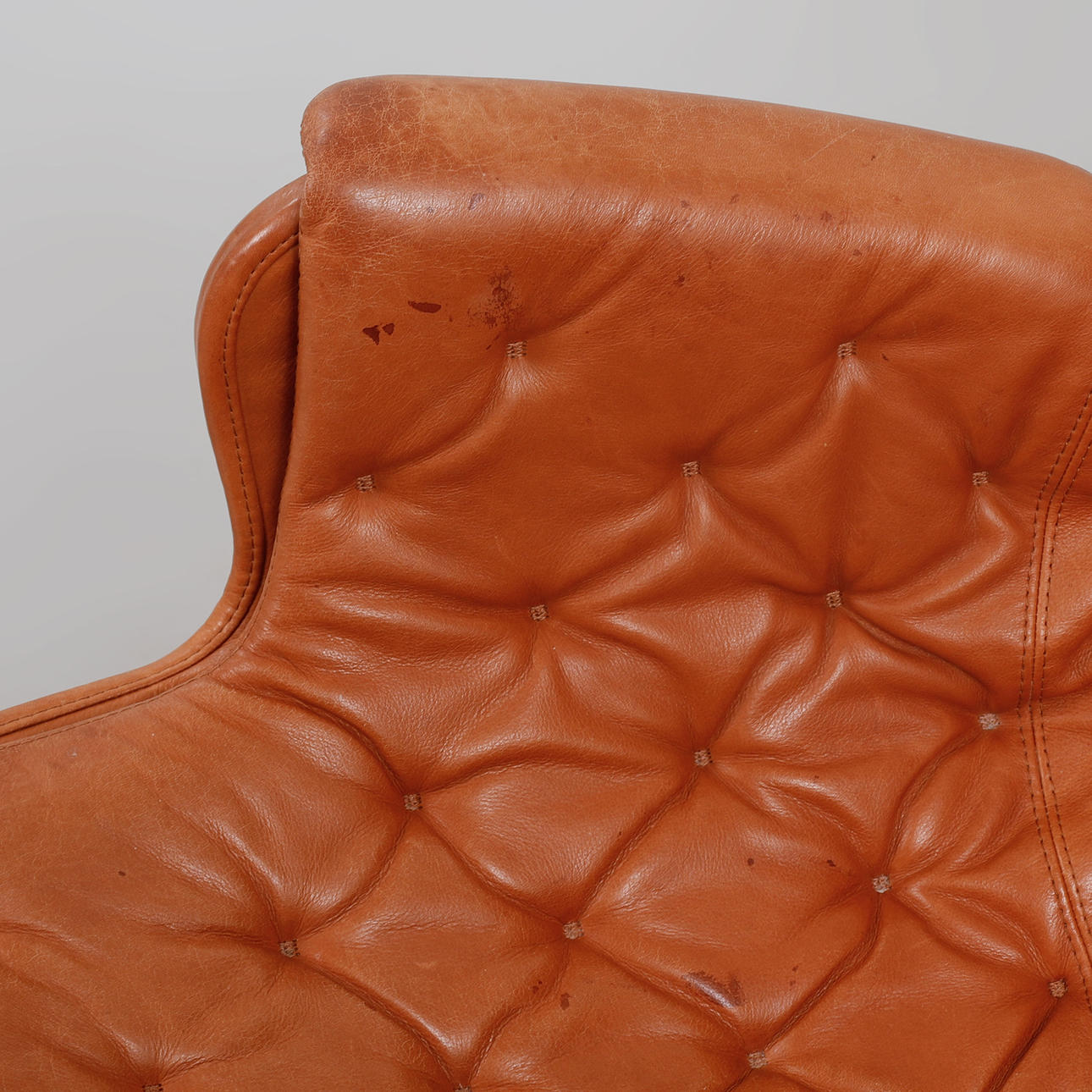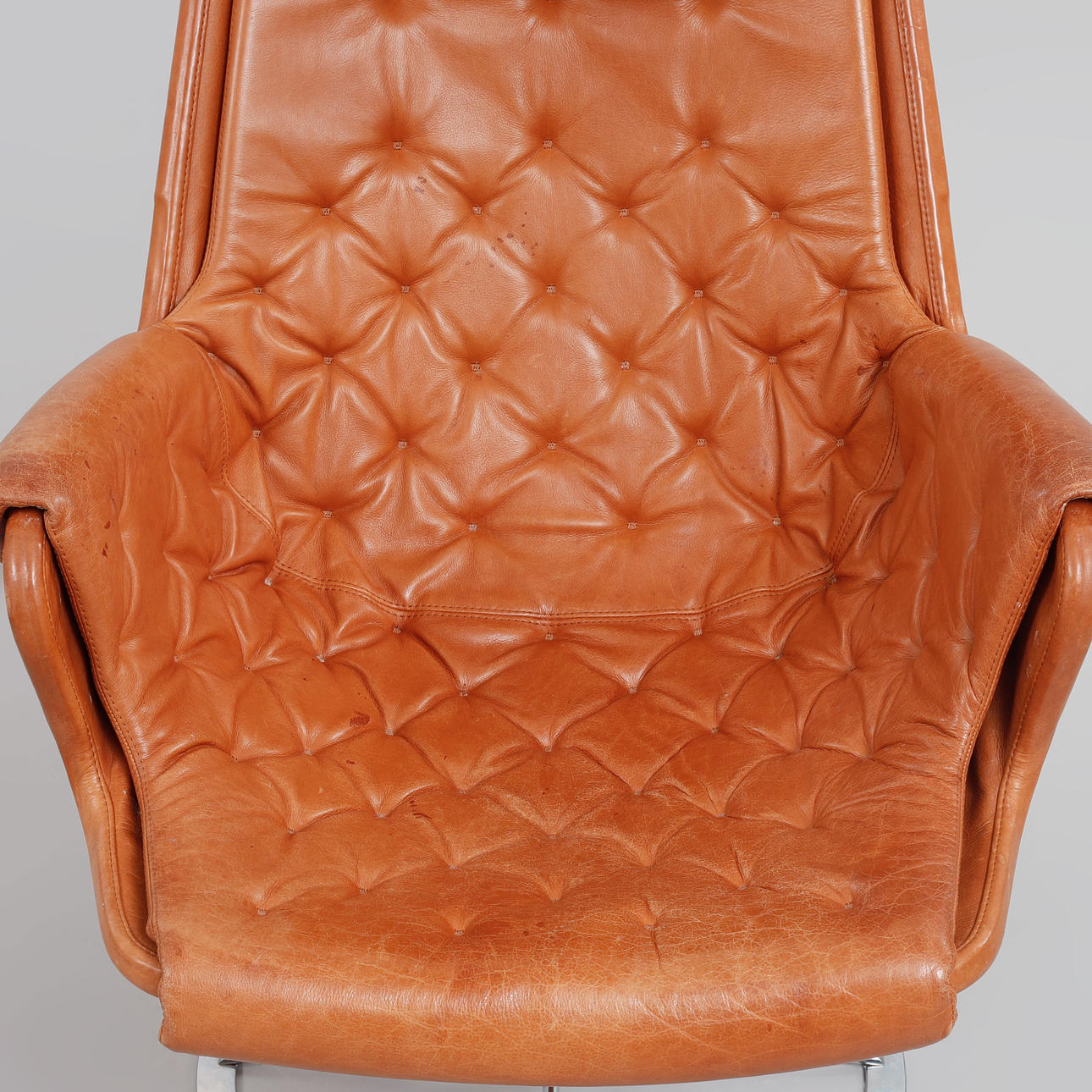 Helklädd i cognacsfärgat dakotaläder. Stativ av kromat stål med autoretur-funktion. Etikettmärkt. Bredd ca 68 cm, sitthöjd ca 43 cm, rygghöjd ca 98 cm.