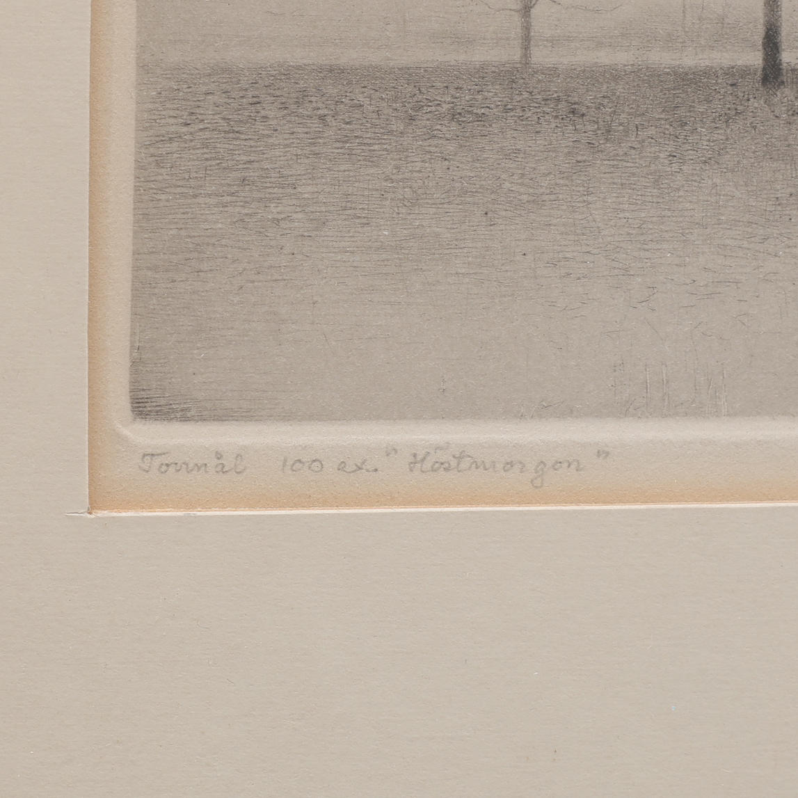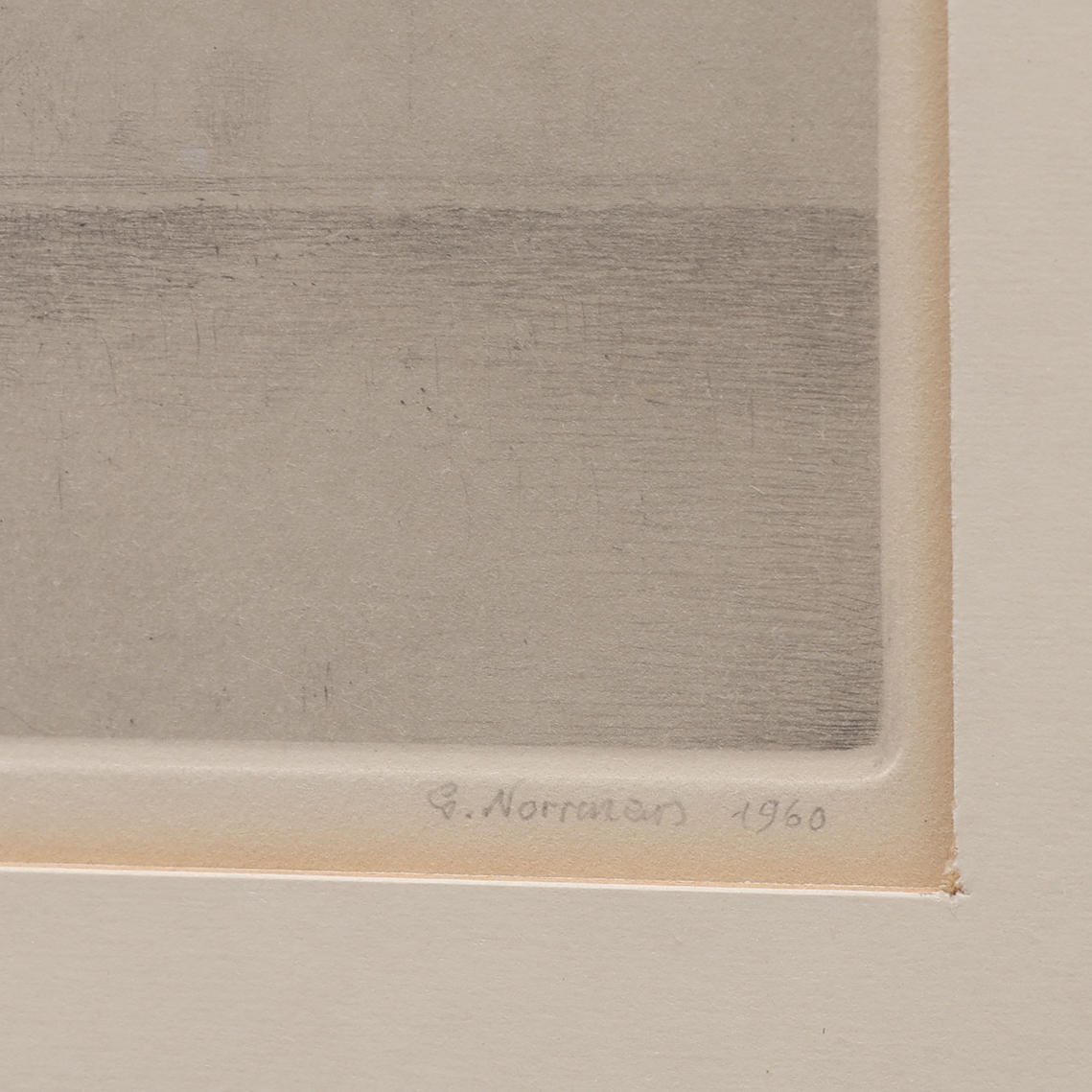 Signerad, daterad 60, upplaga 100 exemplar, torrnålsetsning, plåtyta 14x19,5 cm, rammått 31x37,5 cm.