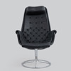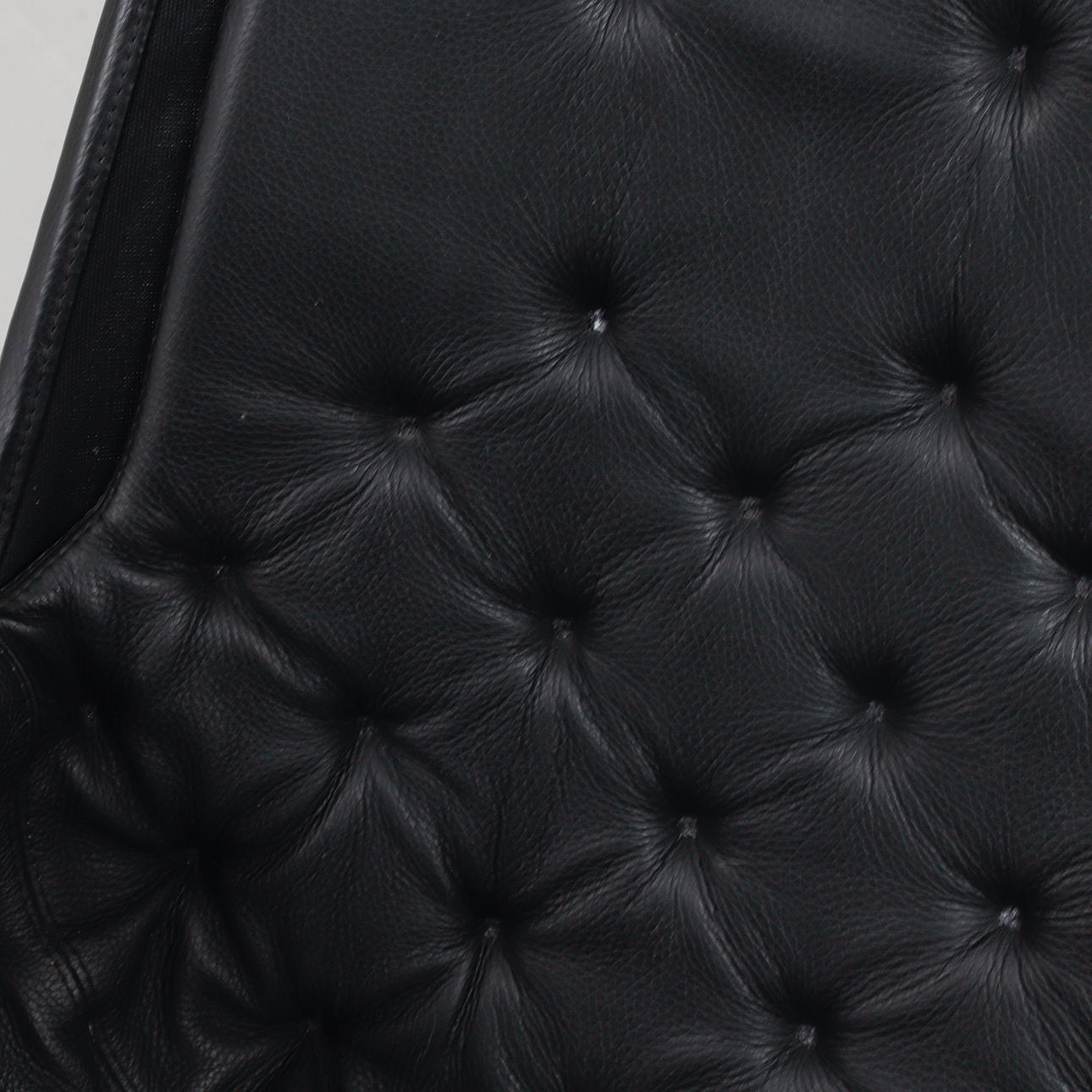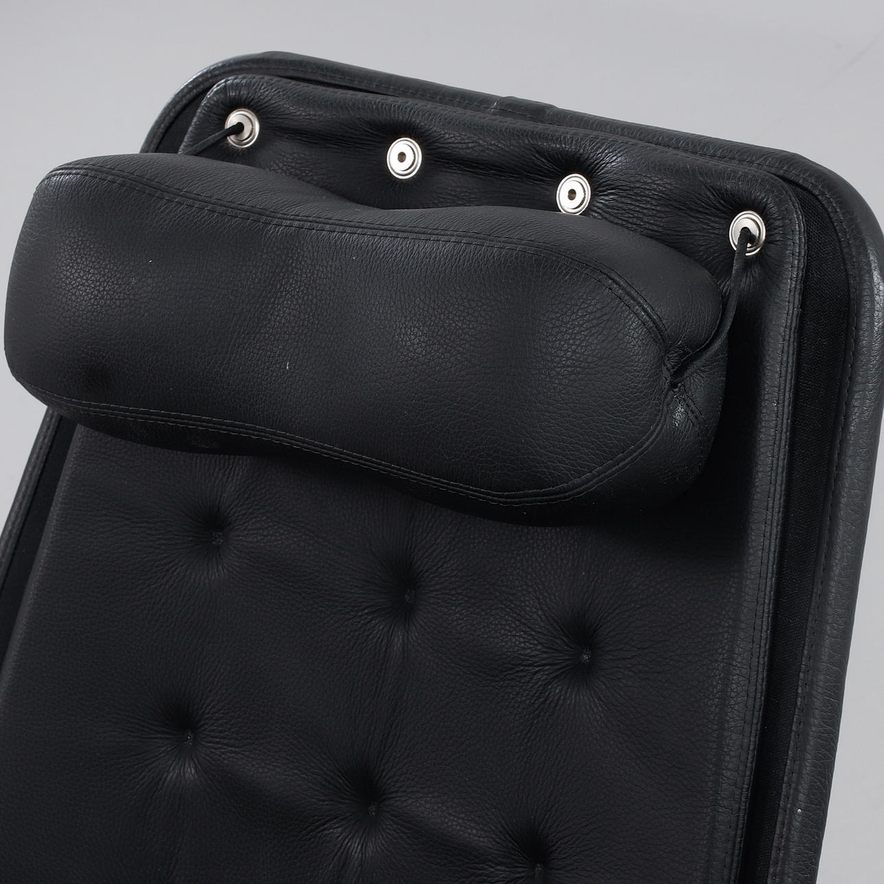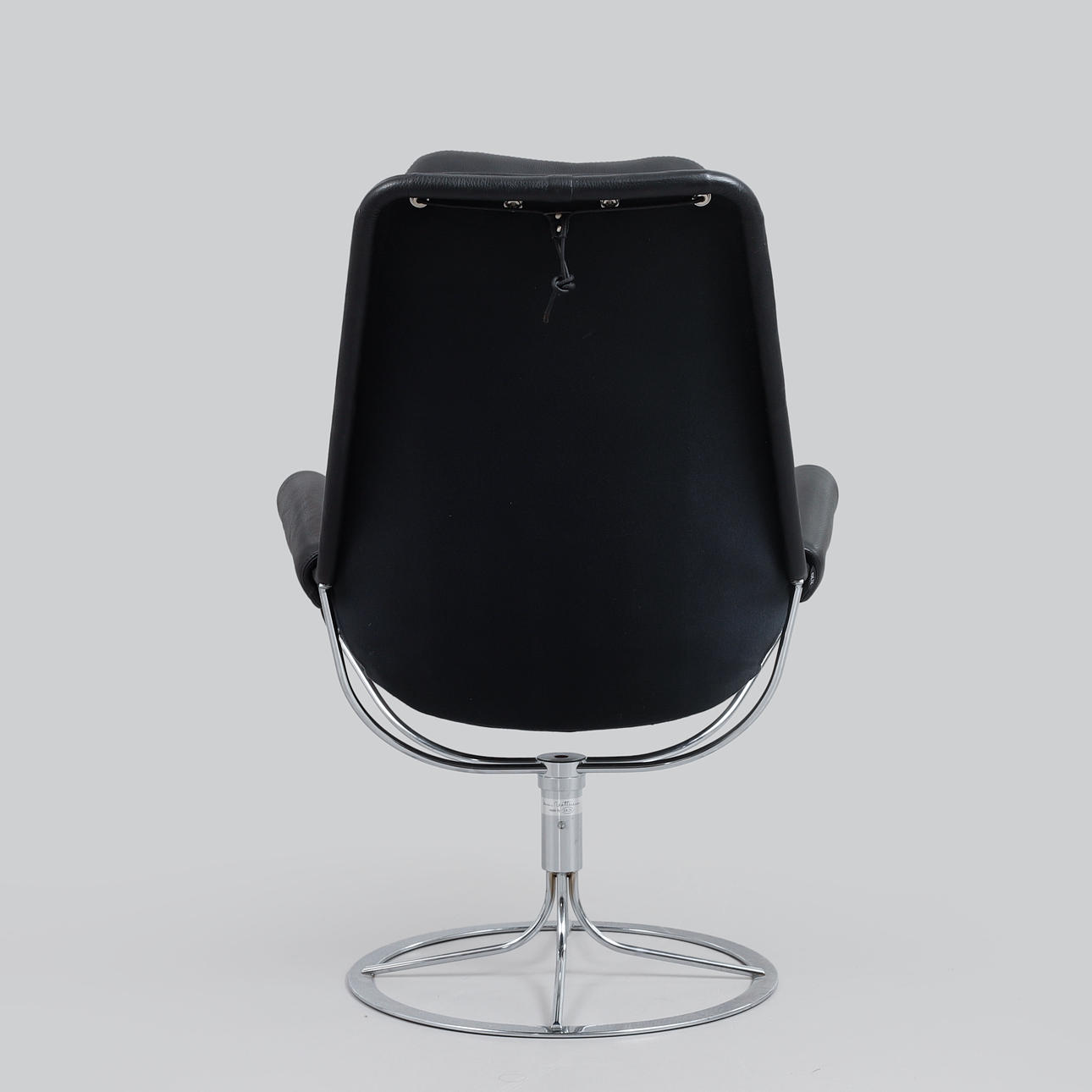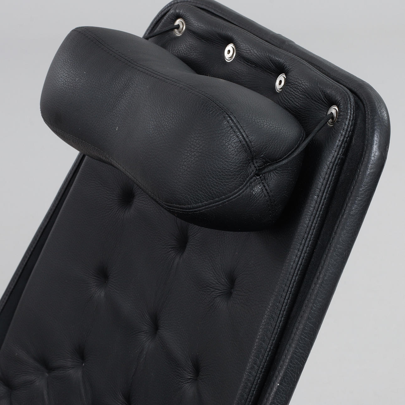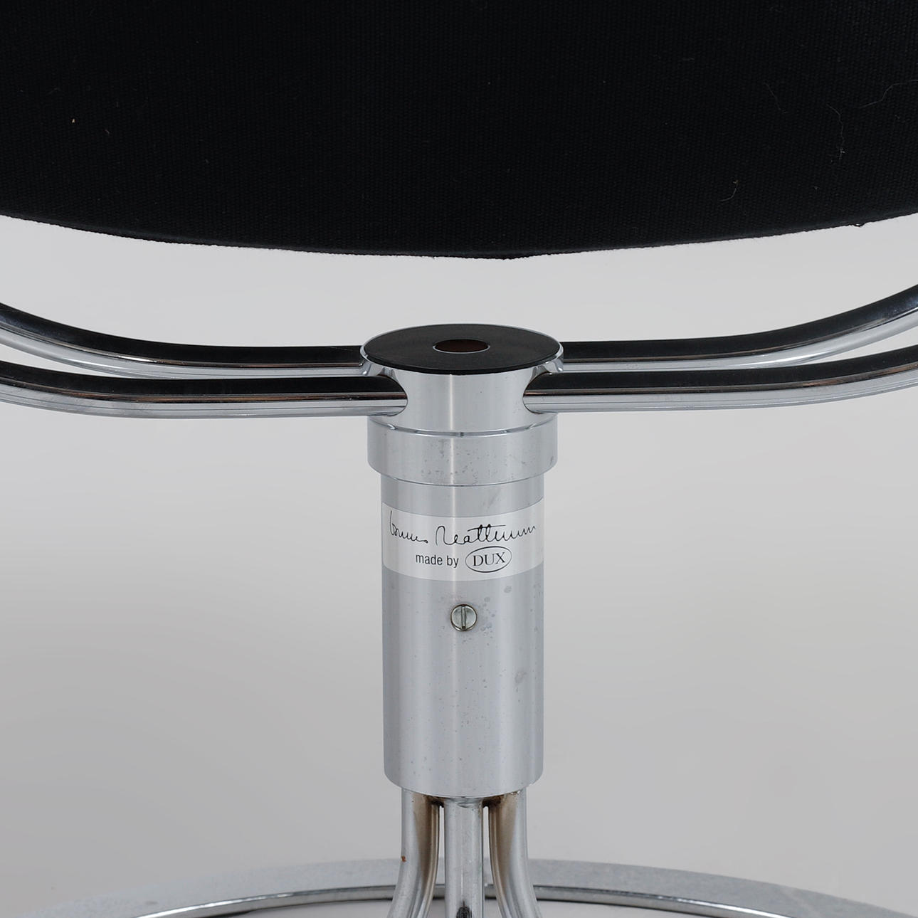 Svart skinnklädsel. Stativ av kromat stål med autoretur-funktion. Etikettmärkt. Bredd ca 68 cm, sitthöjd ca 43 cm, rygghöjd ca 98 cm.