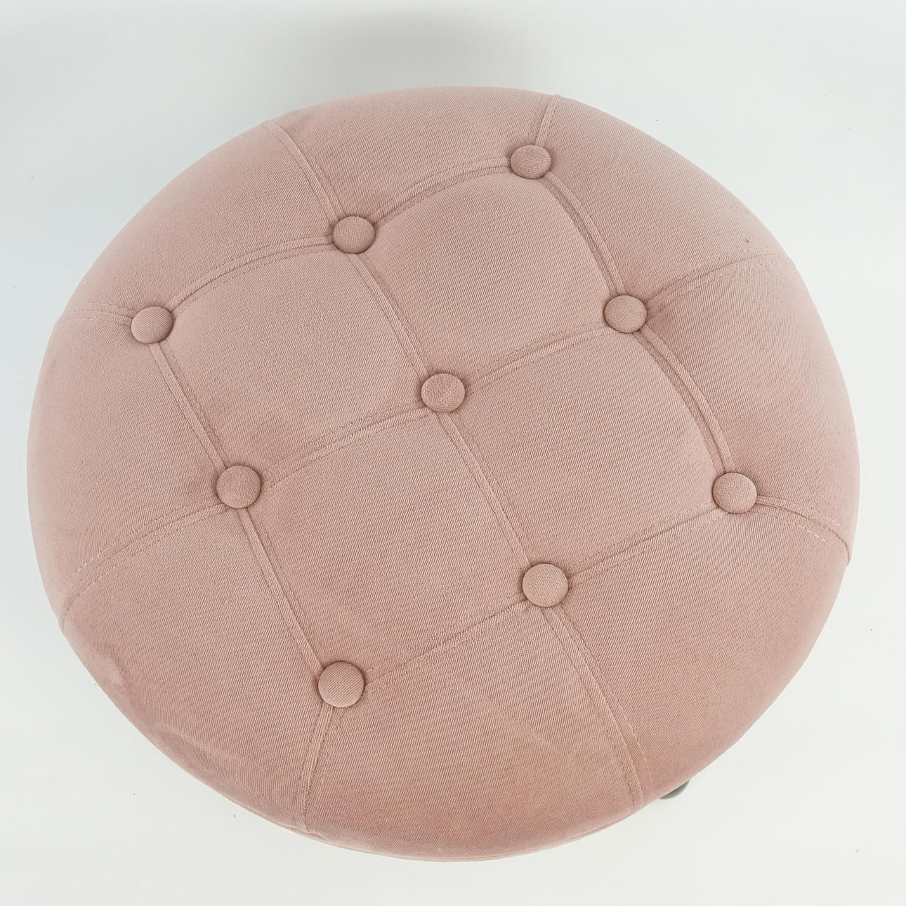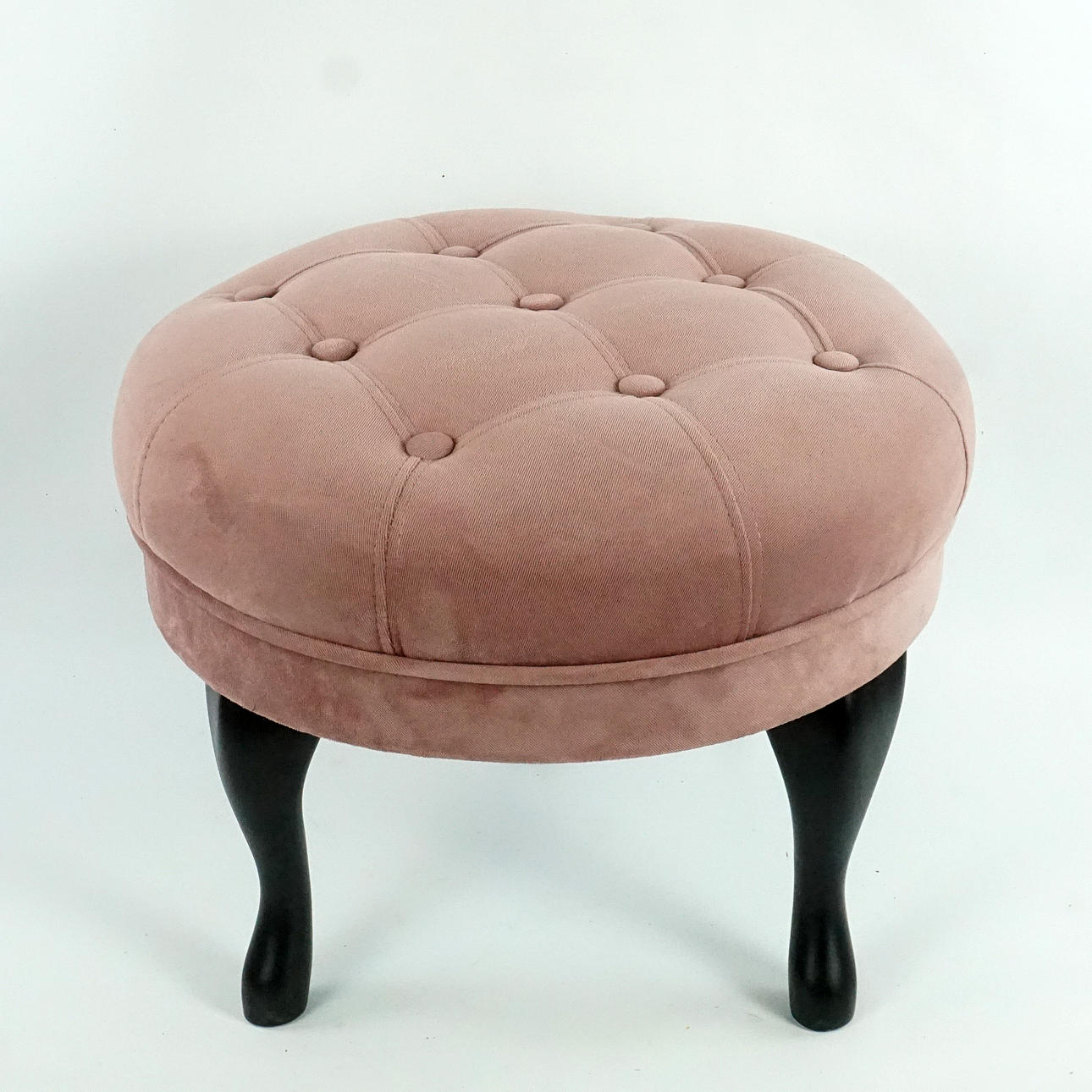 Fast stoppad, klädd i rosa textil. Svängda ben i svartlackerat trä. Höjd ca 40 cm, diameter ca 50 cm.