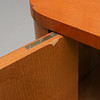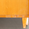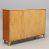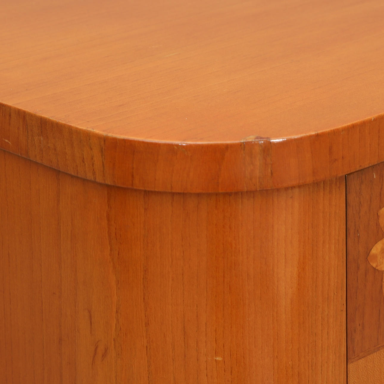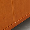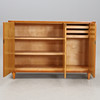 Bruksslitage, fanerlagningar nertill, saknas en hylla i höger skåp. Skivan något lös.