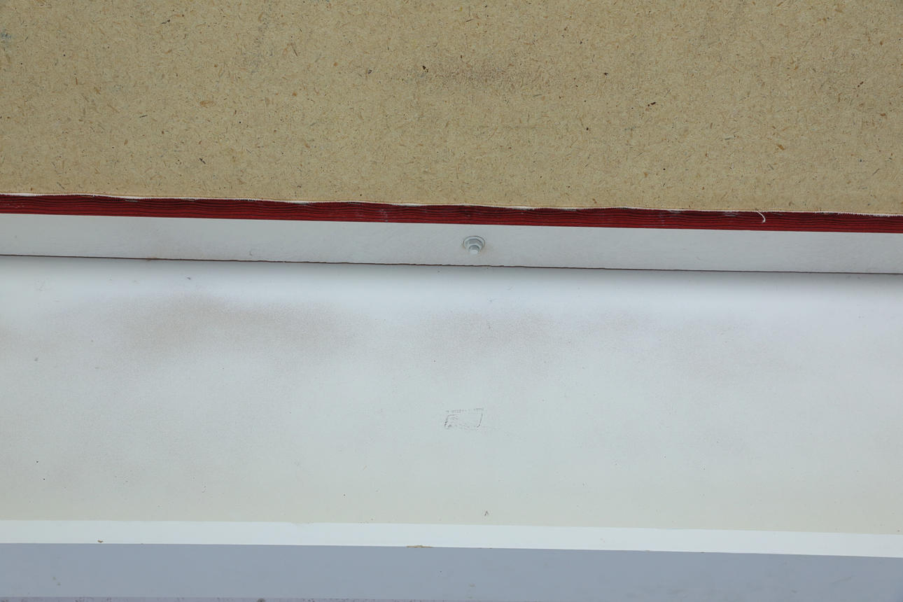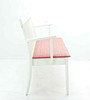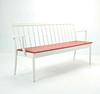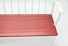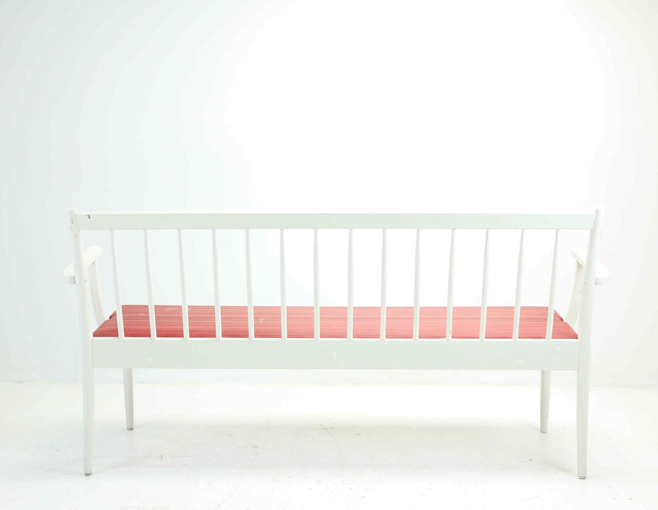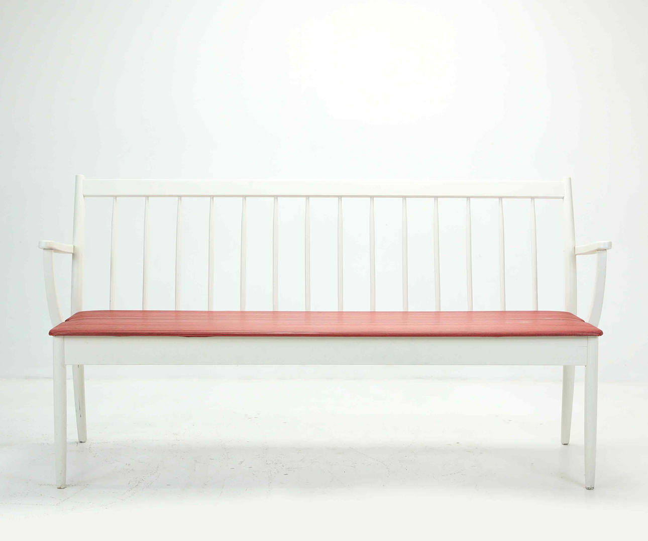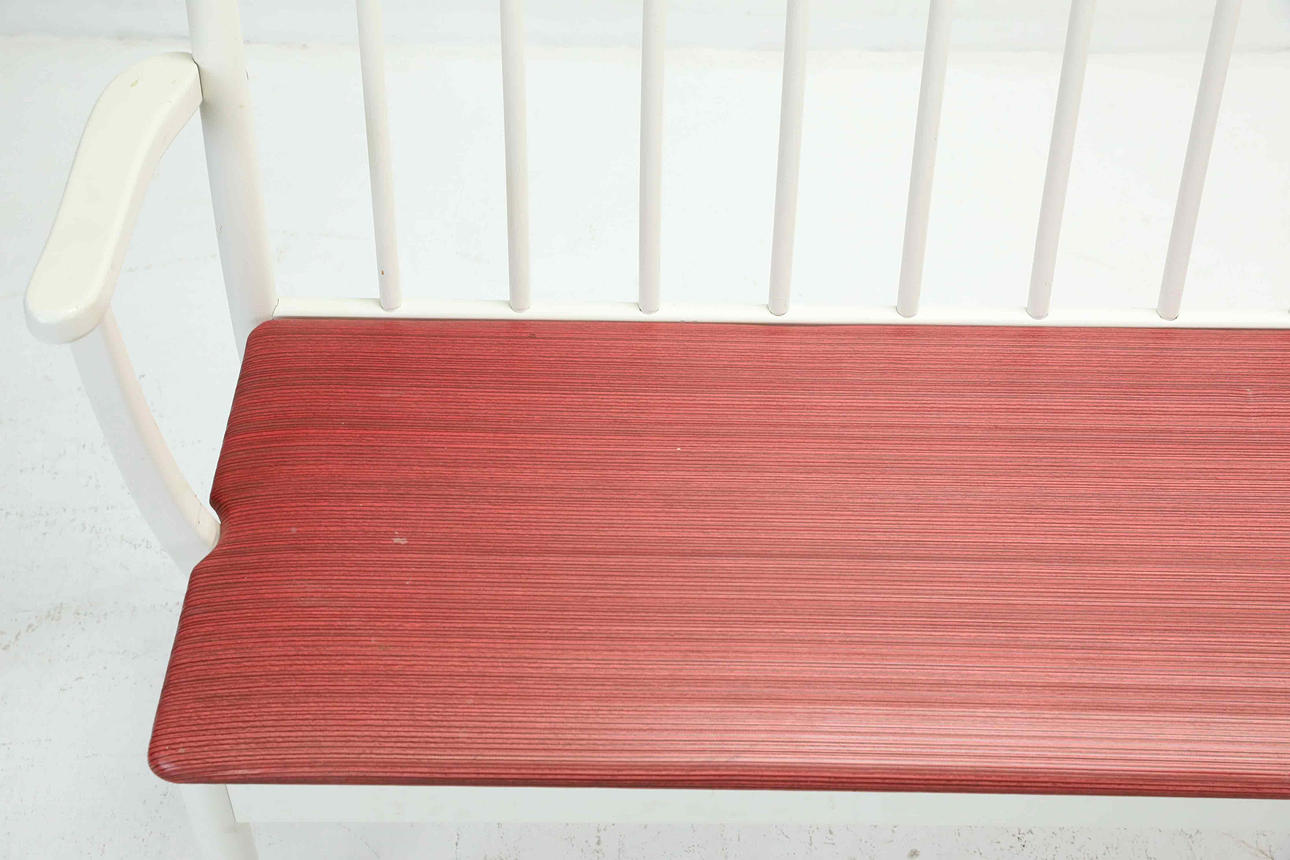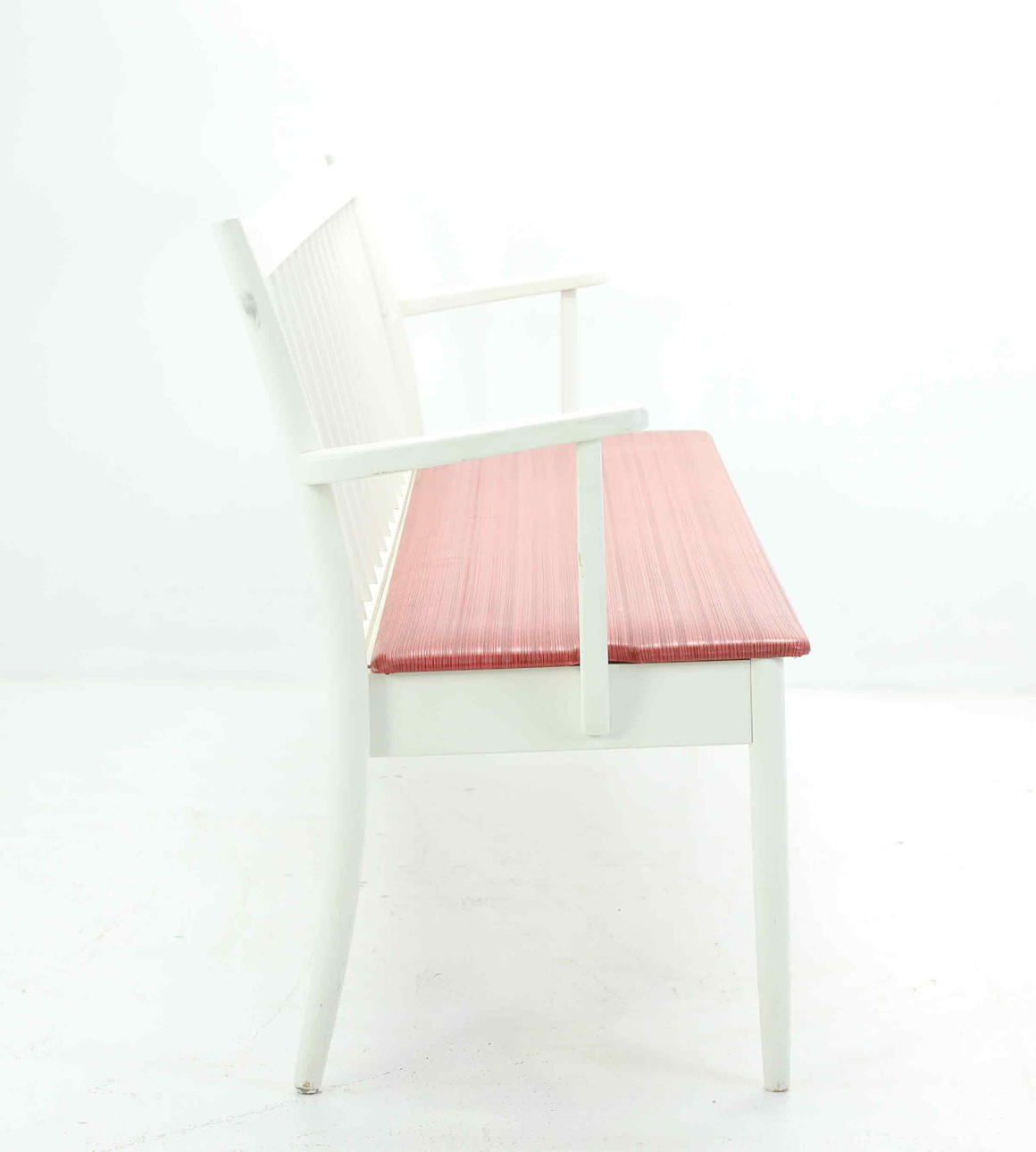 Stämpelmärkt. Vitmålad, rygg med spjälor, Löstagbar sits klädd med rödrandig galon, mindre förvaringsplast under.