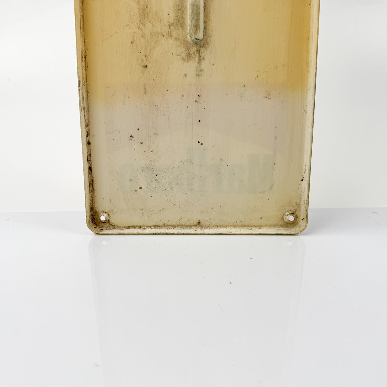 Gulnad, smutsad, fläckar, slitage.