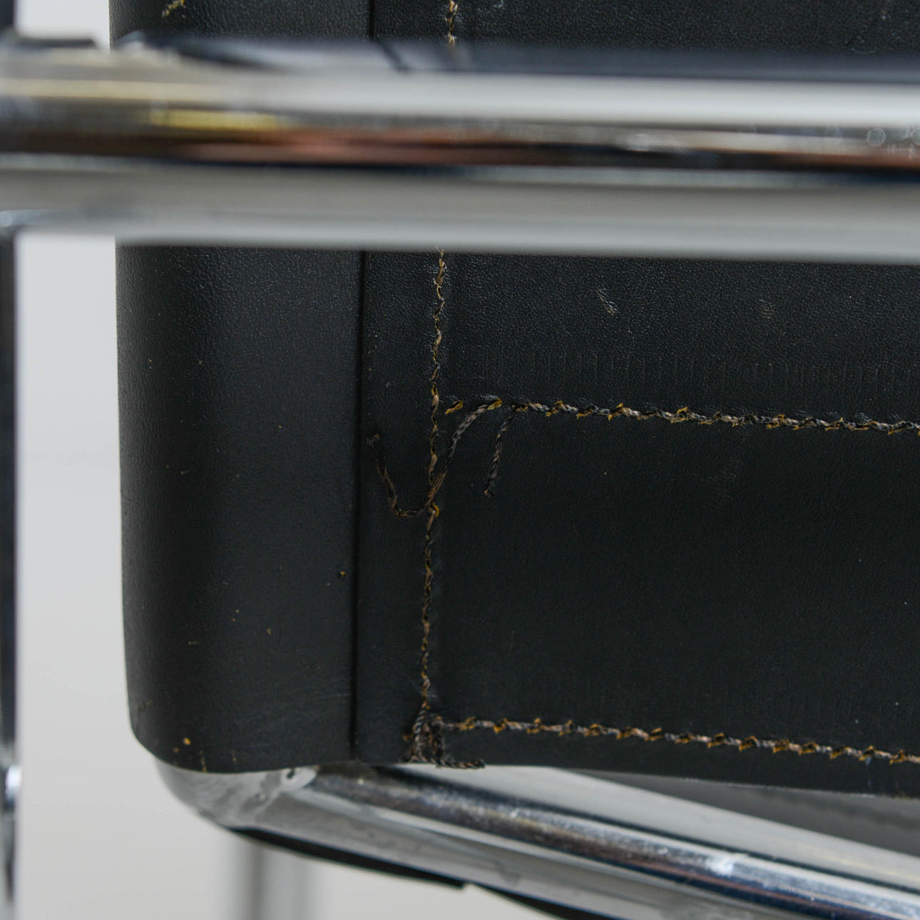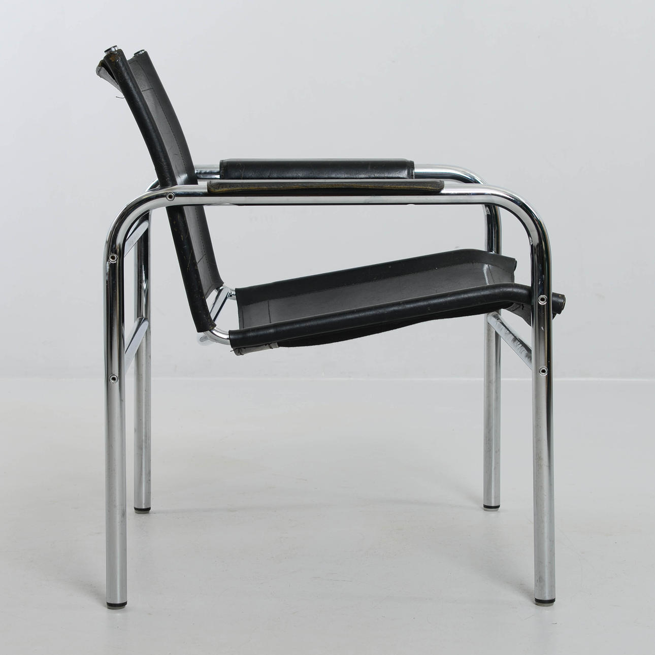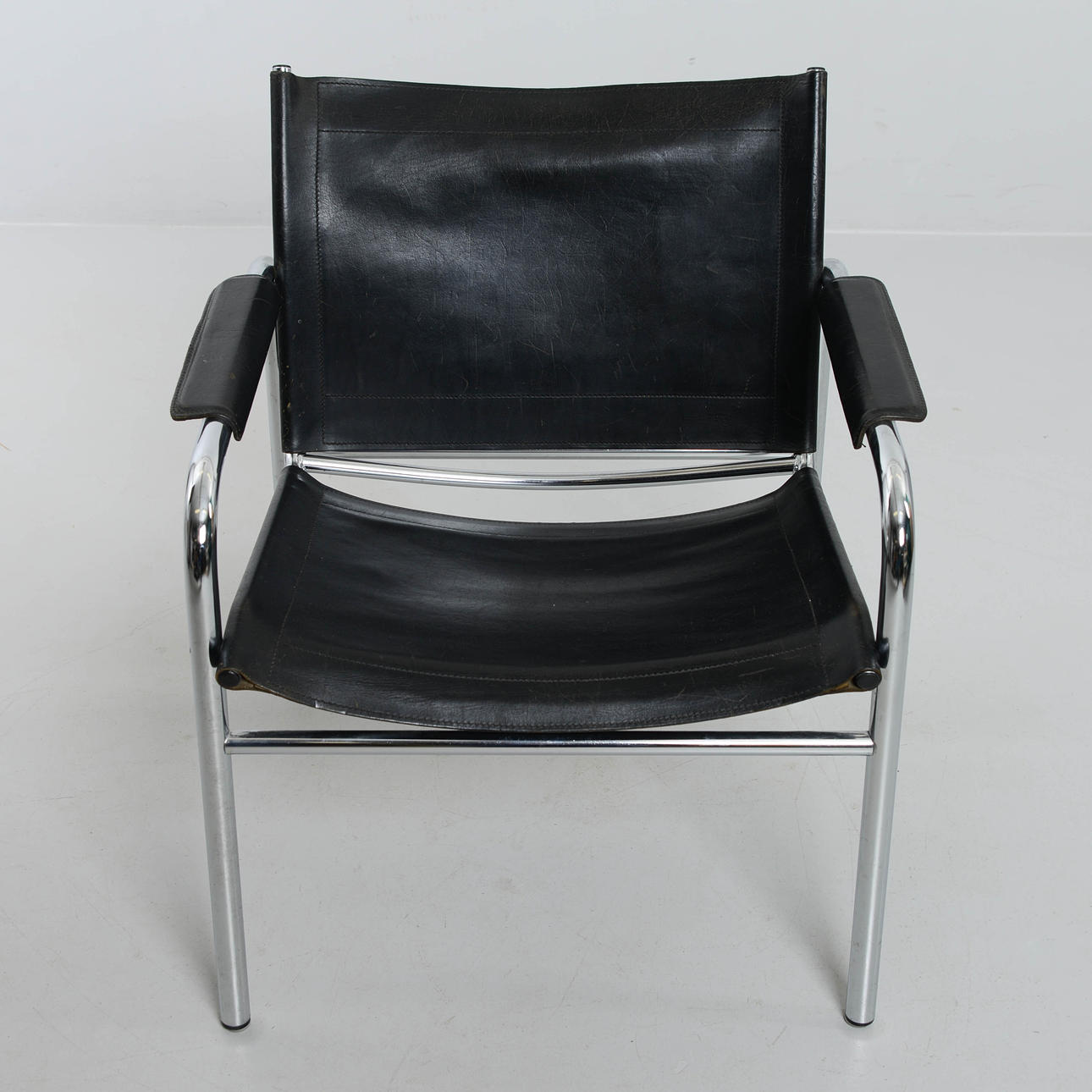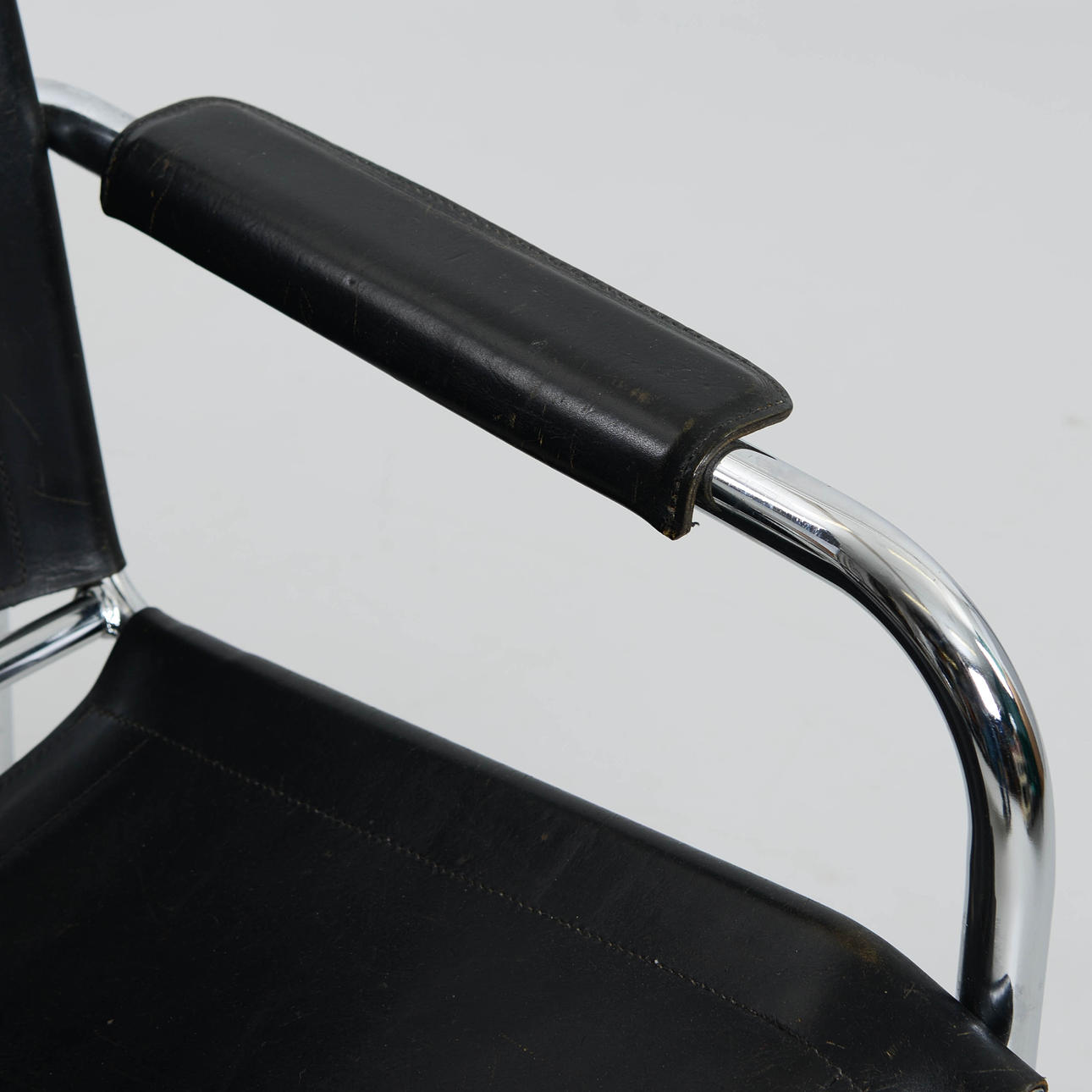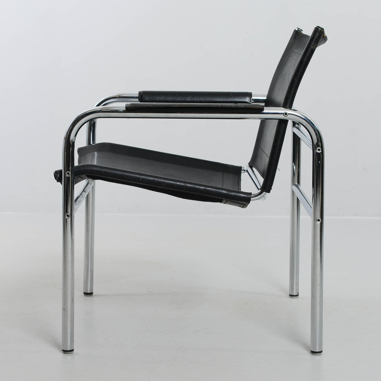 Svart klädsel i skinn. Stomme i kromad metall.