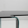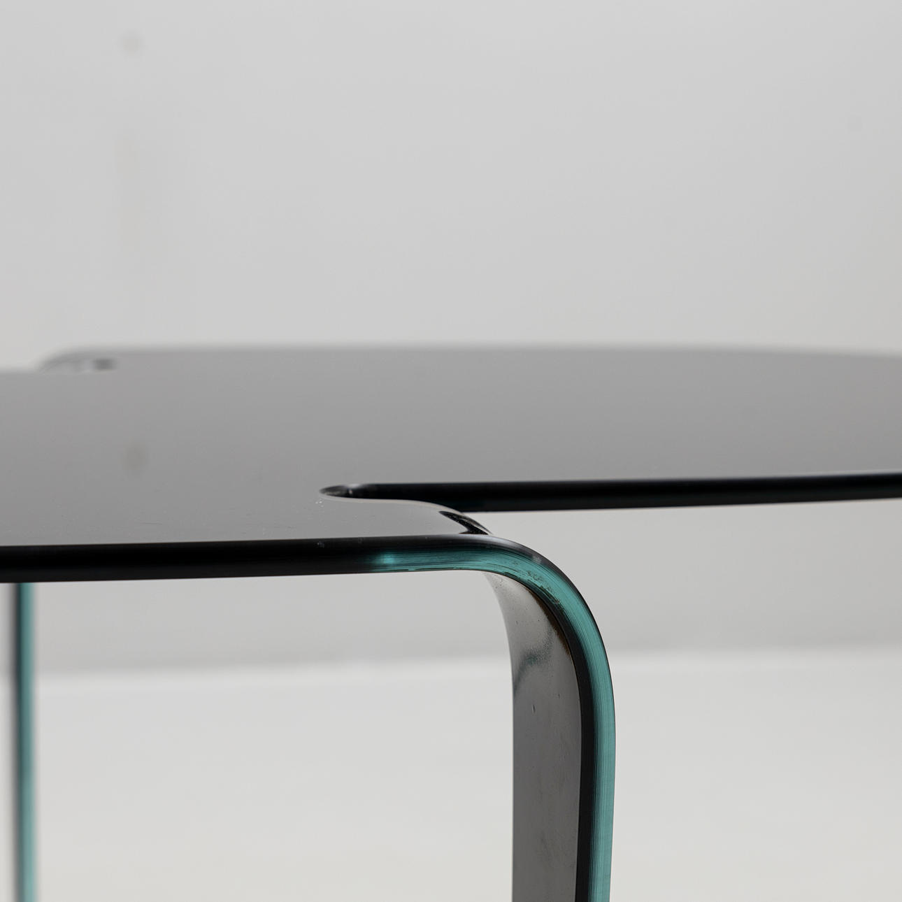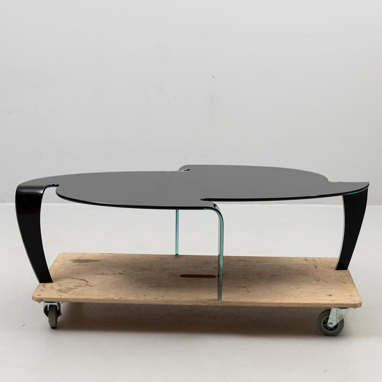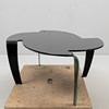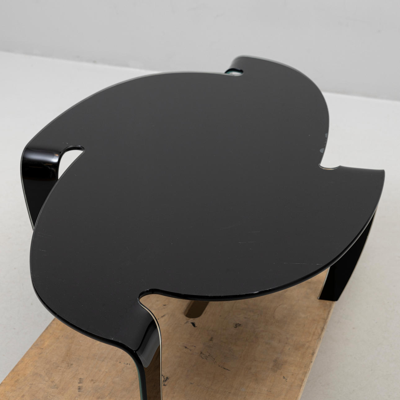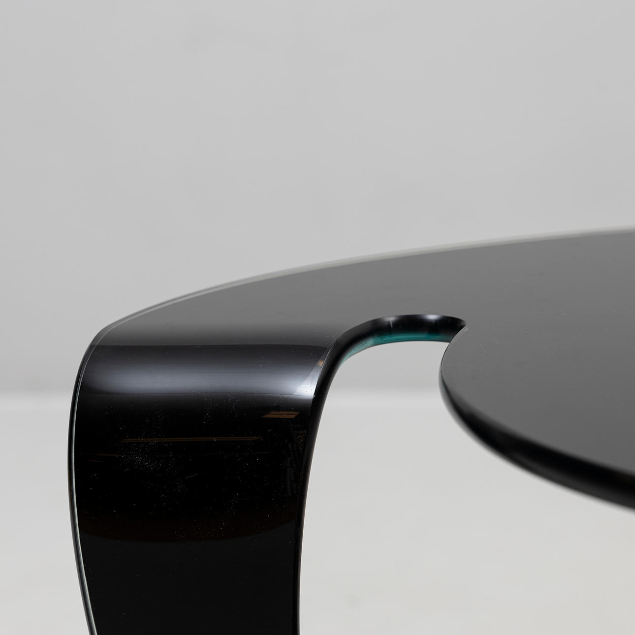Oval molnformad skiva som fortsätter i fyra ben i svart glas. 137 x 80 cm, höjd 37 cm.