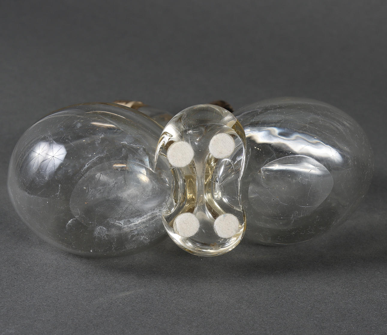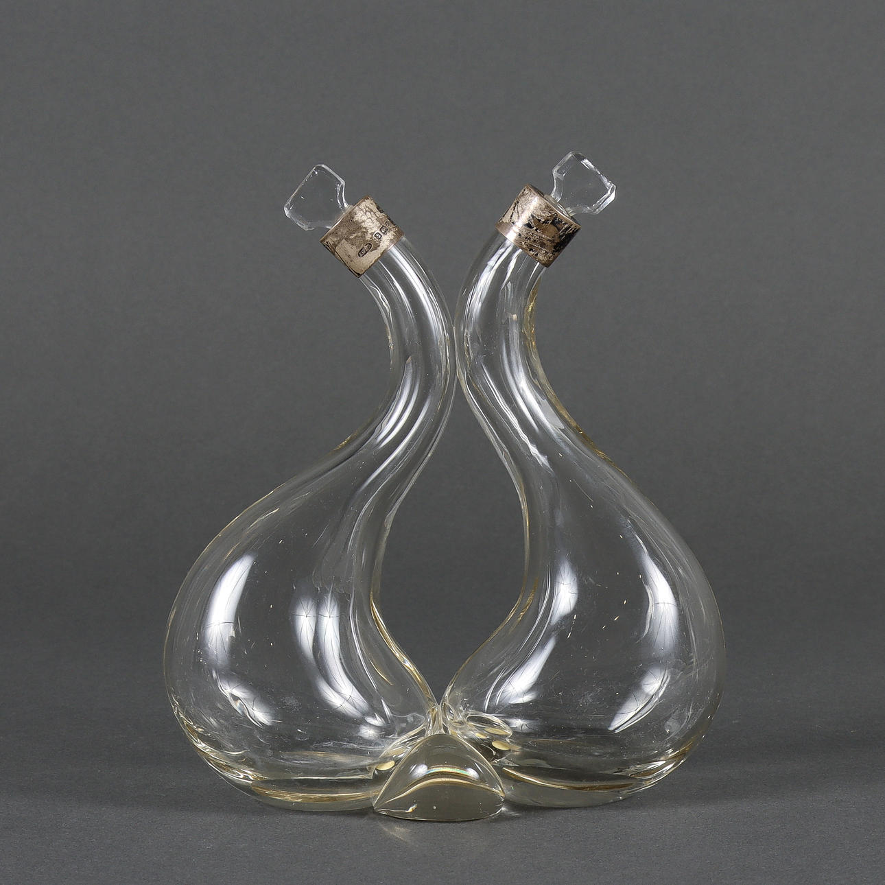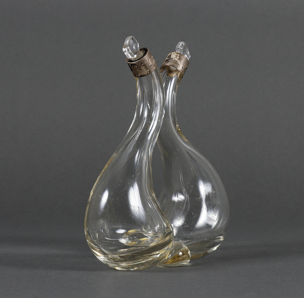 Glas med silvermonteringar. Lösa glasproppar.
