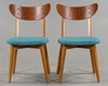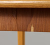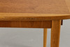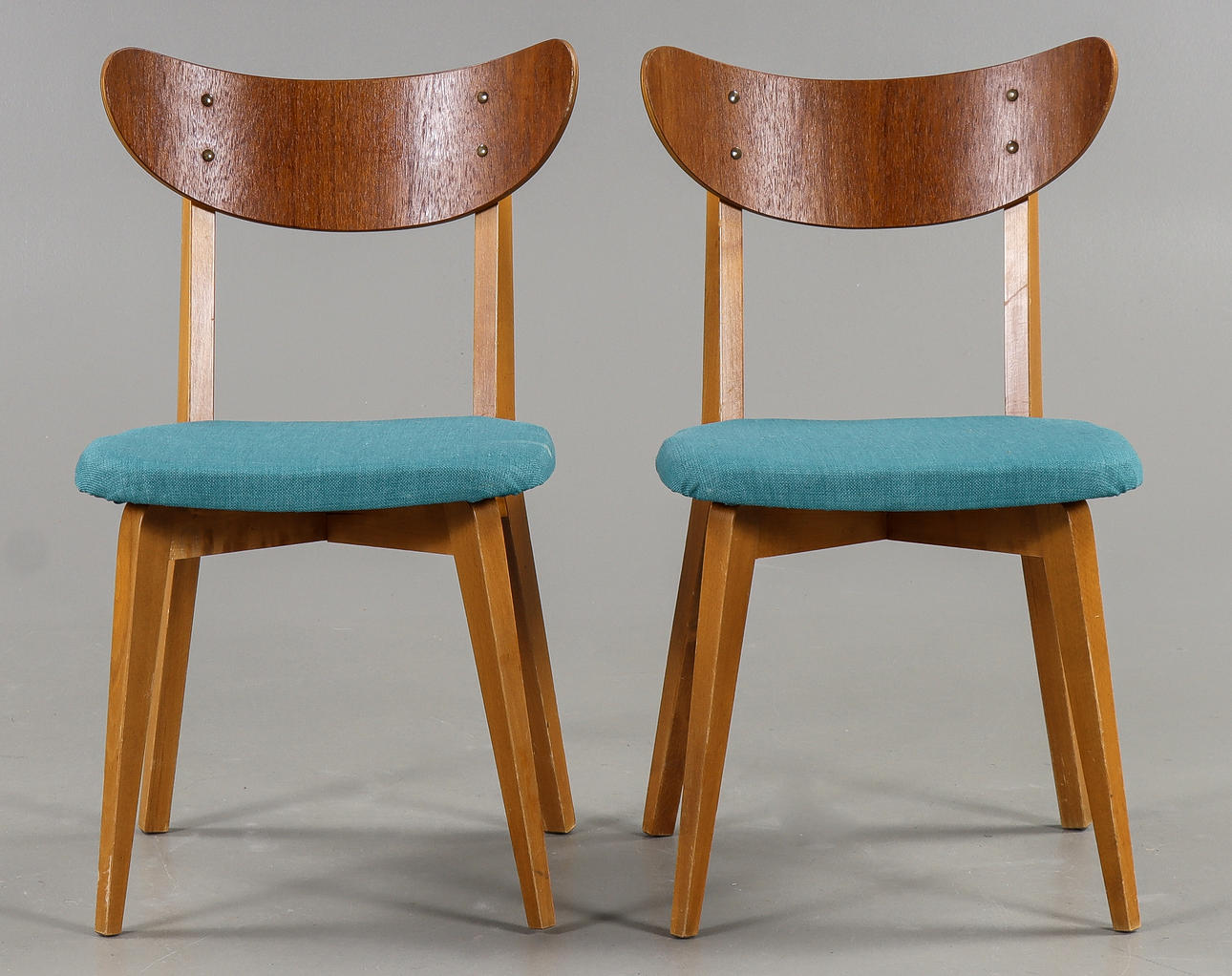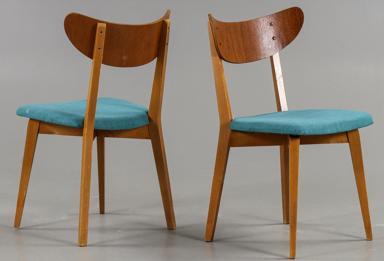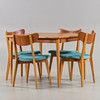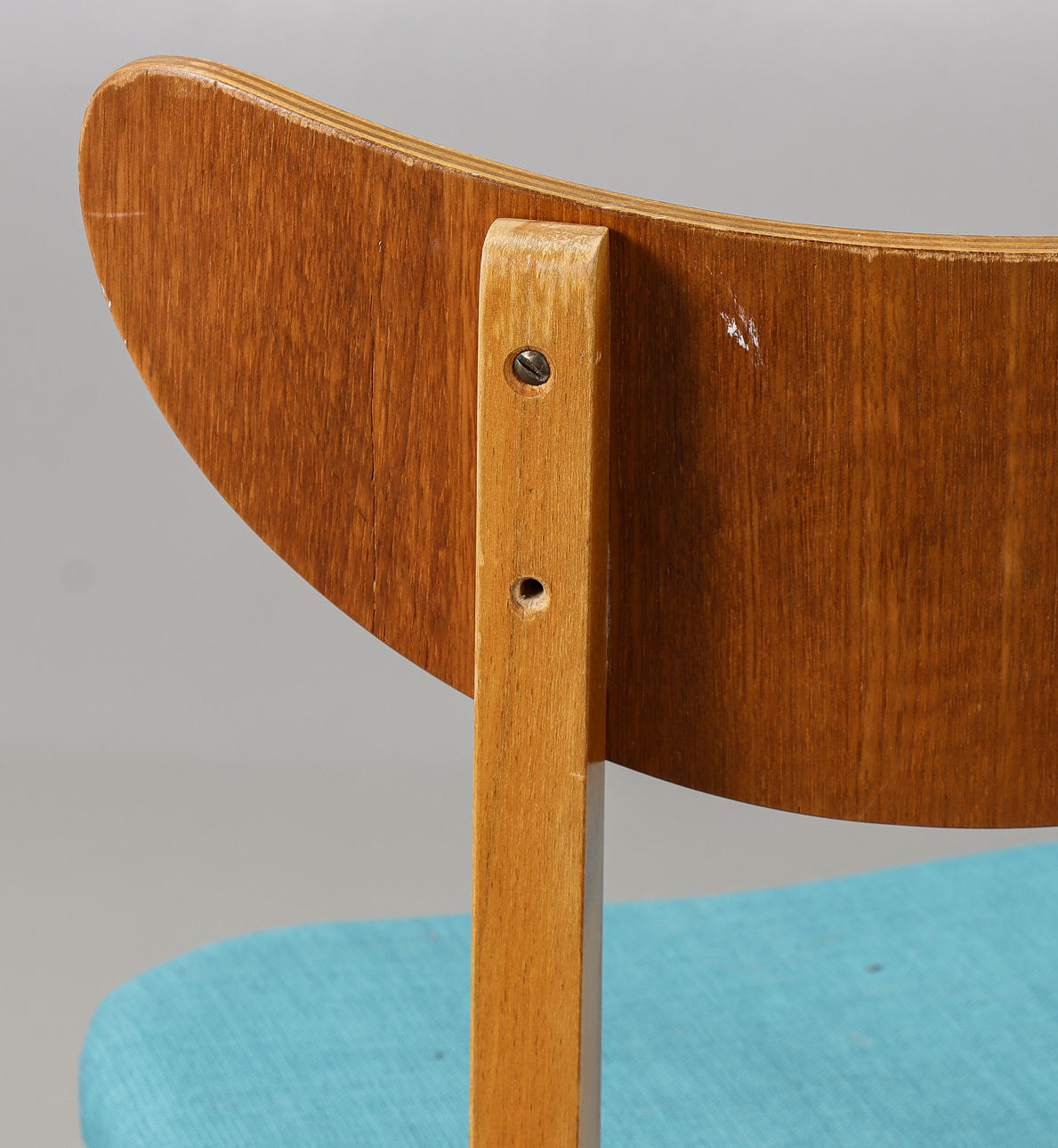 Några skruvar saknas, sprickor, 1 stol ostabil, skavmärken, repor, fanerskador.