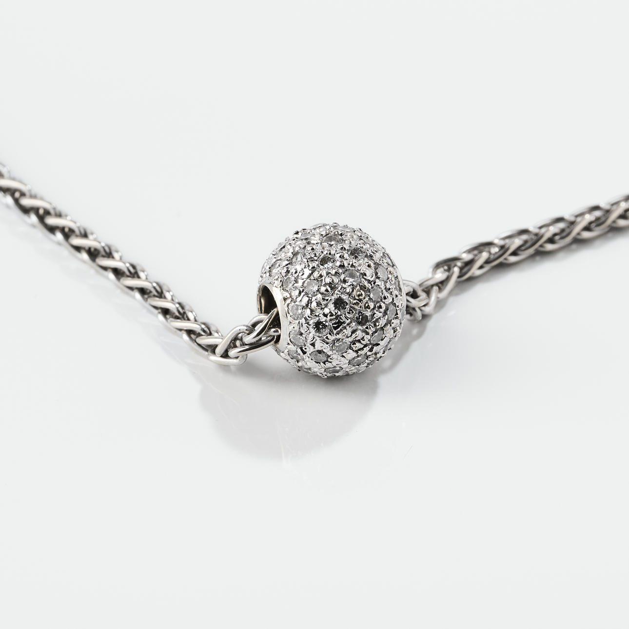 Fantasilänk med kula, pavéinfattad med ca 80 stycken briljantslipade diamanter, ca 0,80 ctv. L ca 50 cm. Vikt ca 16 gram.