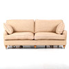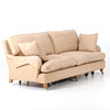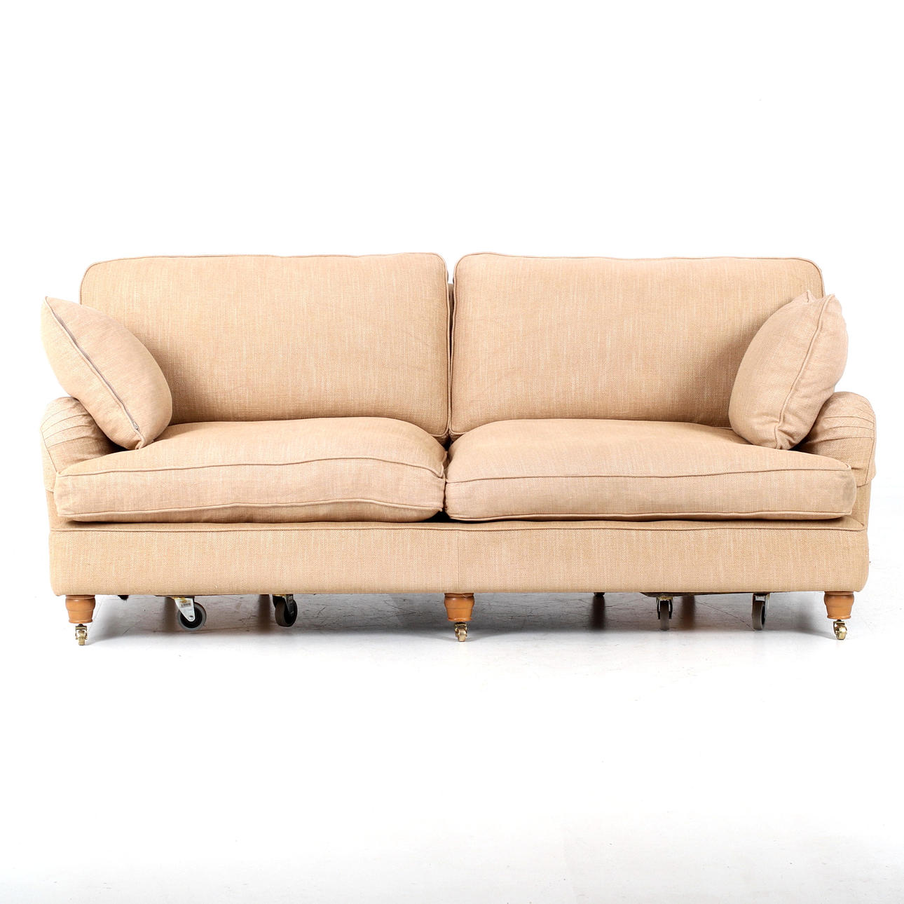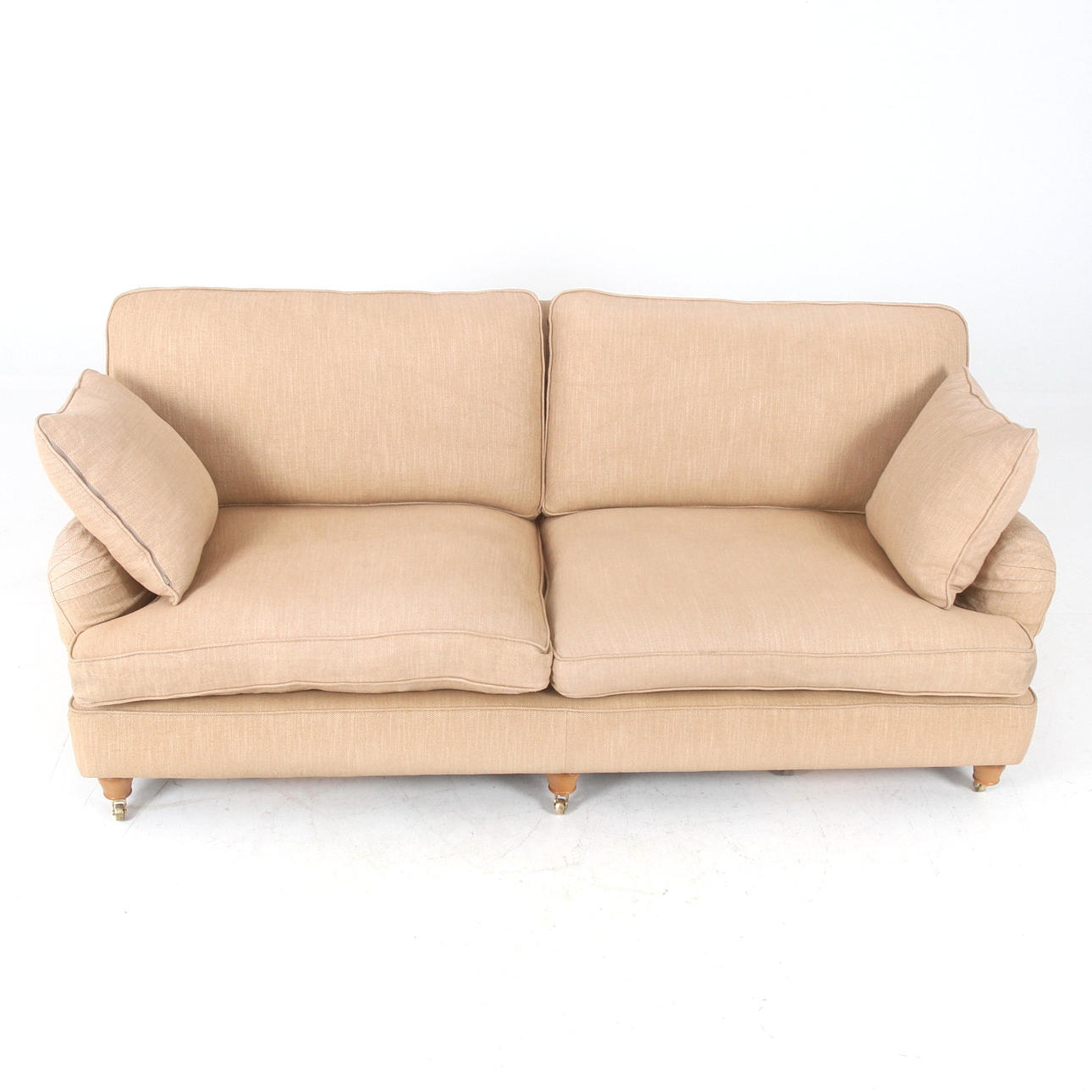 Lösa plymåer i rygg och sits. Avtagbar, tvättbar klädsel. Ett extra mässingshjul medföljer.