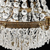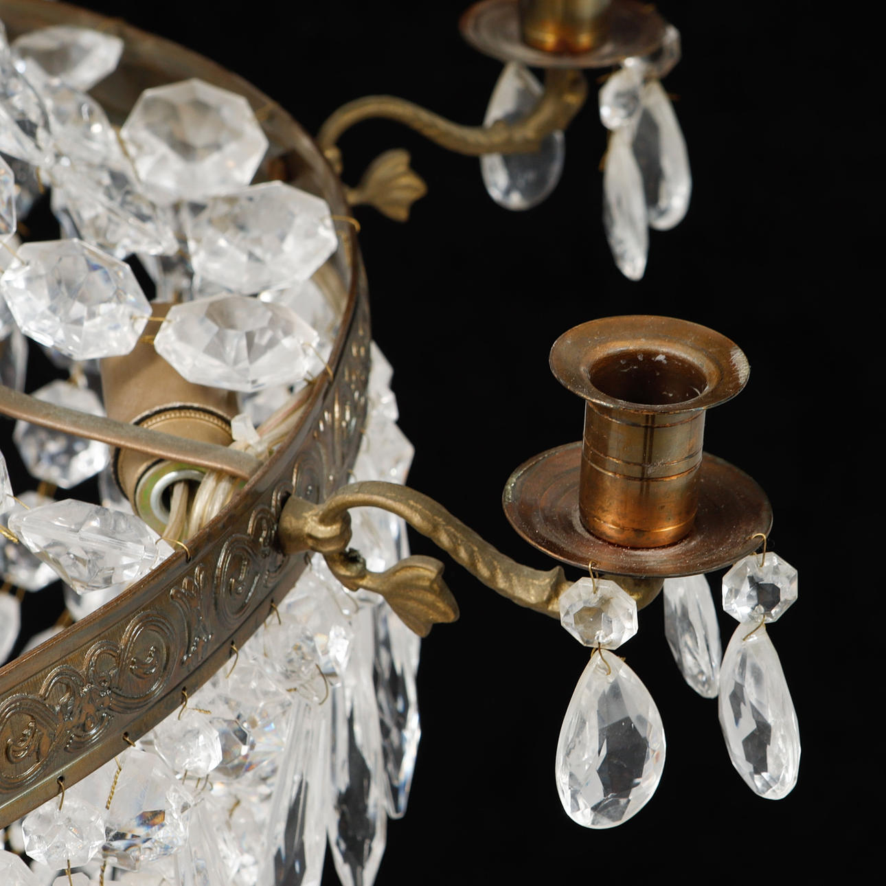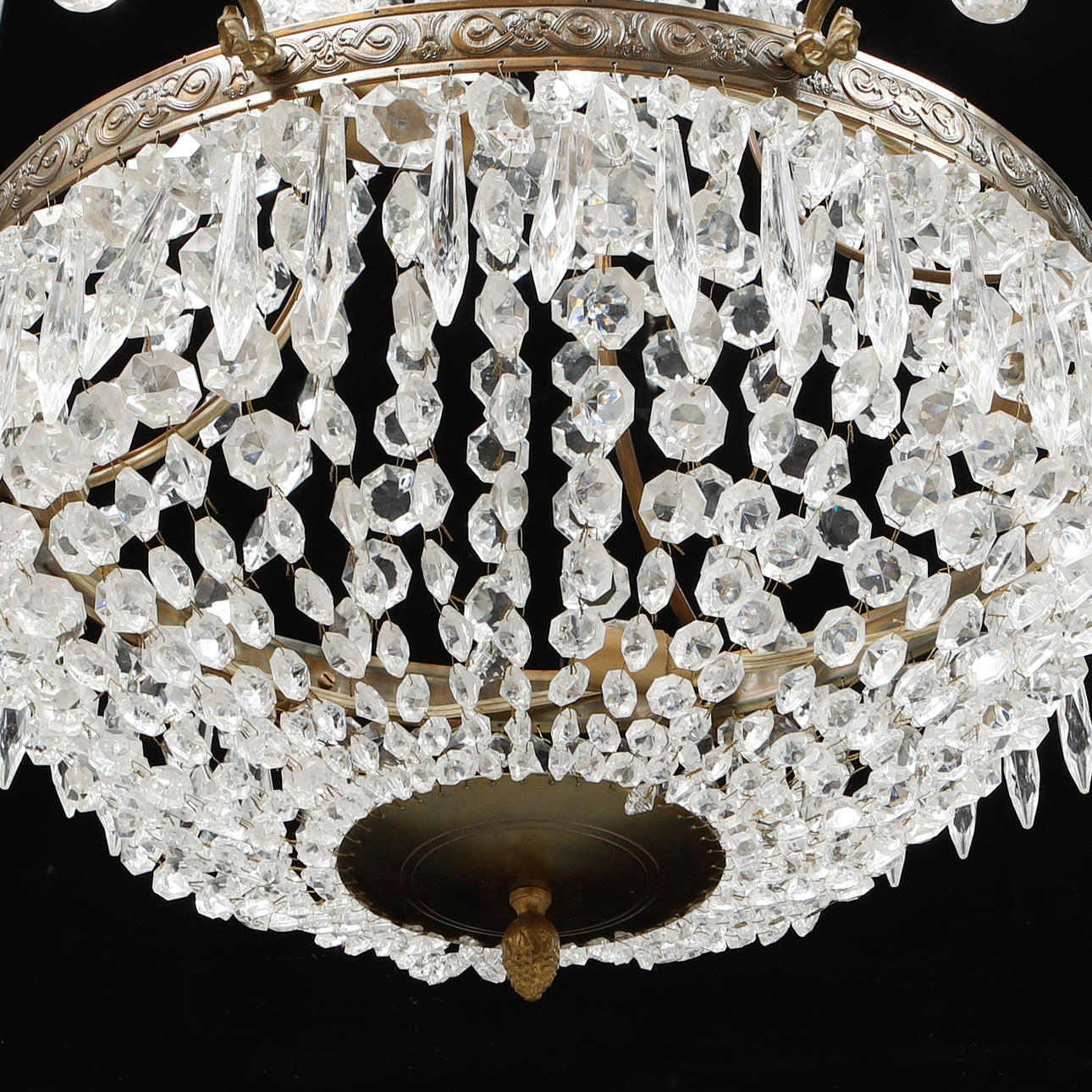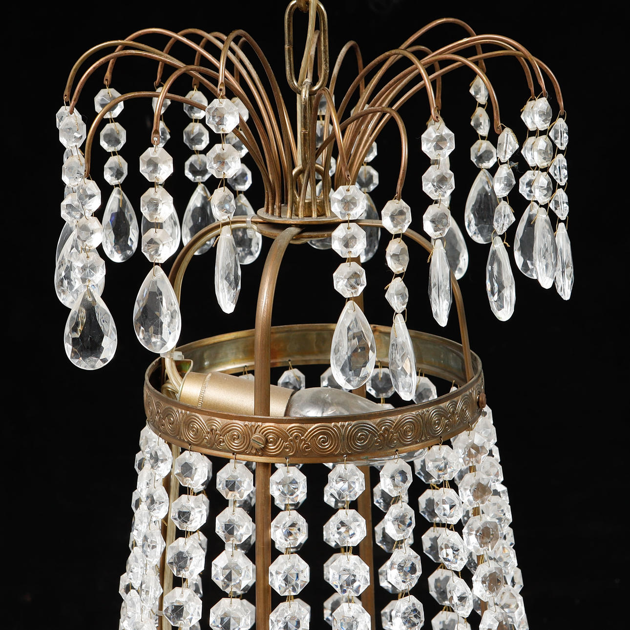 Stomme i gulmetall behängd med olikslipat glas. Åtta ljusarmar. Diameter ca 62 cm, höjd ca 78 cm.