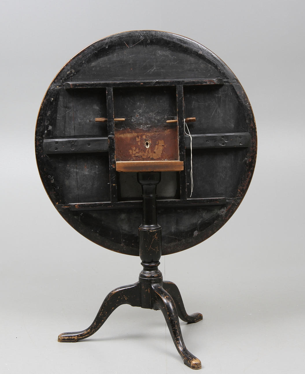 Rund rotfanerad skiva på svärtad 3-grenad fot.Diameter 88, höjd 71 cm.