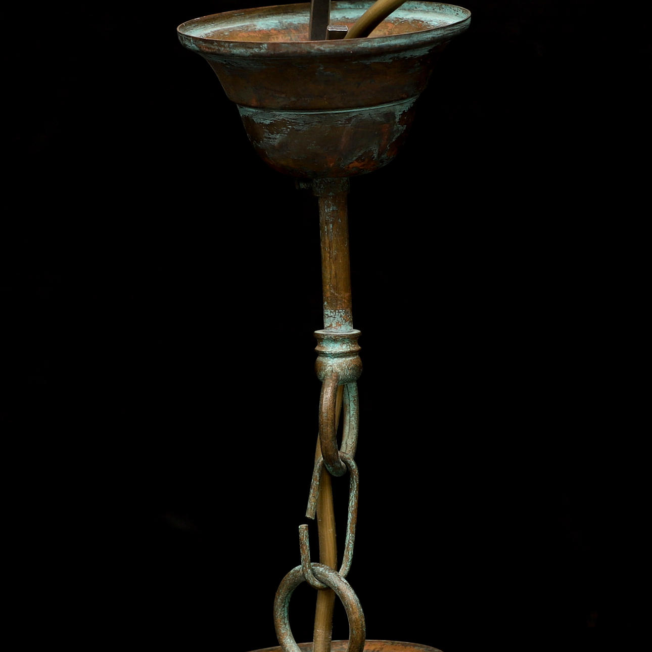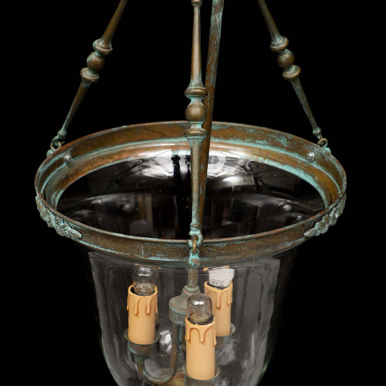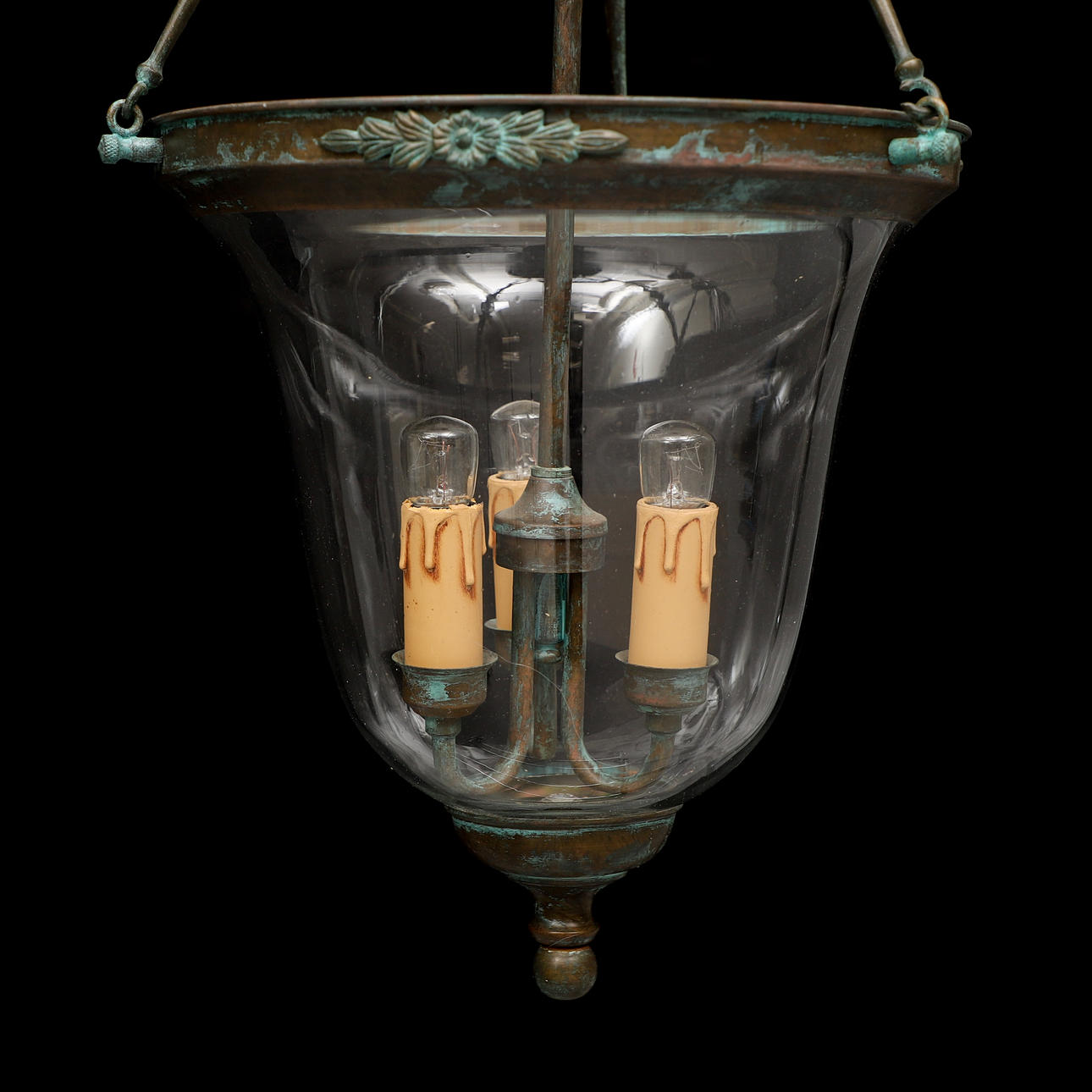 Stomme i metall och kupa i glas. 3 ljuspunkter. Mått: totalhöjd ca 75, höjd kupa 30, diameter kupa ca 26 cm.