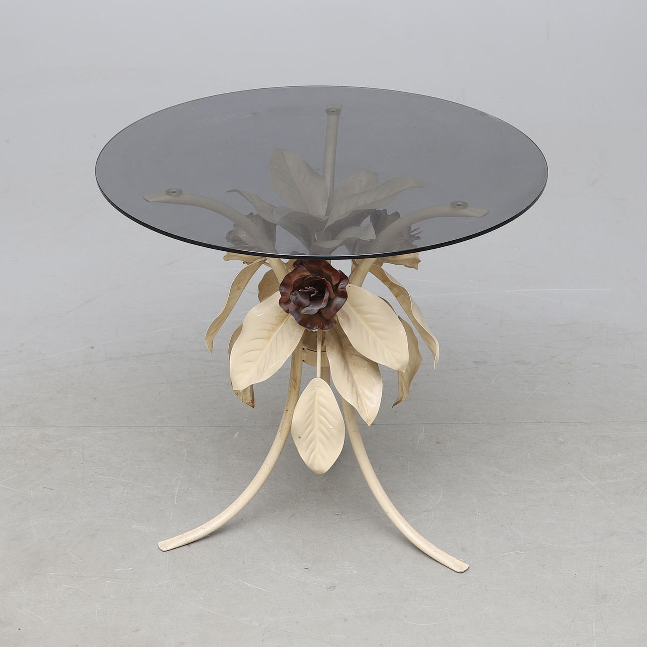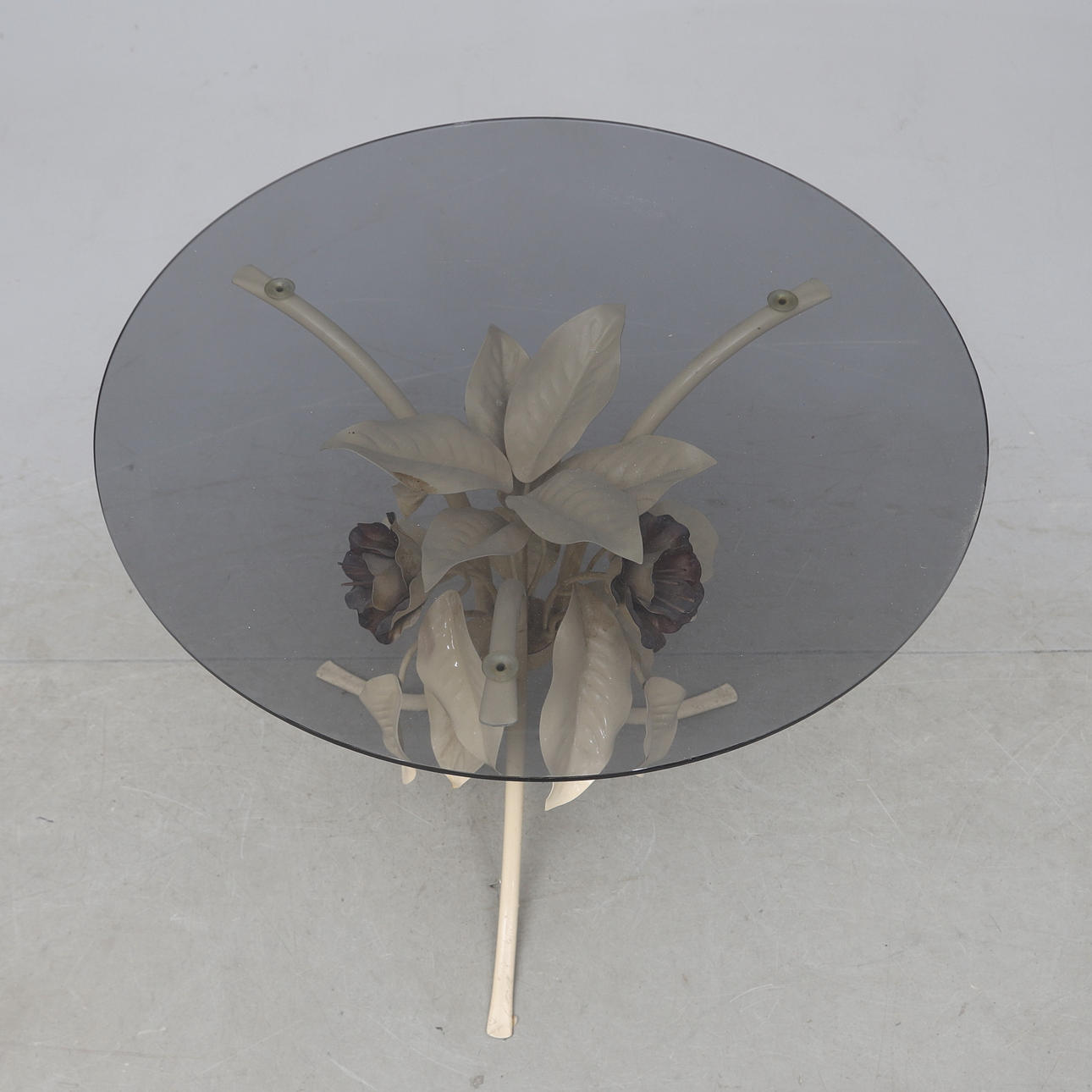 Mörktonad glasskiva. Underrede i målad metall. Diameter ca 60, höjd 55 cm.