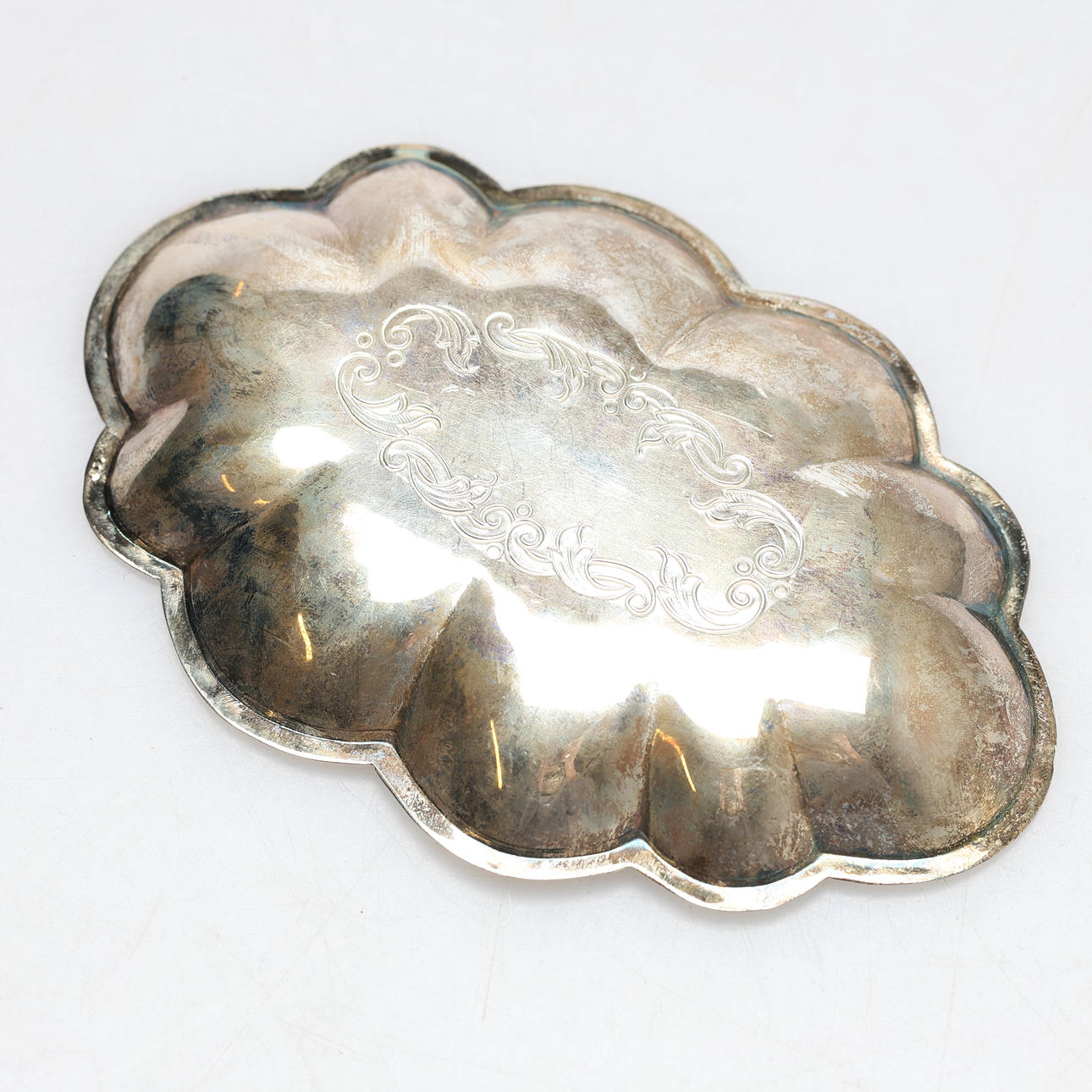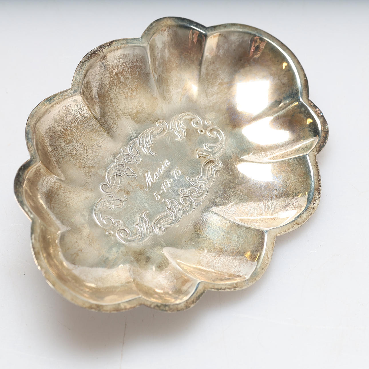 Uppläggningsfat, graverad Maria 5-10-75. Mått ca 14 x 9,5 cm.