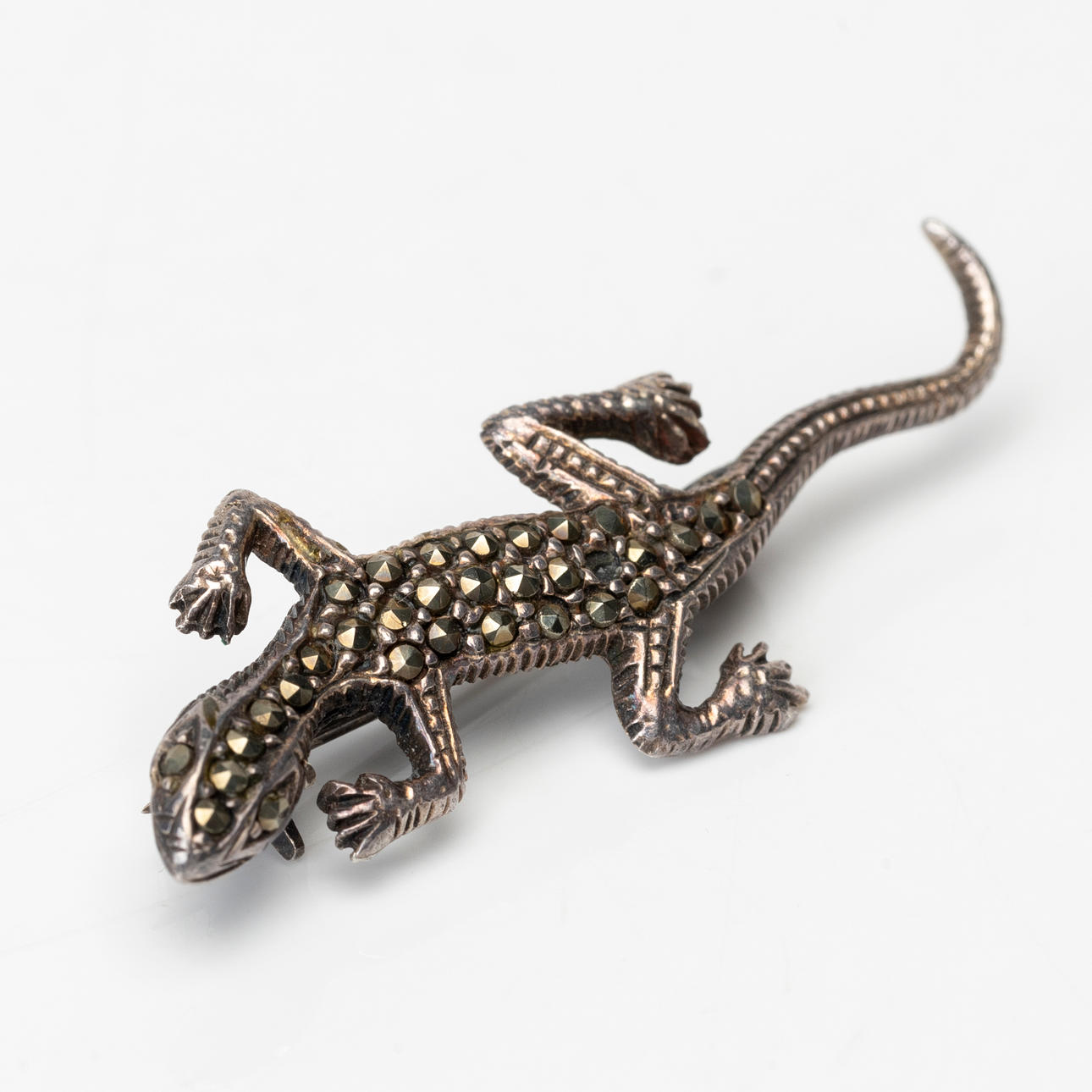 Brosch, sterlingsilver i form av en ödla med markasiter, längd ca 4,3 cm.