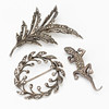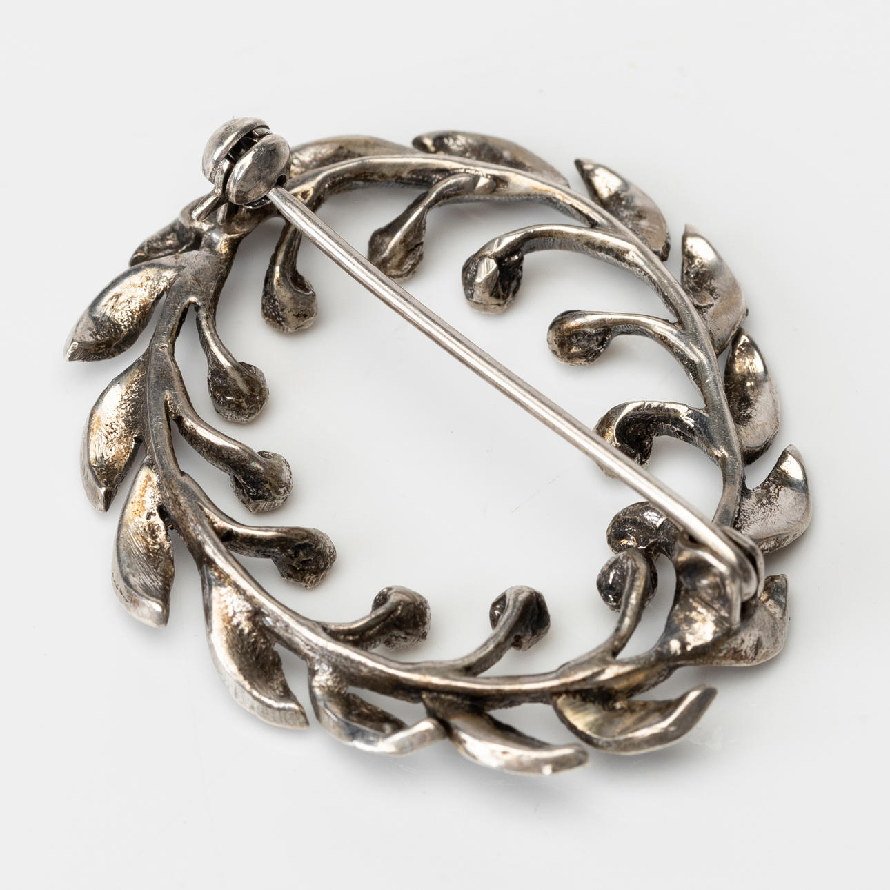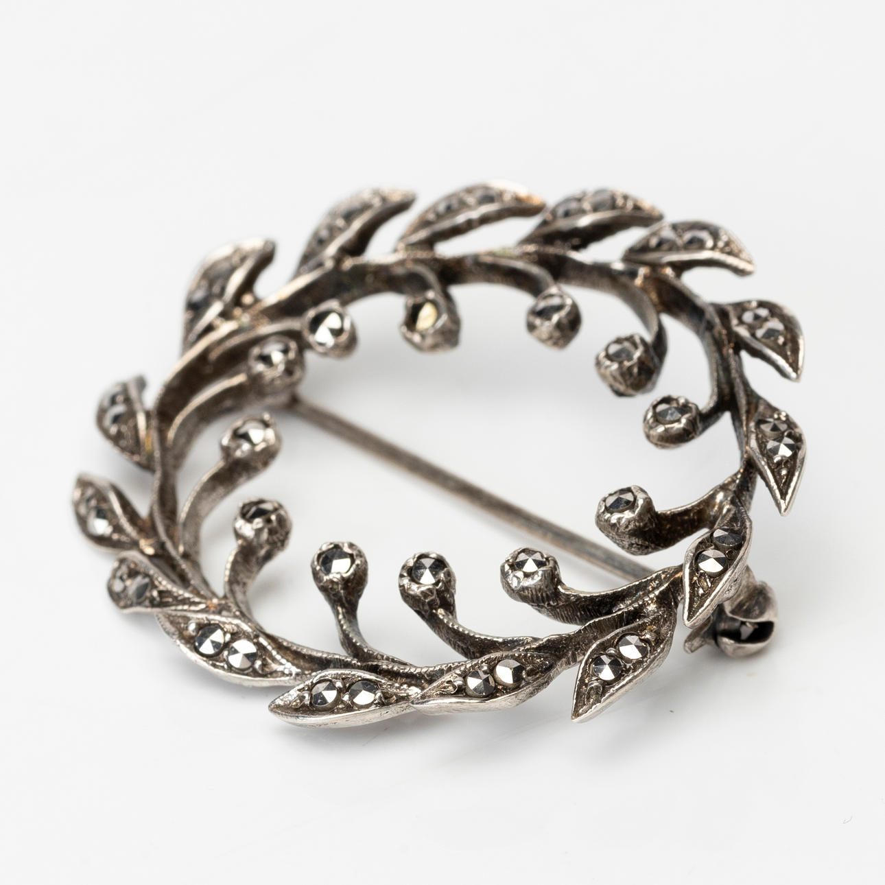 Brosch, silver, med markasiter, kransformad, bredd ca 3,5 cm.