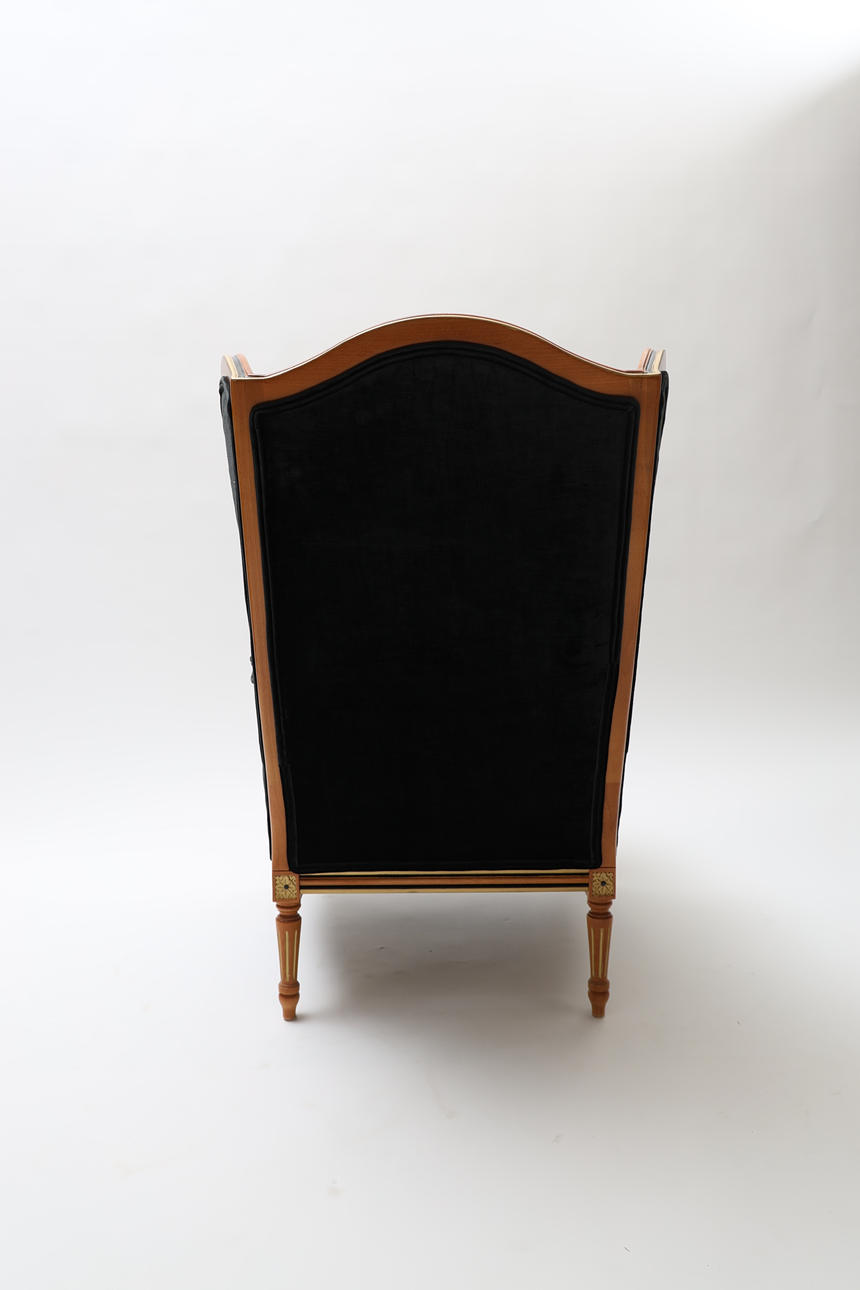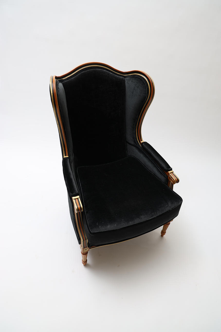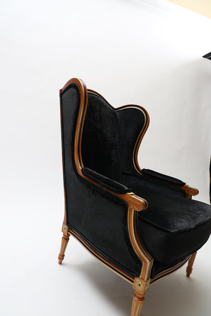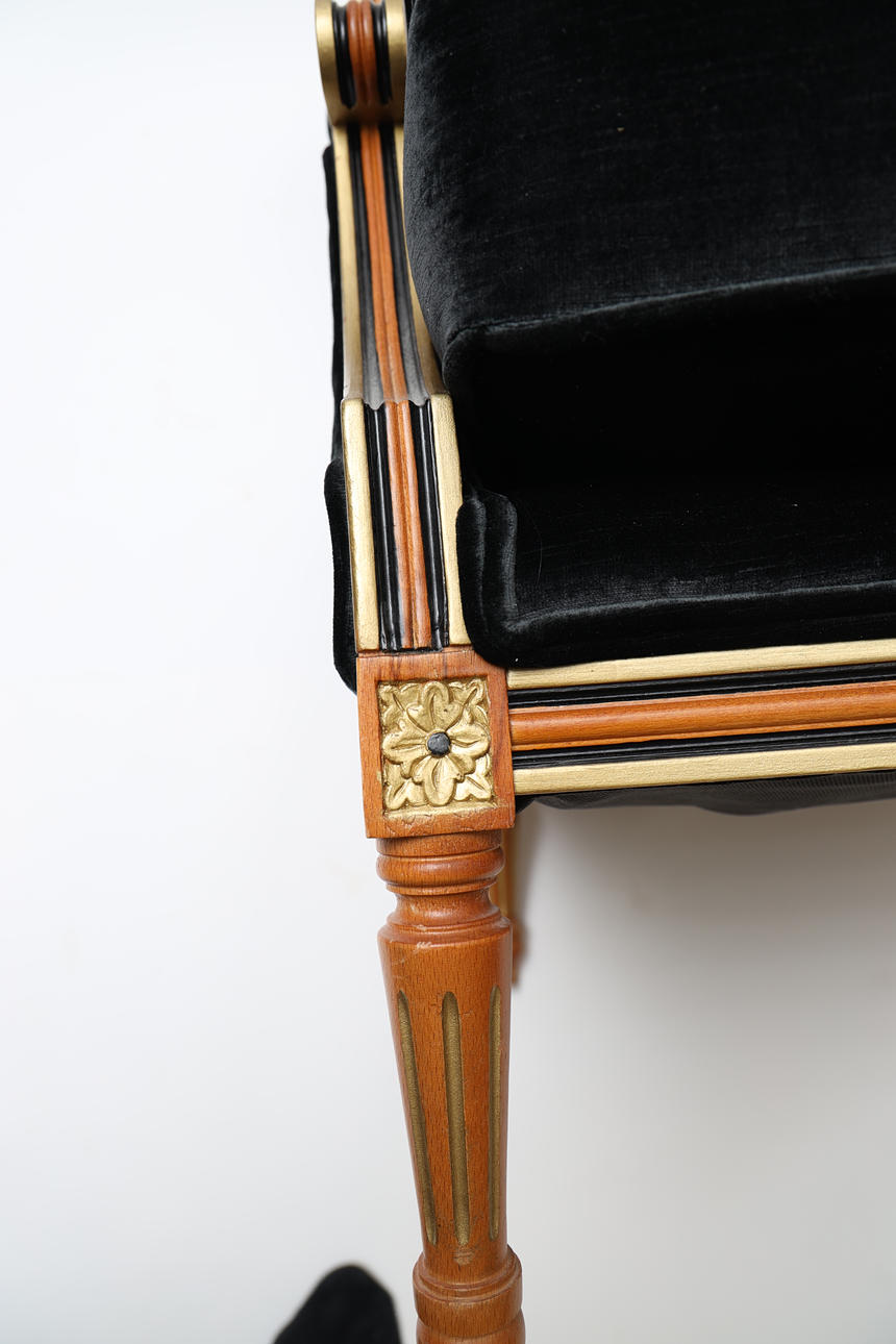 Delvis bemålat och bronserat trä. Textil klädsel. Kanelerade ben. Lös sittdyna.
