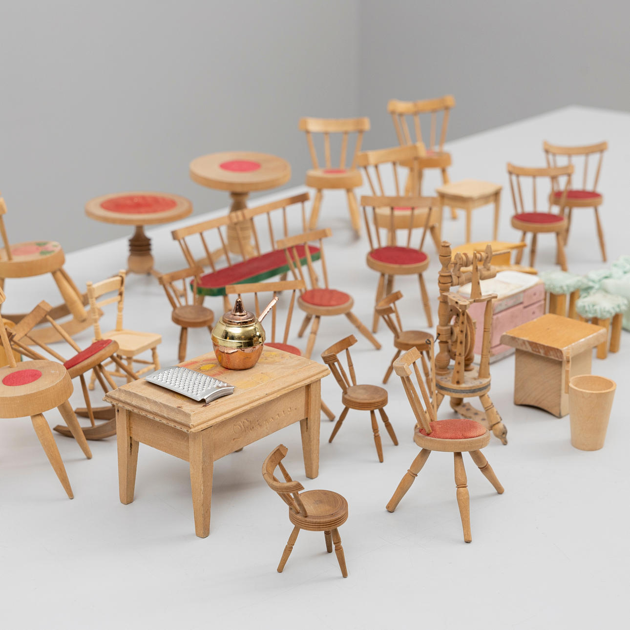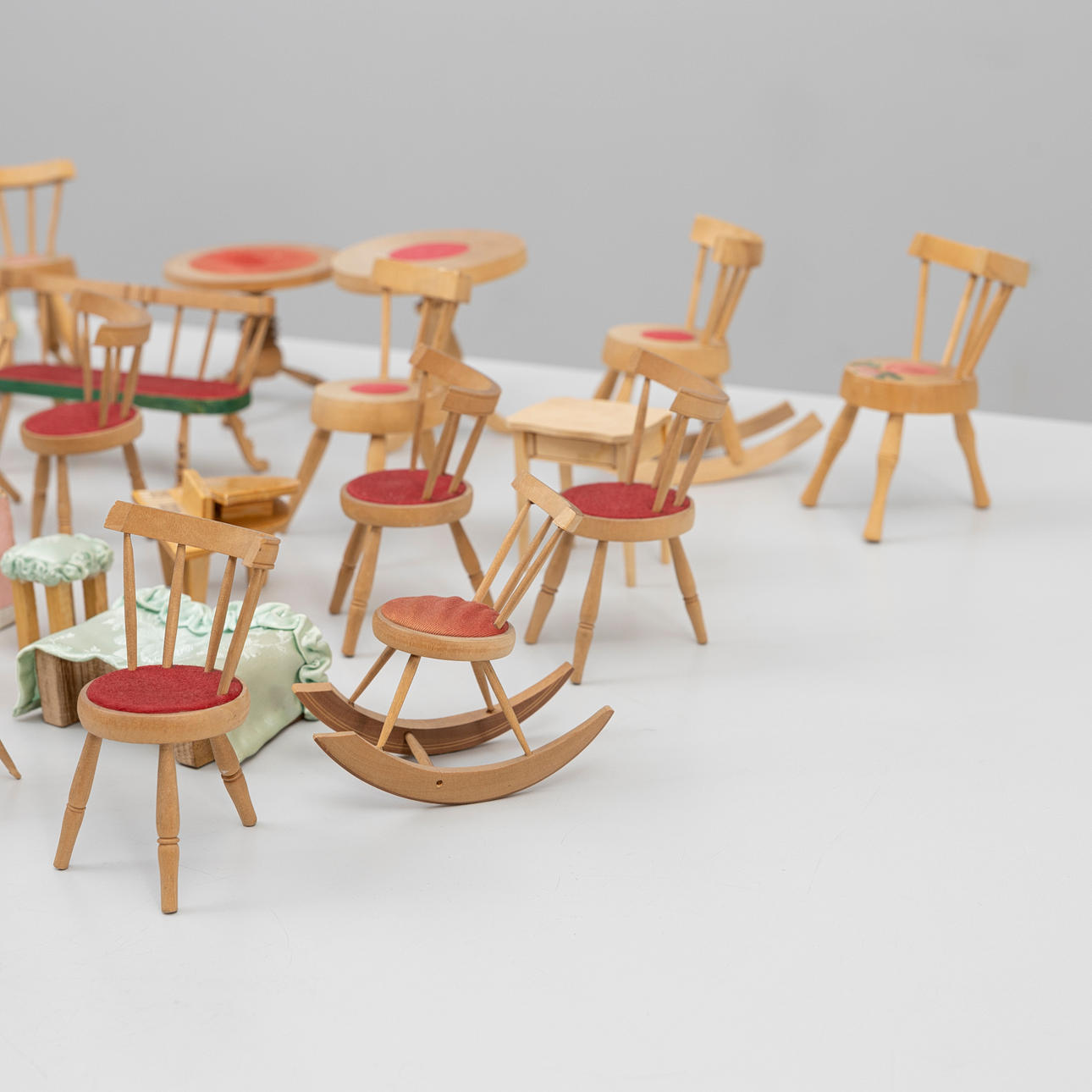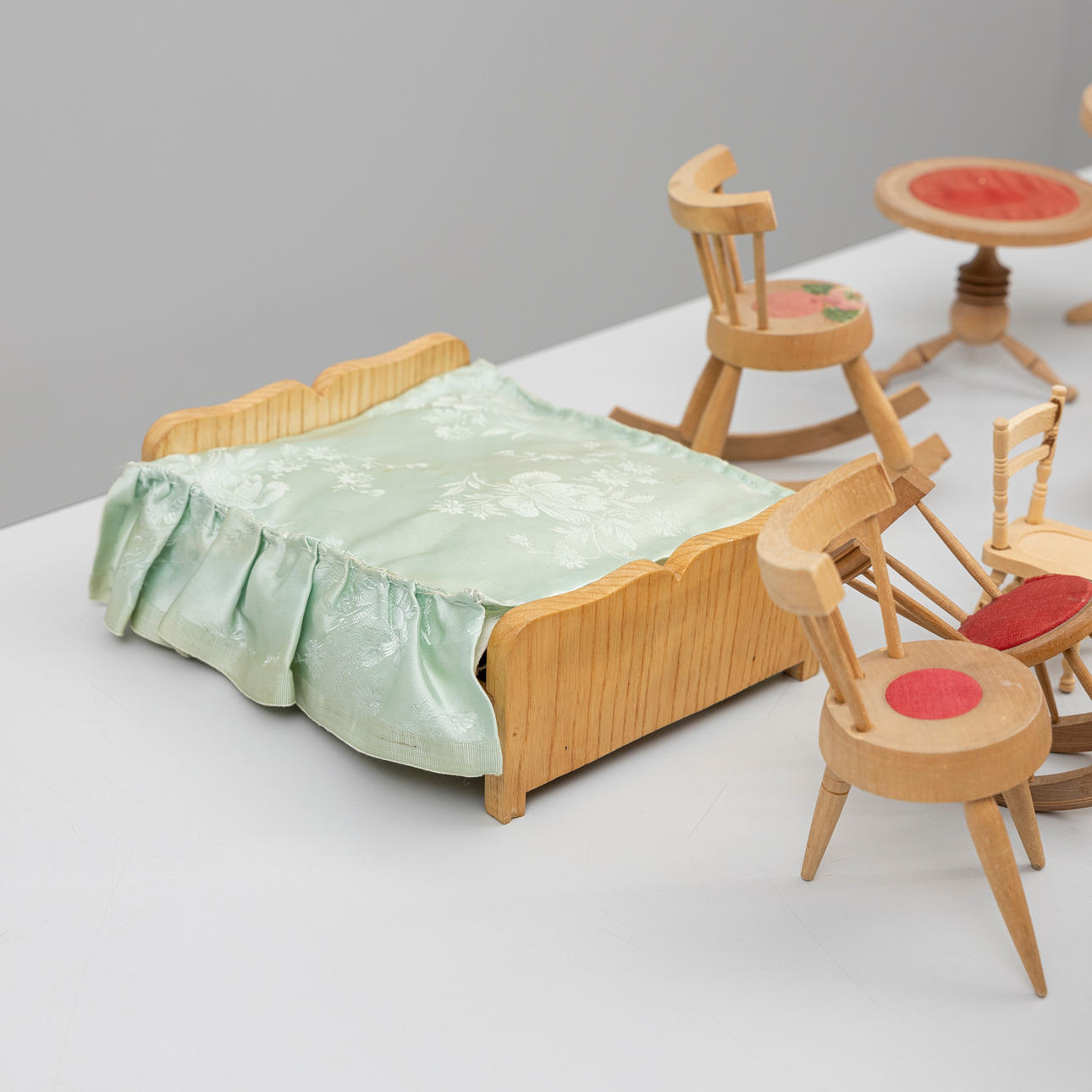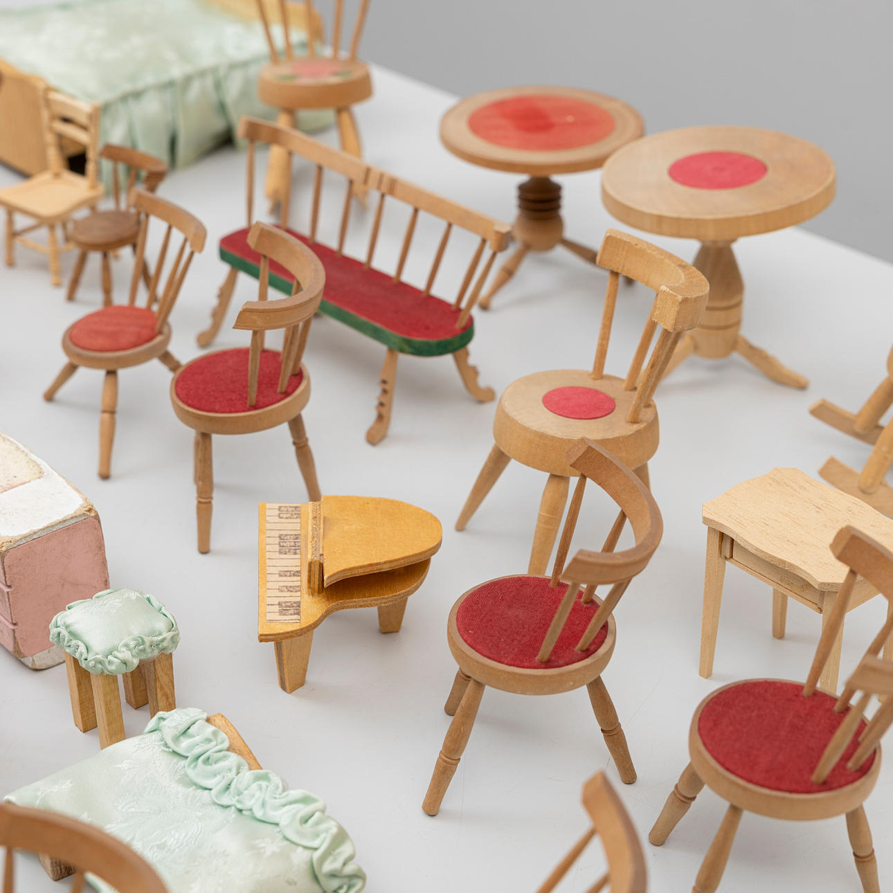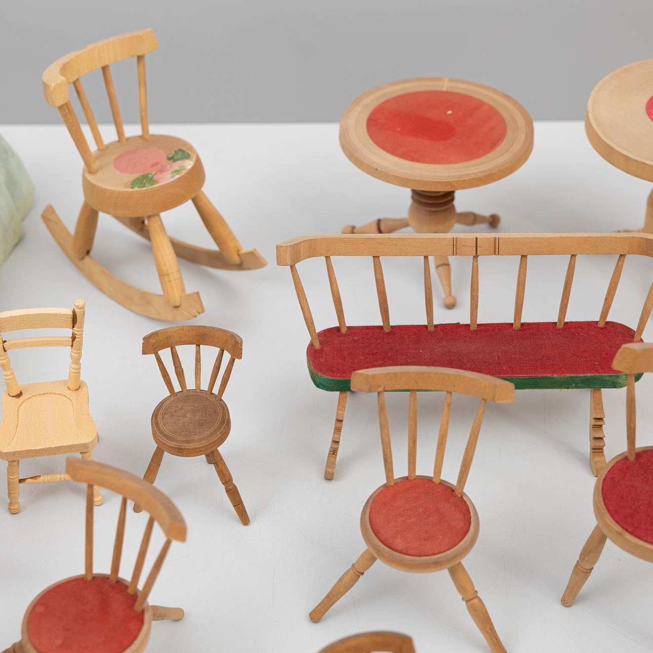 Innehållande stolar, bord, soffa, säng med mera. Soffans längd ca 16 cm.