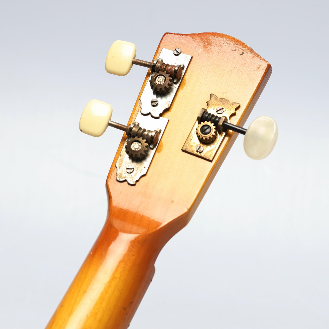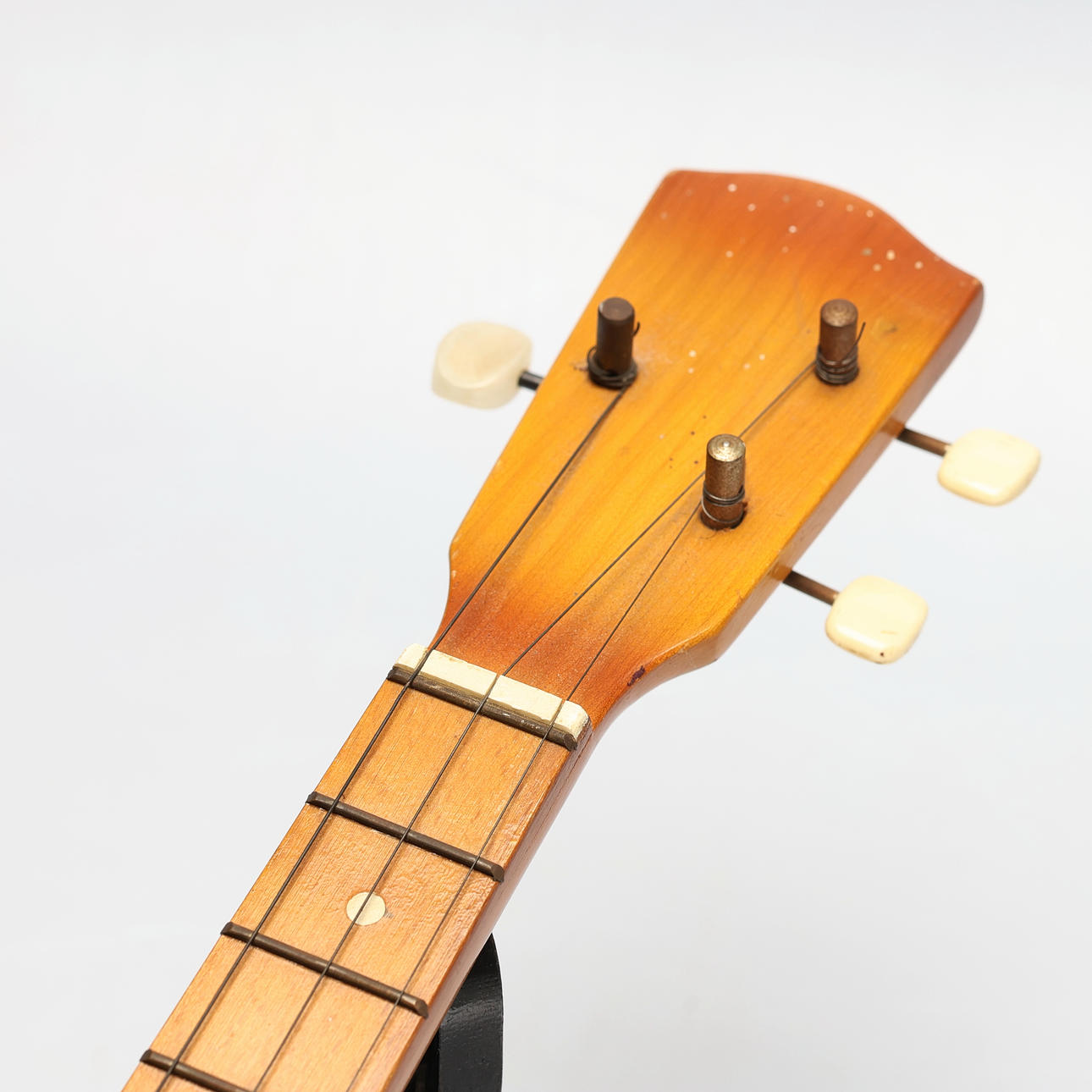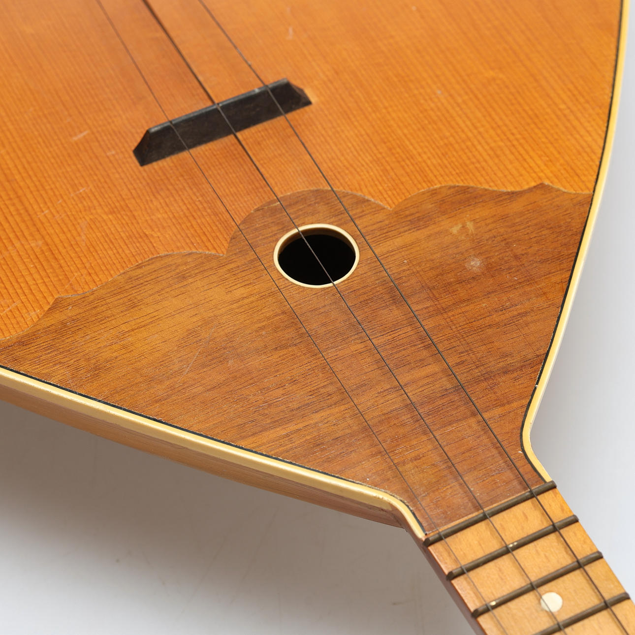 Bruksslitage samt spricka i trä bakom strängar.