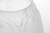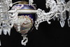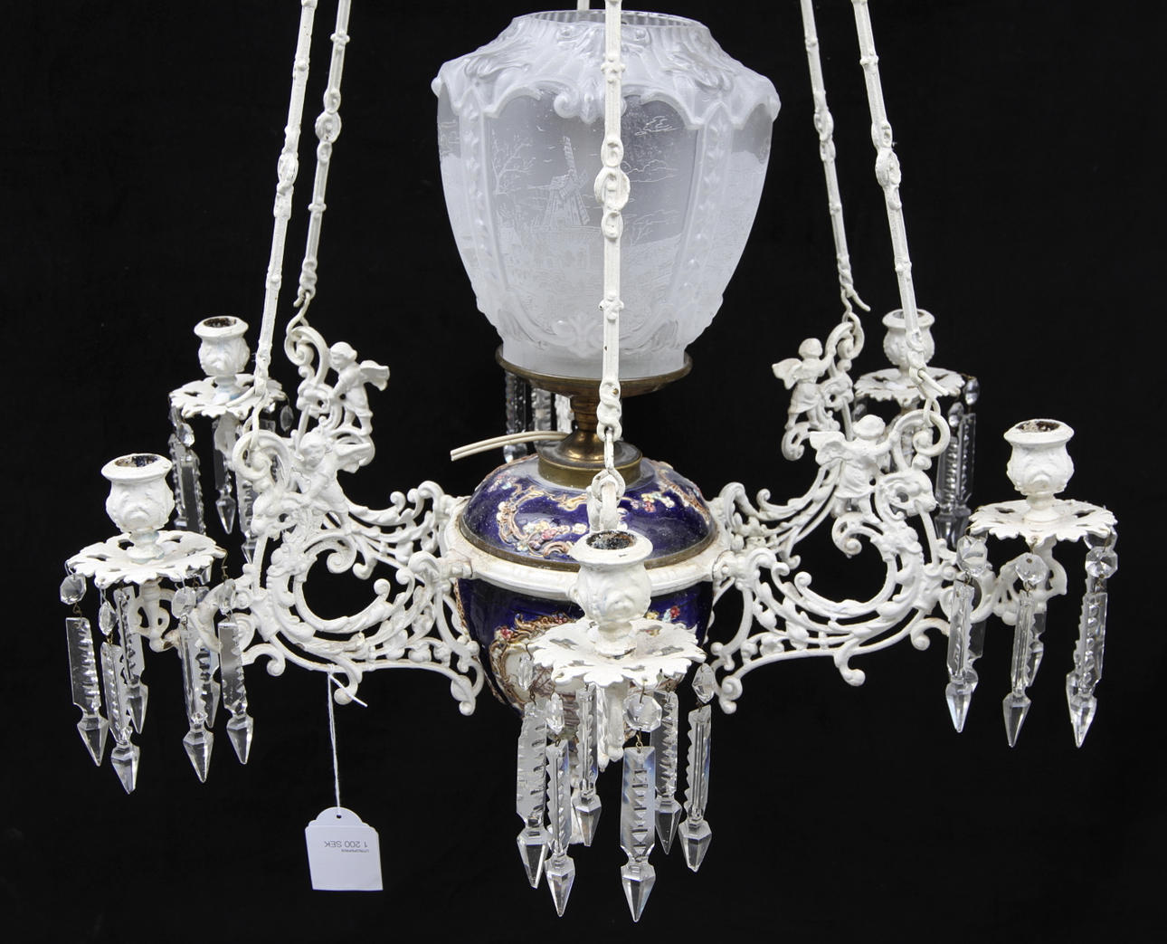 Gjuten vitlackerad stomme med 6 ljusarmar. Diameter 60, höjd 100 cm. Oljehus i majolika ,mörkblå bottenfärg.