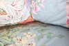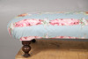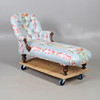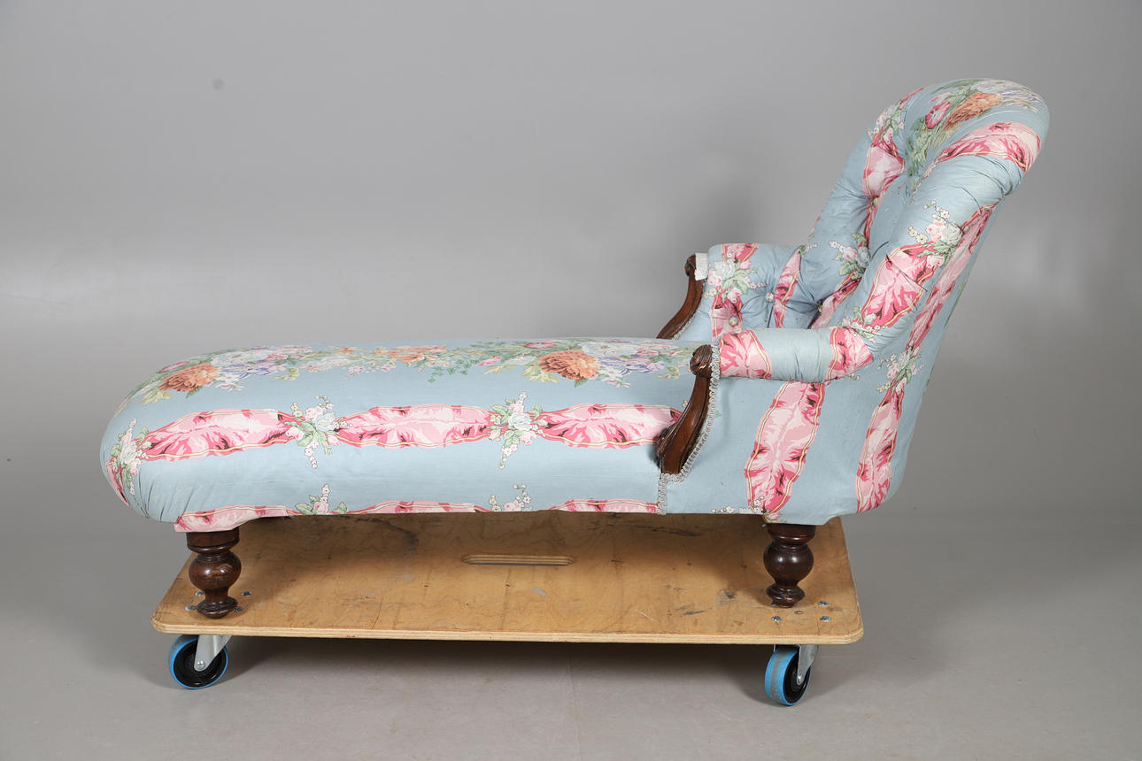 En viktoriansk stolrygg schäslong, med knappstöd och blommiga klädda sittplatser, och upphöjd på mahognyvända fötter. 84 cm (h) x 155 cm (ca. längd) x 71cm (b).