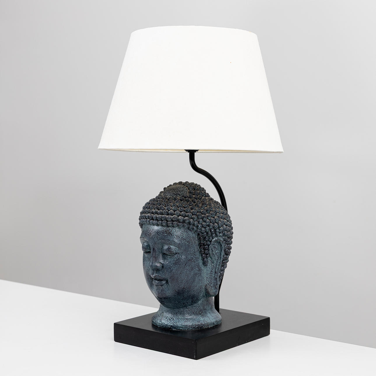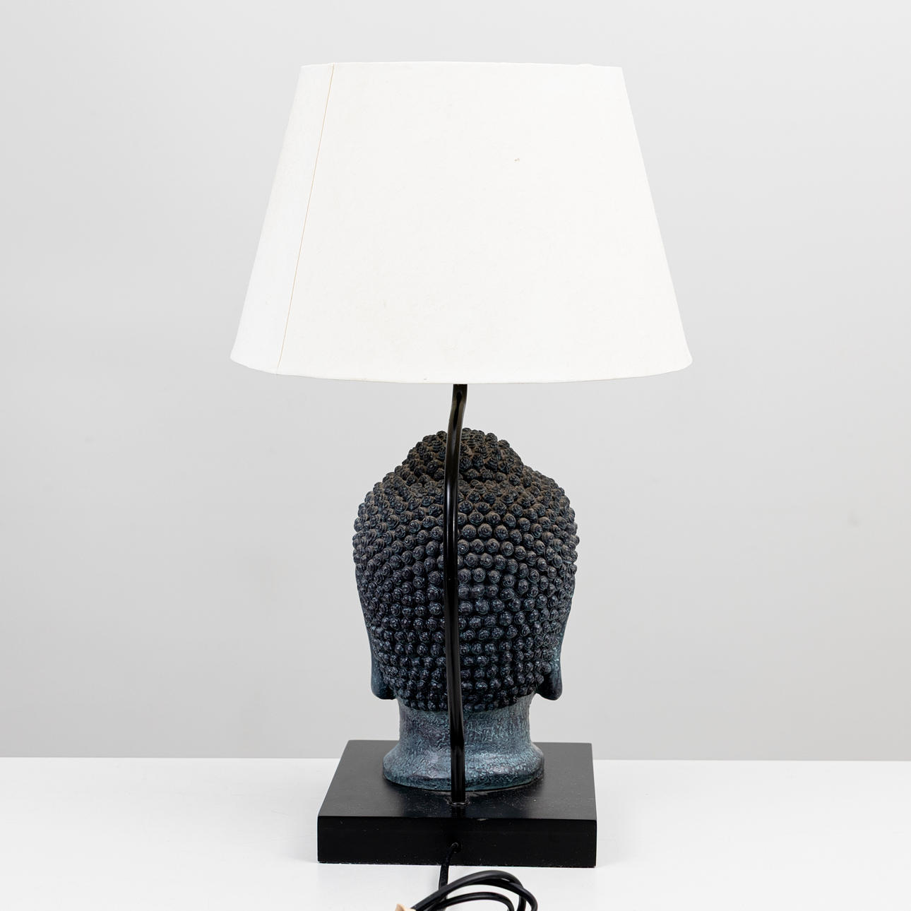 Kompositmaterial, höjd på huvud+sockel ca 27 cm. Lampskärm i vit bomull medföljer.