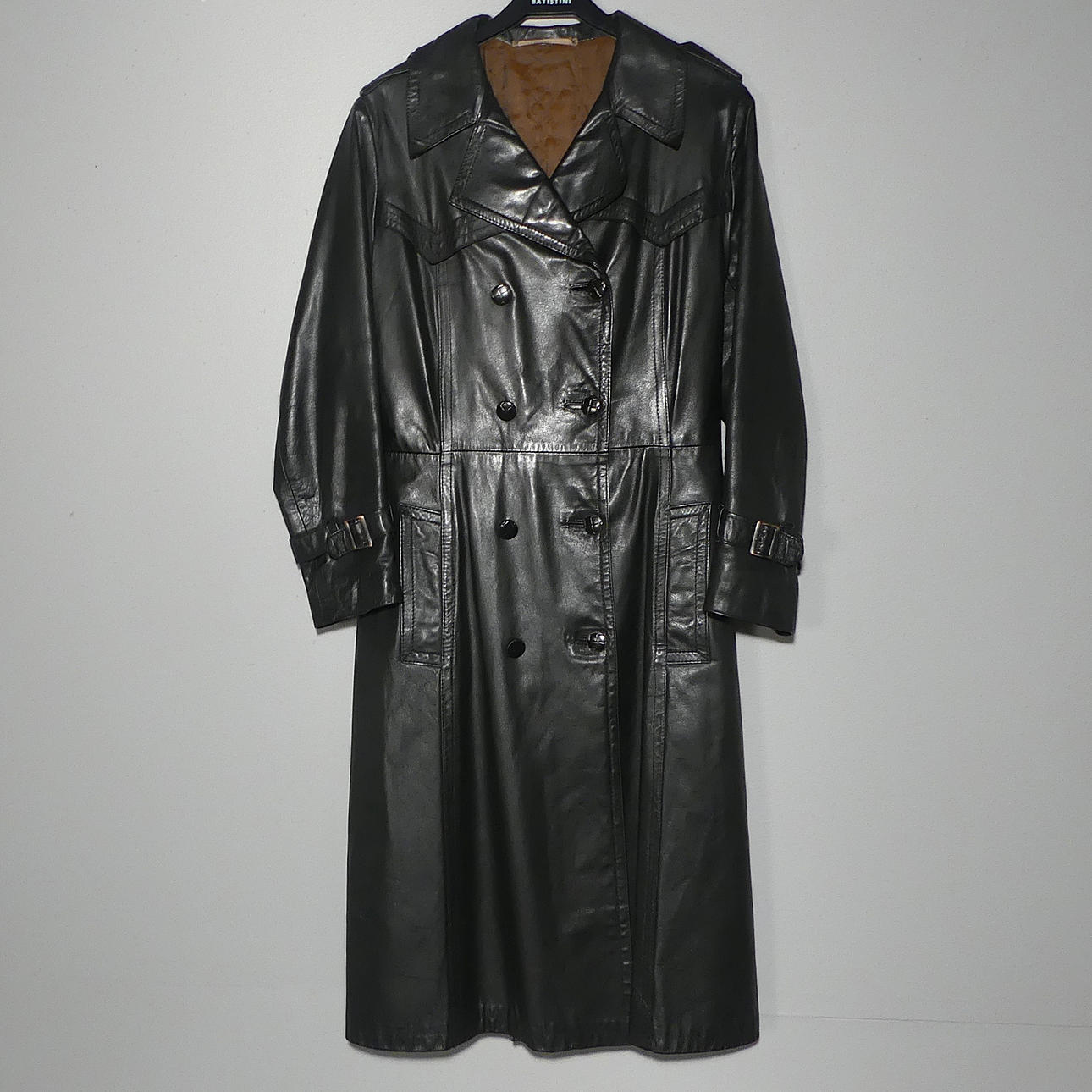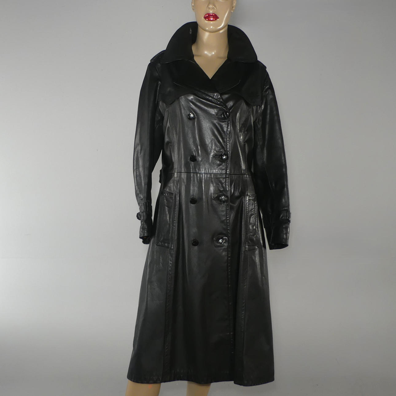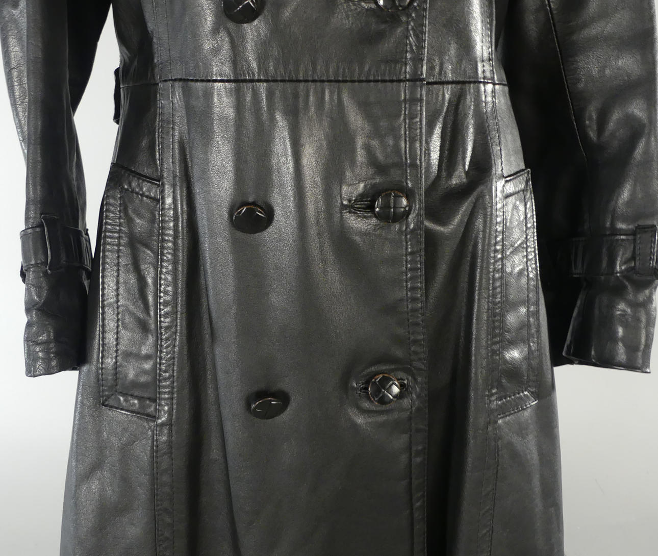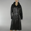 Svart mjukt skinn. Längd 113 cm, ärmlängd 59 / 42 cm, mått under armhåla 49 cm