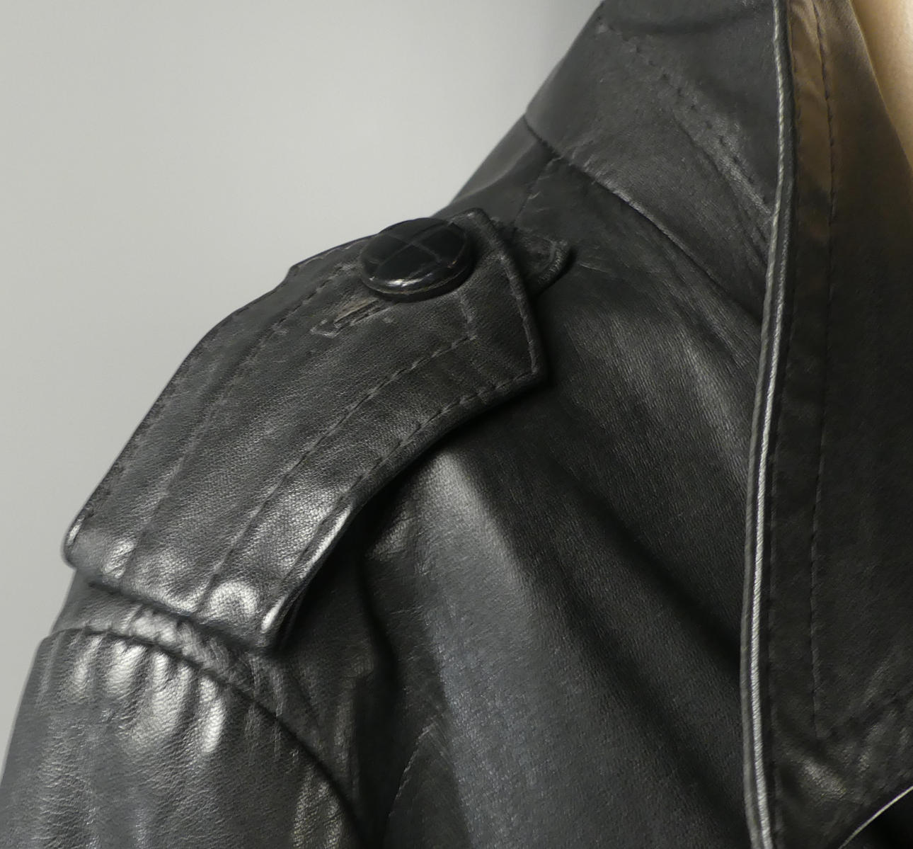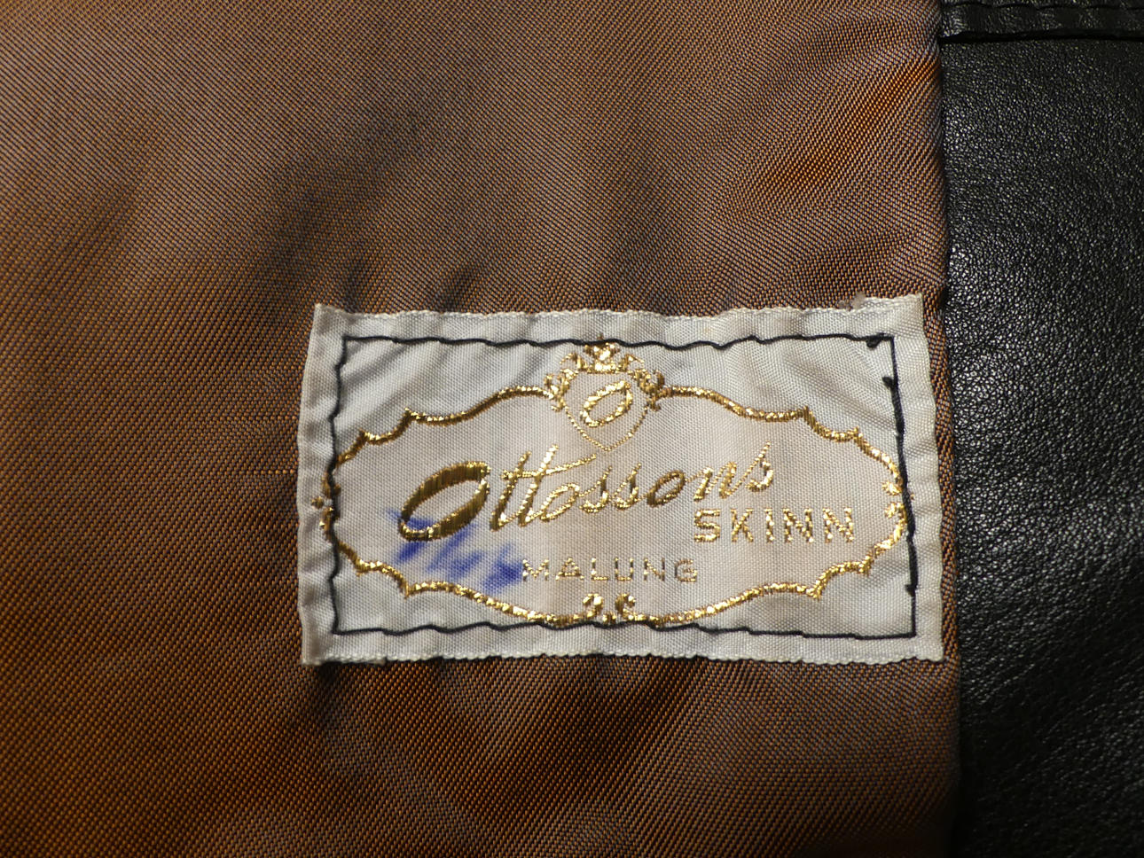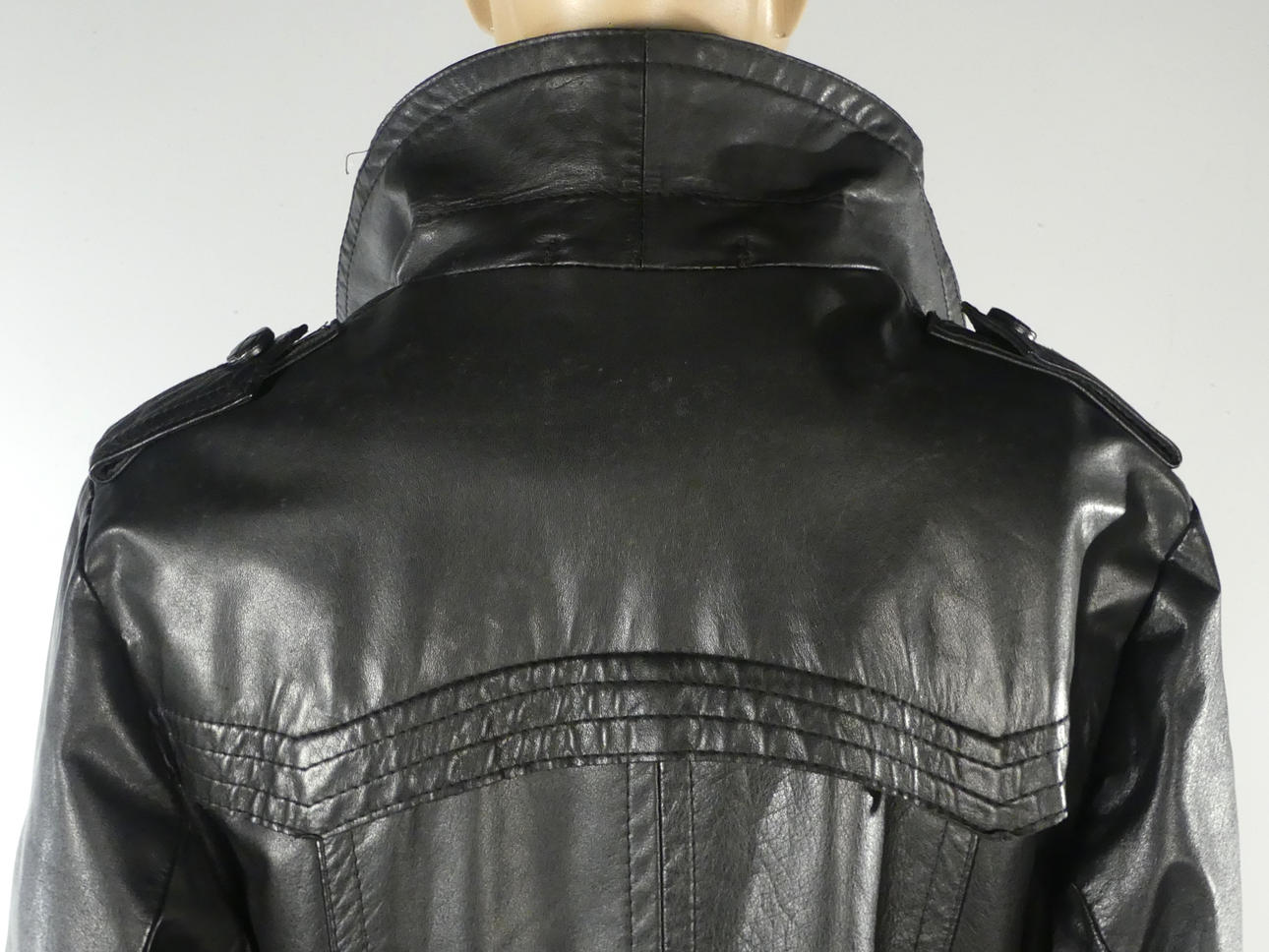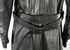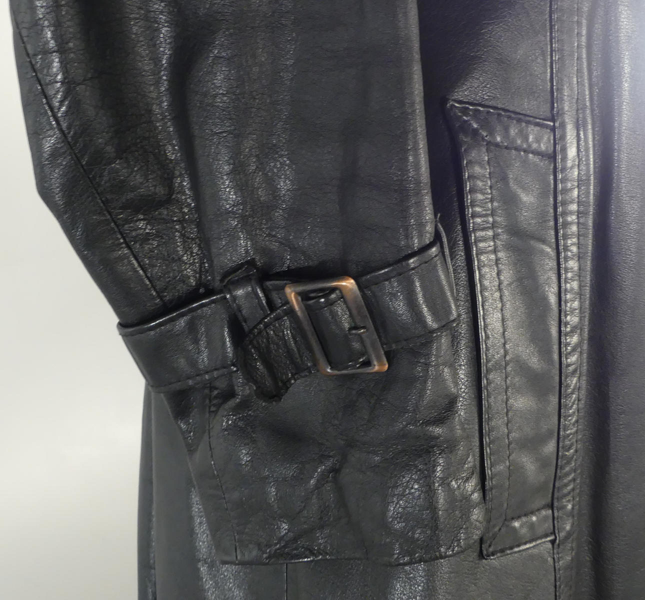 Svart mjukt skinn. Längd 113 cm, ärmlängd 59 / 42 cm, mått under armhåla 49 cm