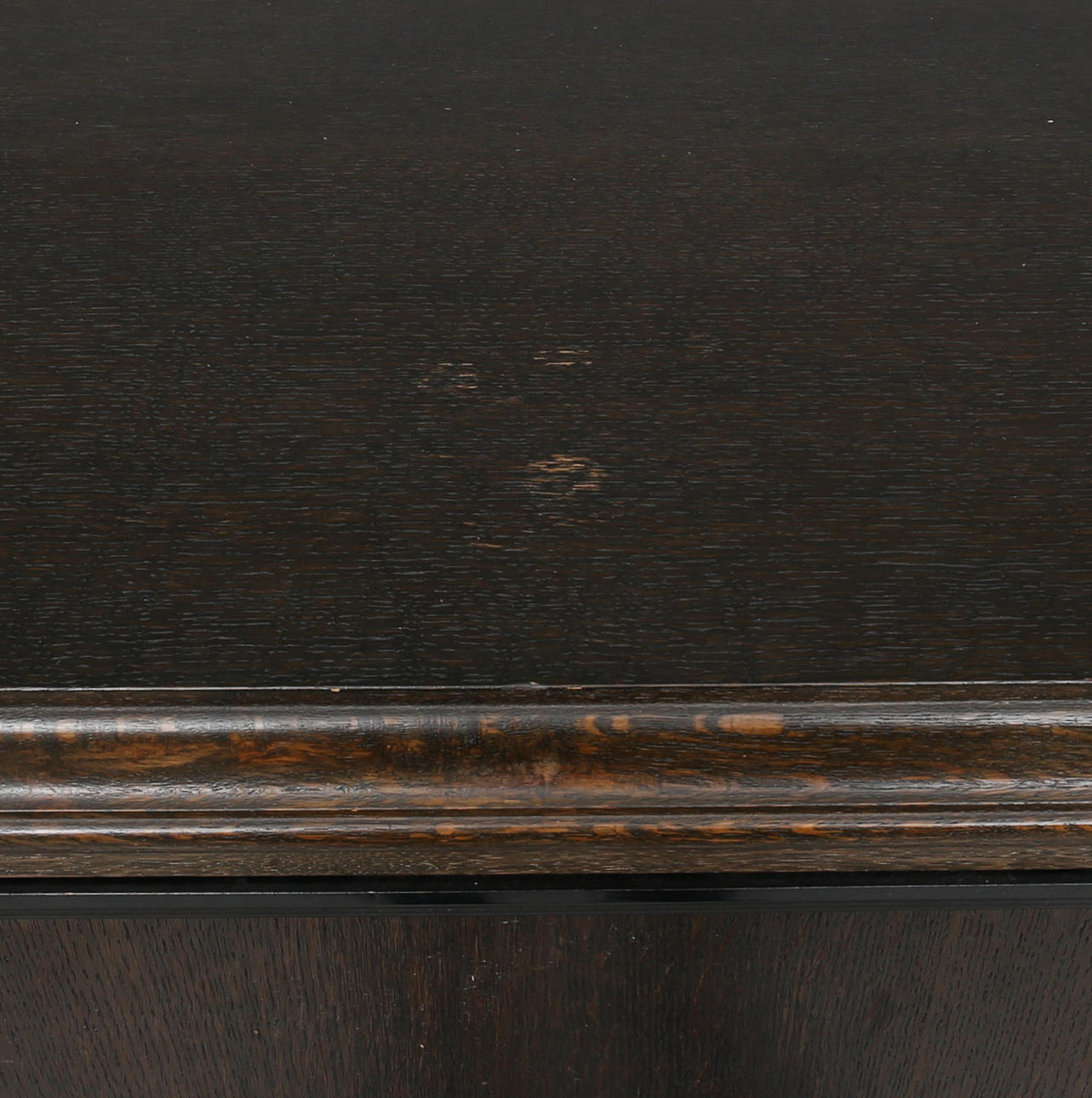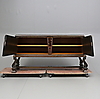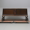 Fanerat med ek. Dekor av intarsia. Två dörrar med bakomliggande hyllplan. Längd 202. Bredd 57. Höjd 100 cm.