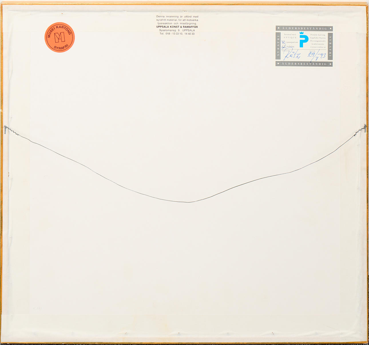 Ej examinerad ur ram. Gulnad. Något vågigt papper. Rammått: 44,5 x 48,5 cm.