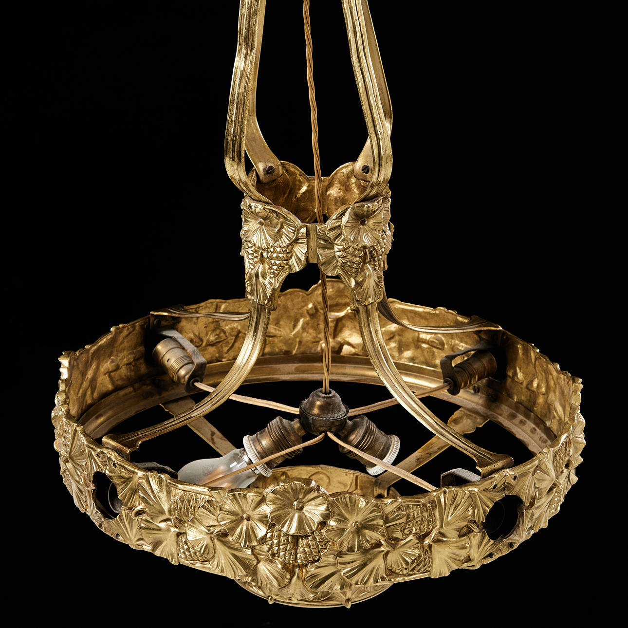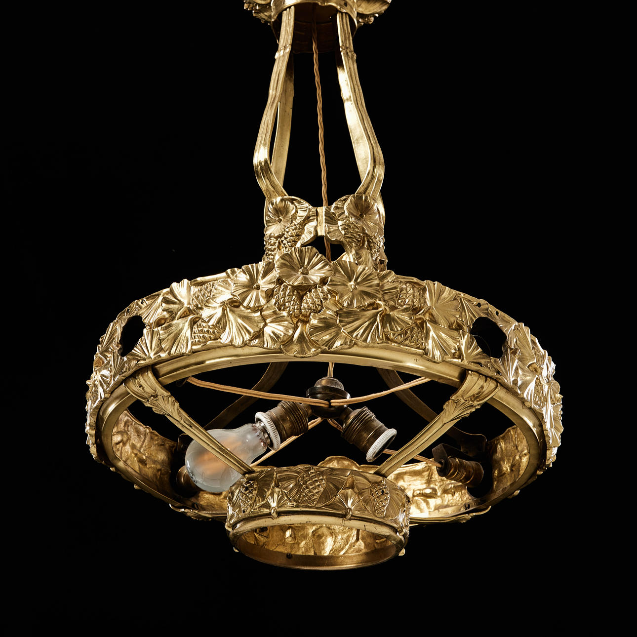 Förgylld metall, dekor i relief, höjd ca 69, diameter 48 cm.