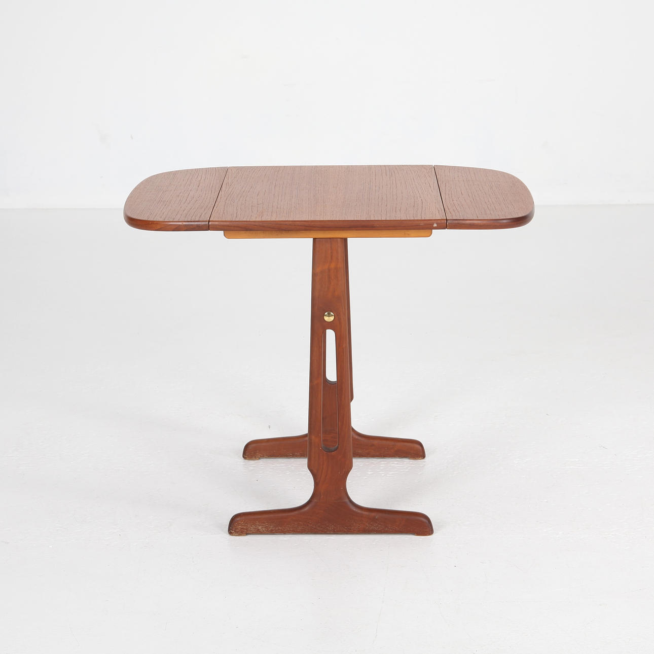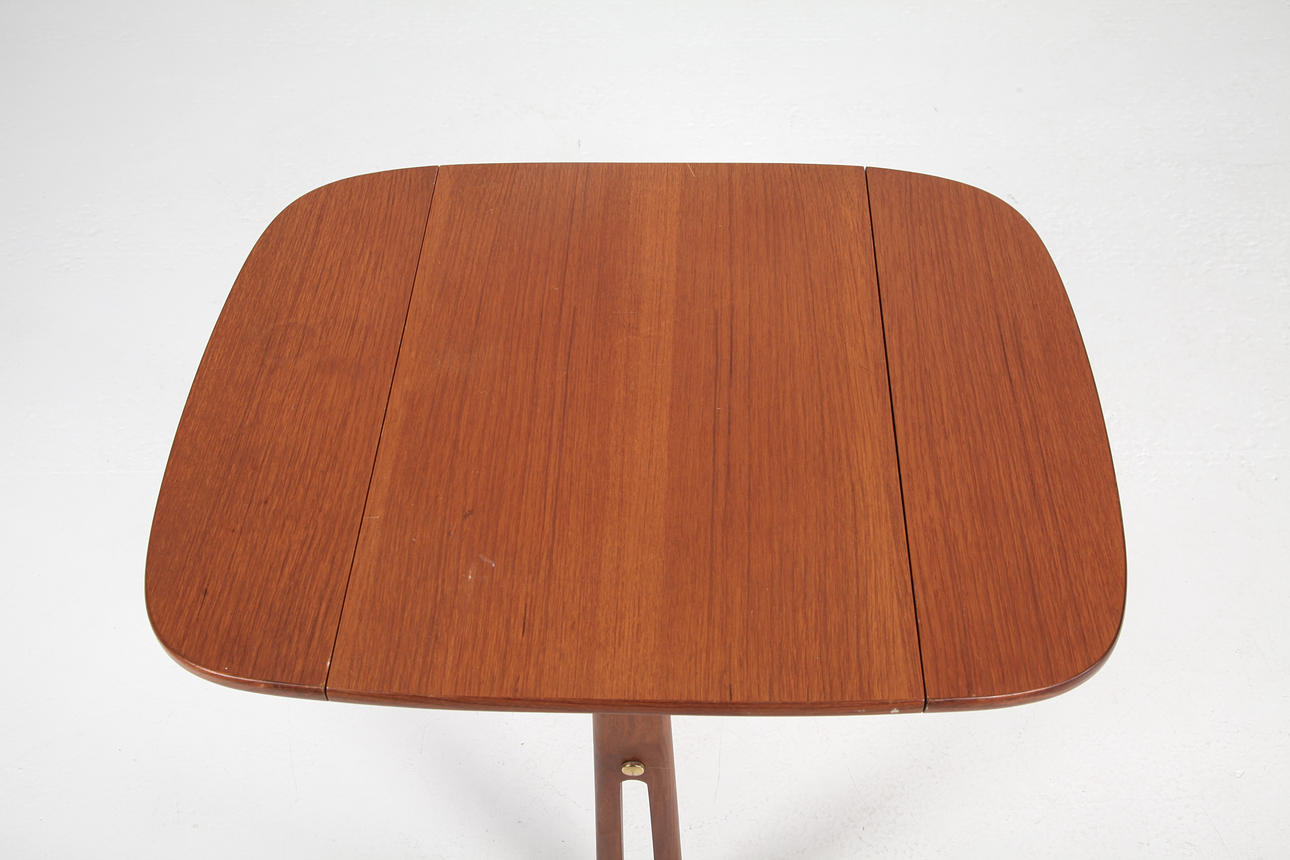 Litet bord med klaffar. Delvis massiv teak. Höjd ca 55 cm Skivans mått utfälld 68 x 55 cm.